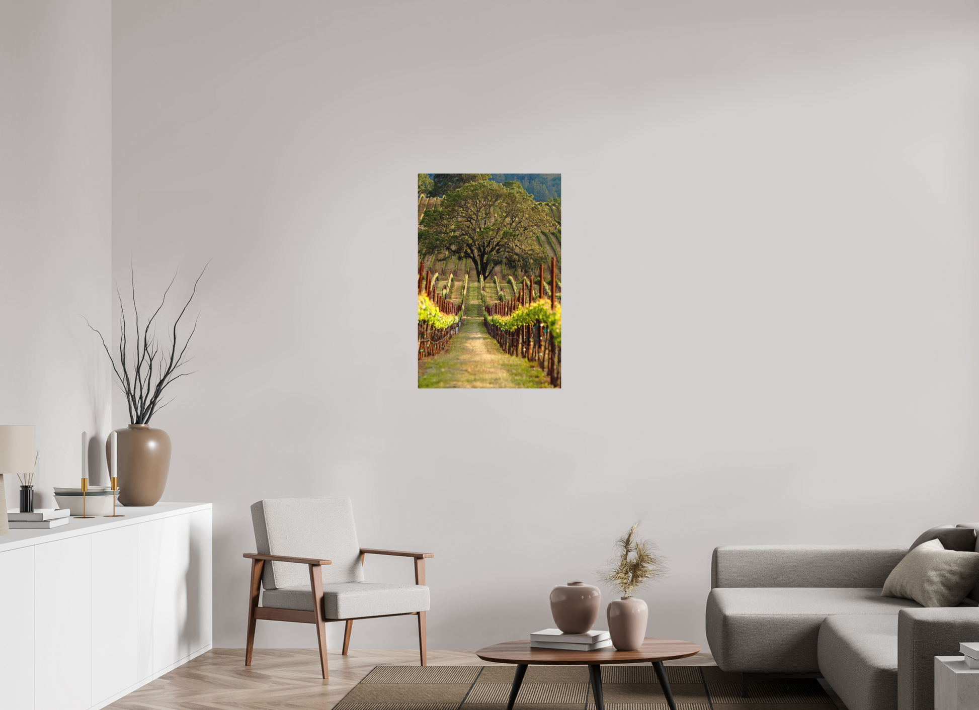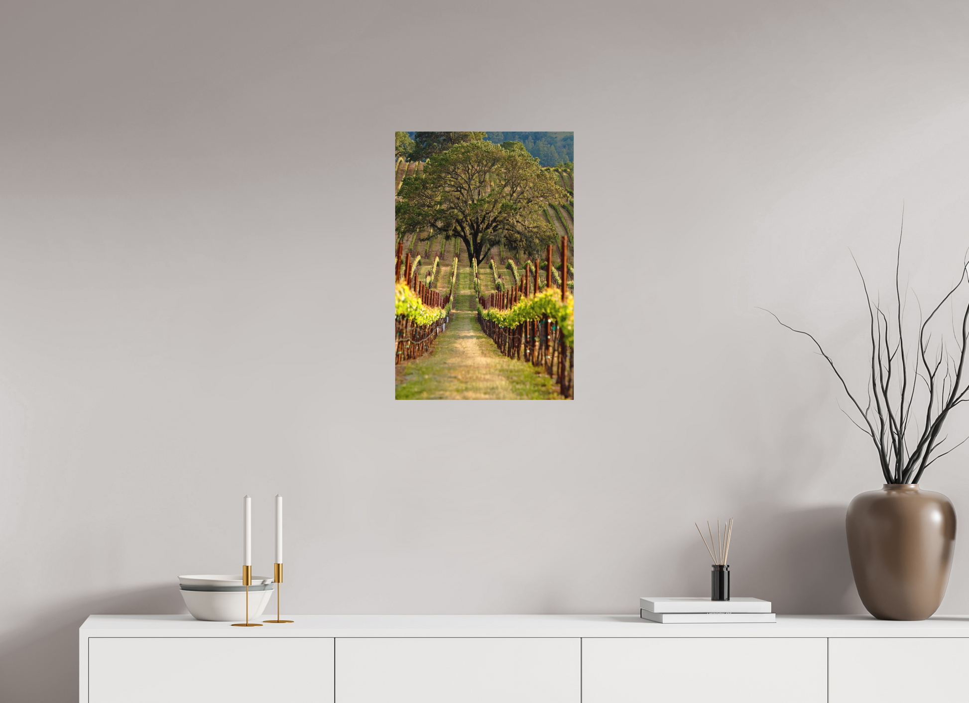 Step into the quiet beauty of a spring afternoon in Alexander Valley. This photograph captures the timeless rhythm of vineyard rows leading your eye—and your senses—straight to the majestic oak tree standing watch at the heart of the scene.