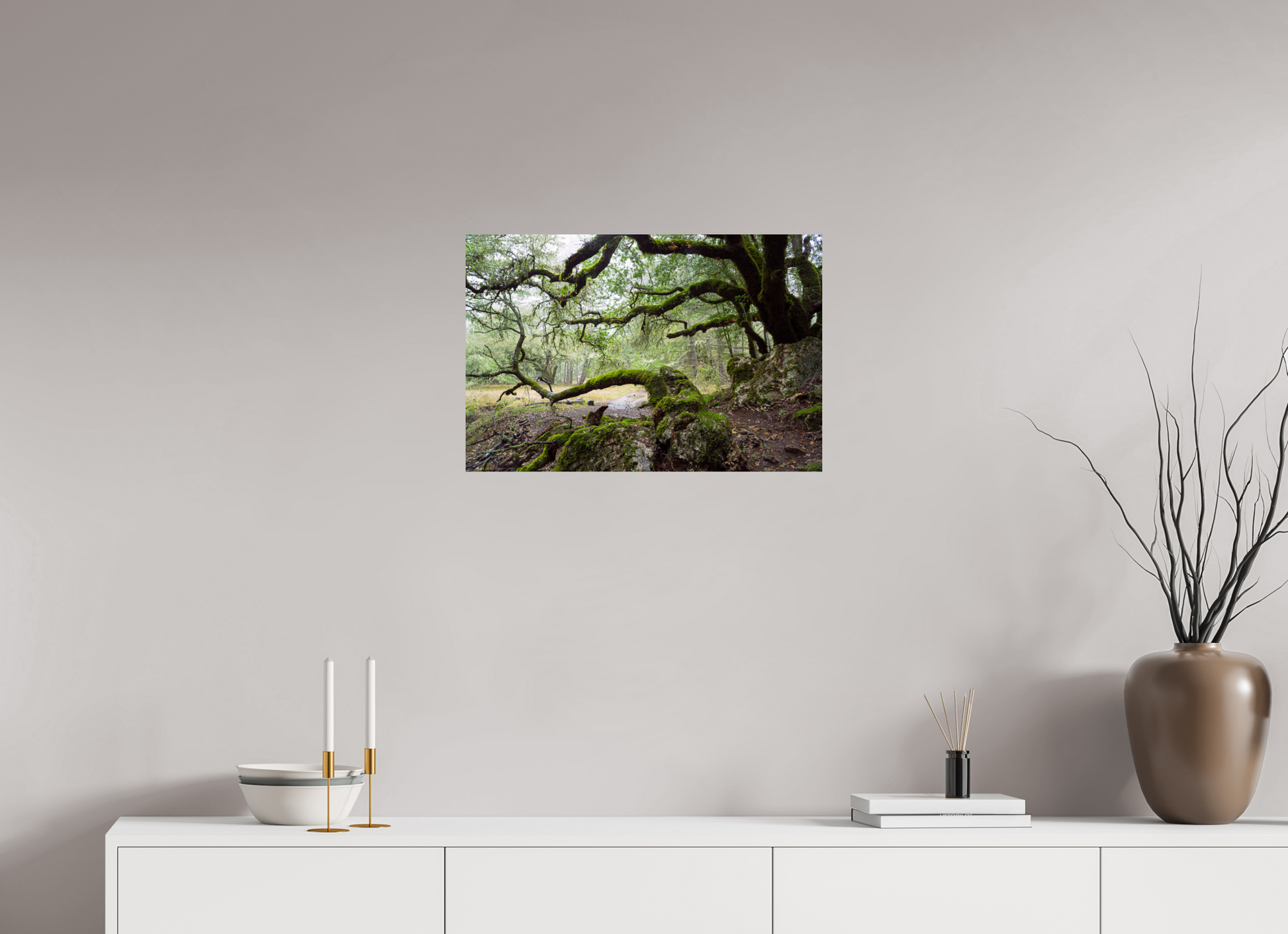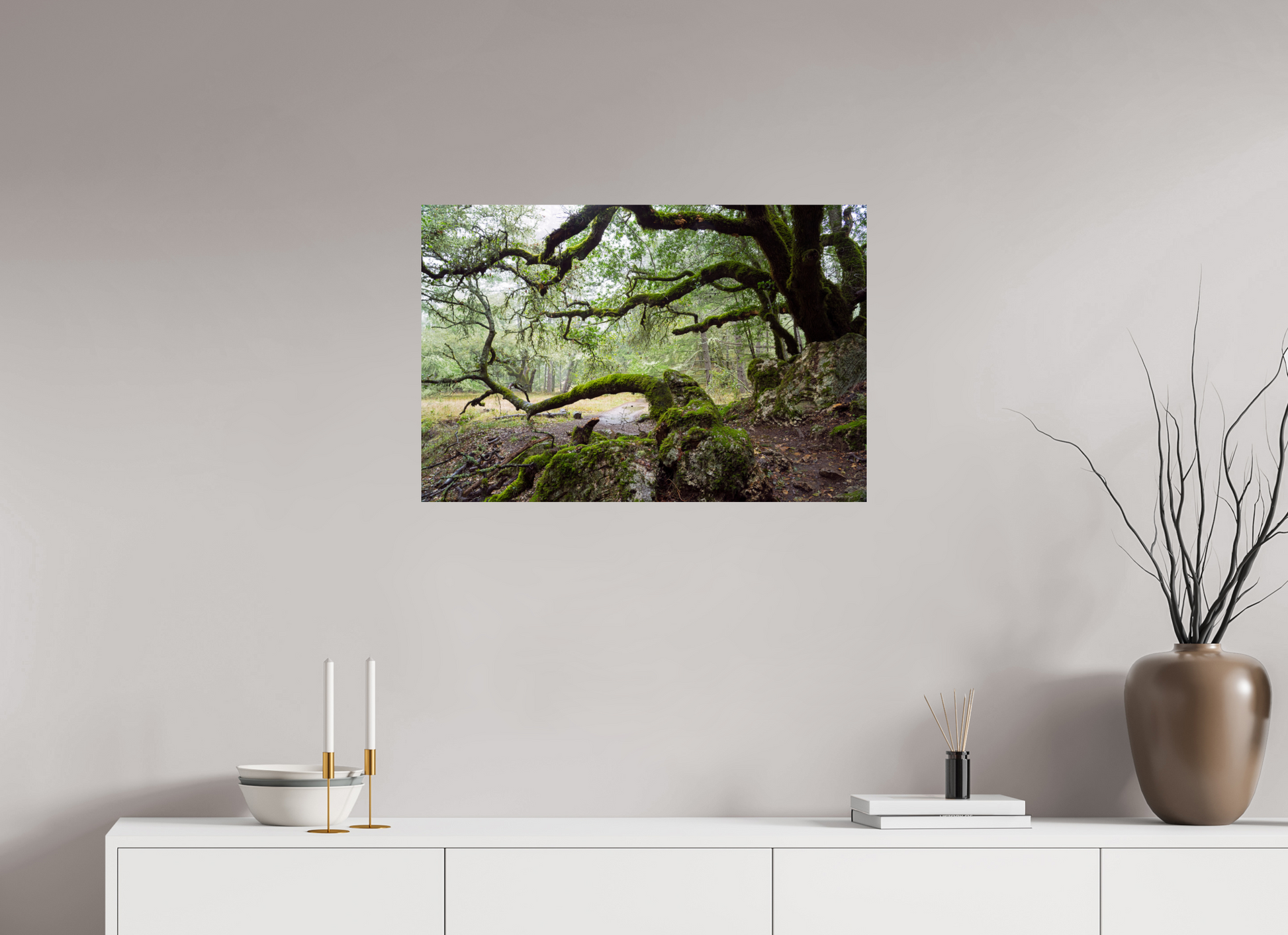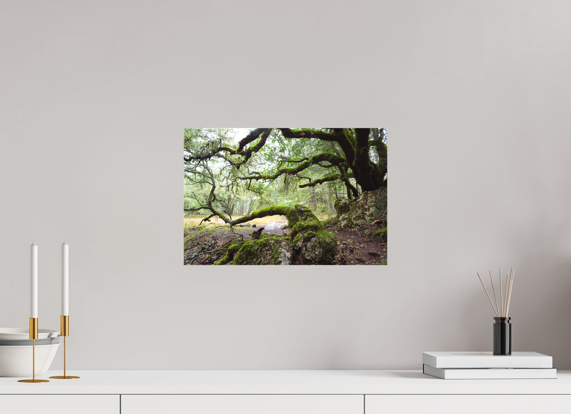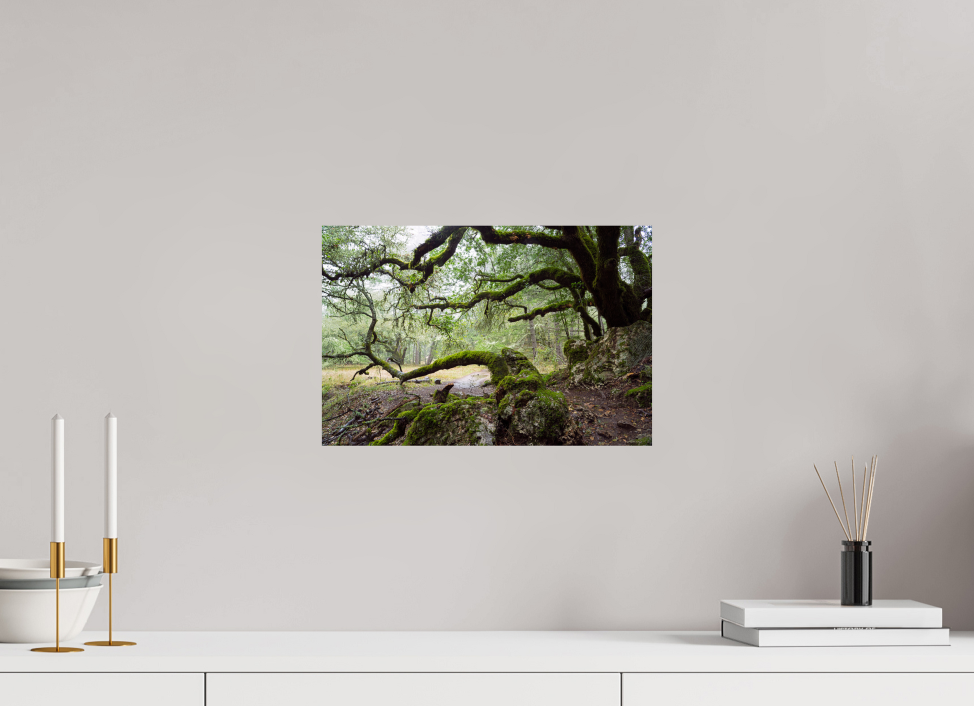 On a stormy winter day near the summit of Mt. Tamalpais, the forest breathes under the weight of rain. The moss-laden branches stretch wide and low, sheltering a narrow path that winds through rock and shadow. This fine art photograph captures a fleeting moment of quiet and endurance — a timeless scene to bring calm and depth to your space.