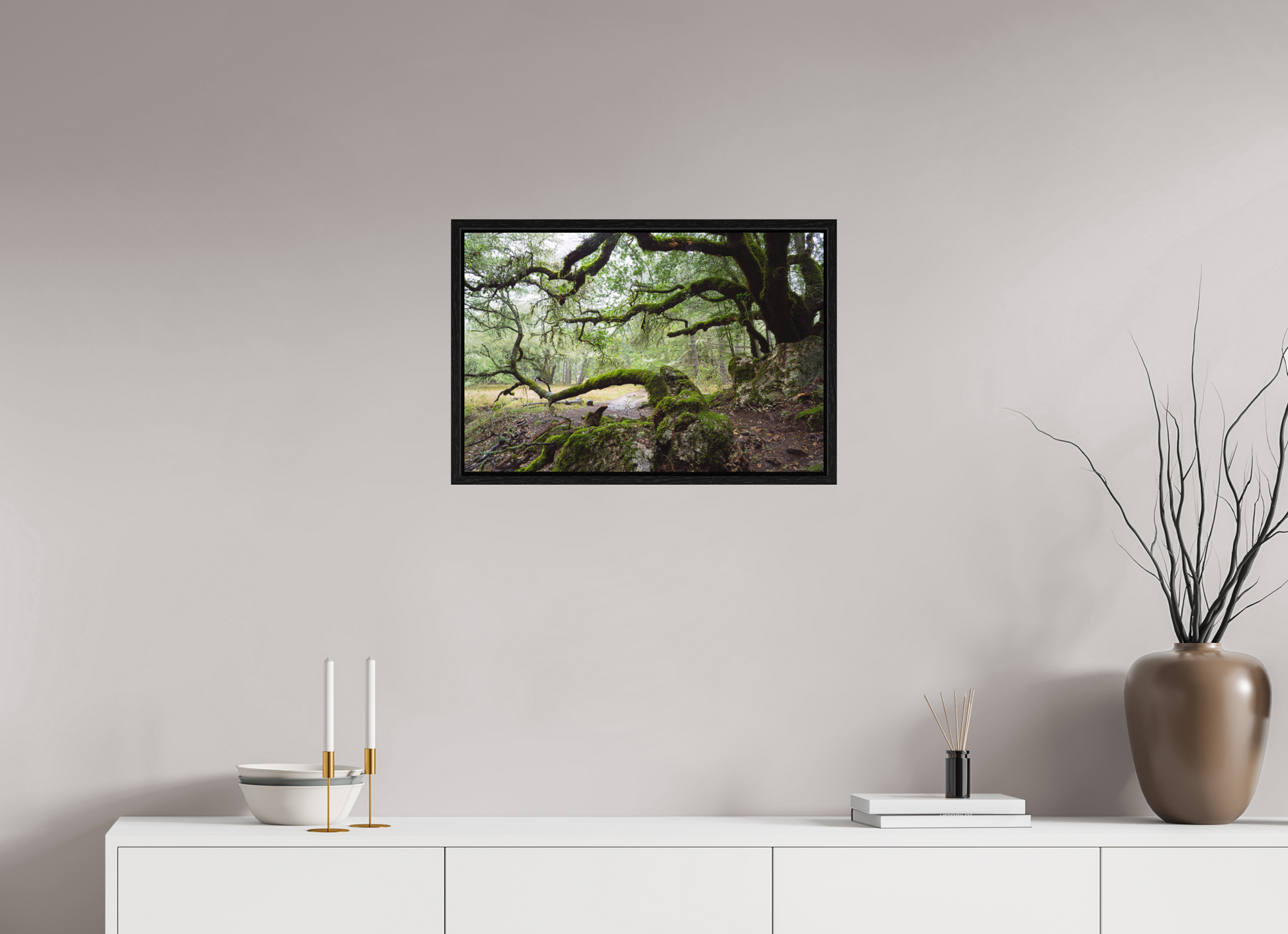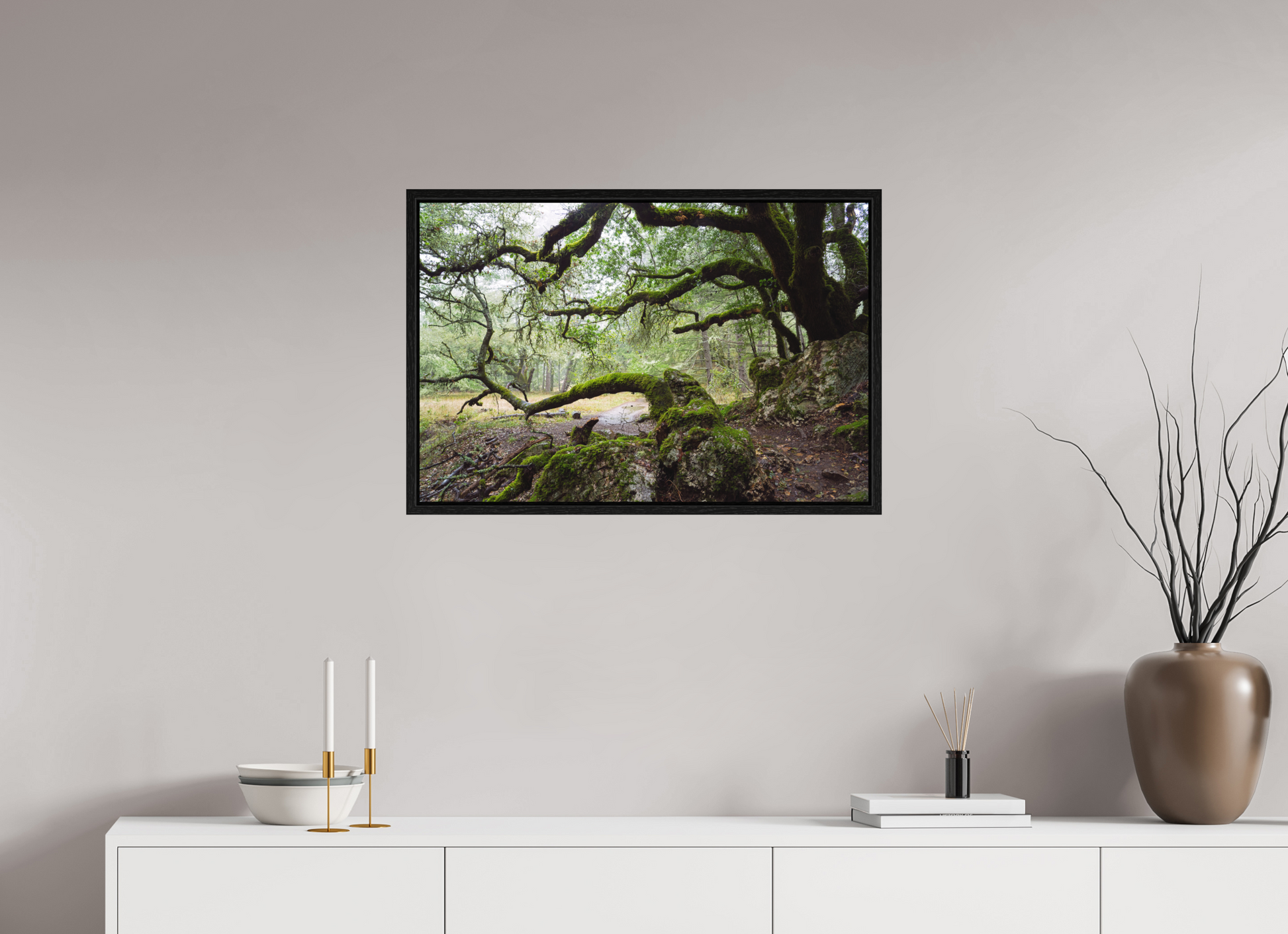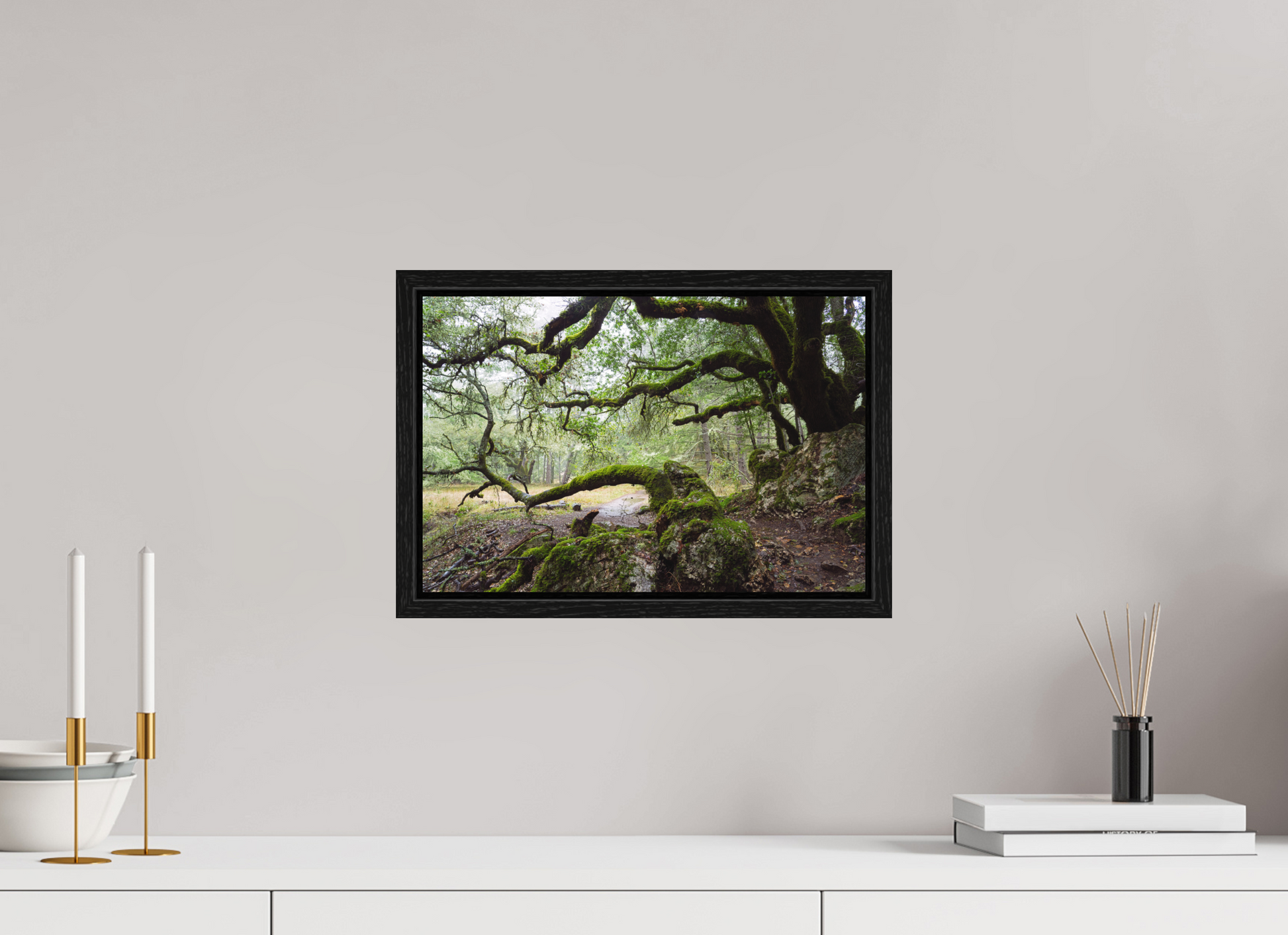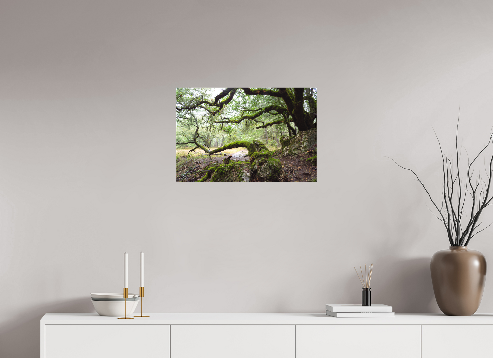 On a stormy winter day near the summit of Mt. Tamalpais, the forest breathes under the weight of rain. The moss-laden branches stretch wide and low, sheltering a narrow path that winds through rock and shadow. This fine art photograph captures a fleeting moment of quiet and endurance — a timeless scene to bring calm and depth to your space.