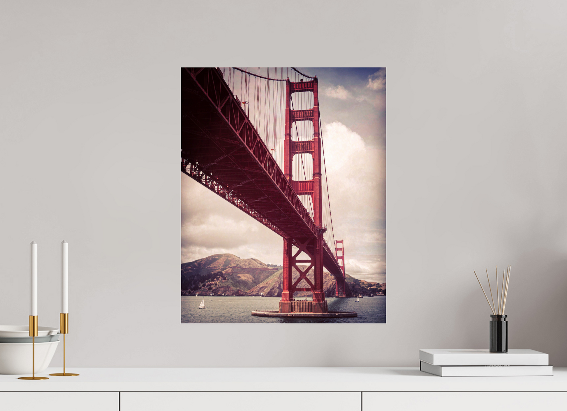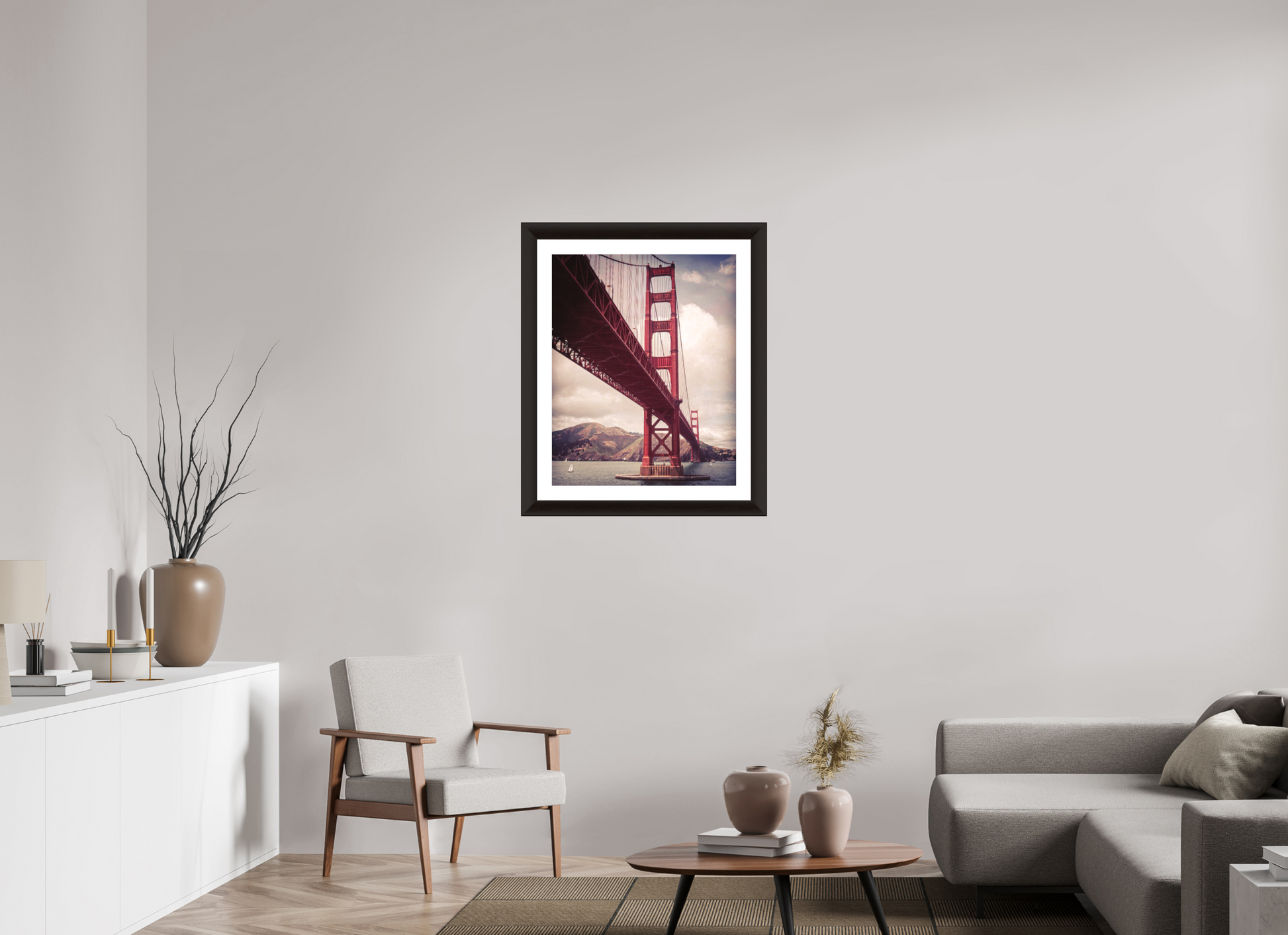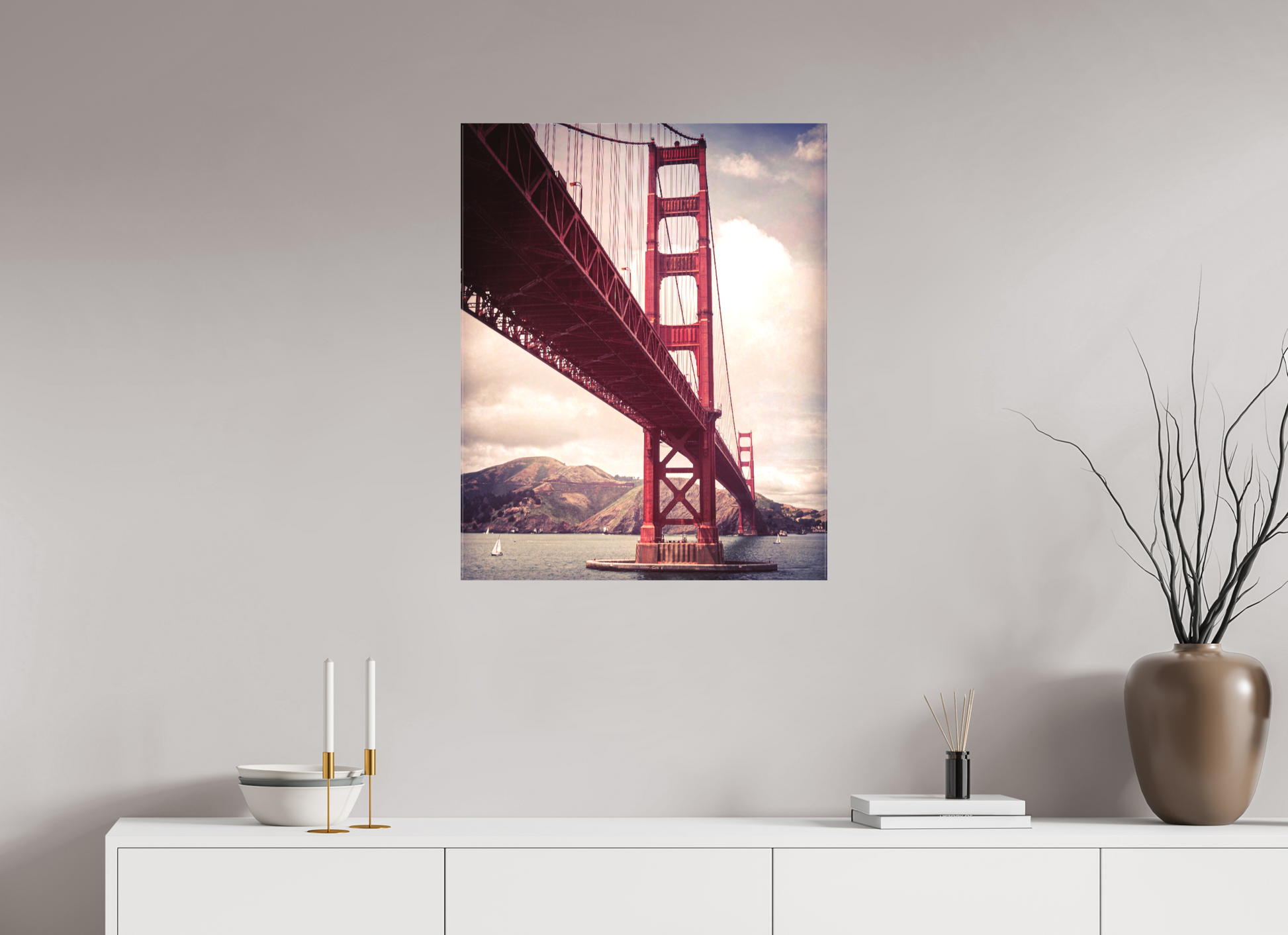 This photograph of the Golden Gate Bridge was taken from Fort Point, capturing the towering span from beneath as it reaches across the bay. The image has been thoughtfully modified with added texture and subtle vignetting to evoke the look and feel of a classic color photograph from the 1940s. The result is both timeless and nostalgic—an homage to the era when the bridge was still new, and the world saw it as a symbol of boldness and possibility.
