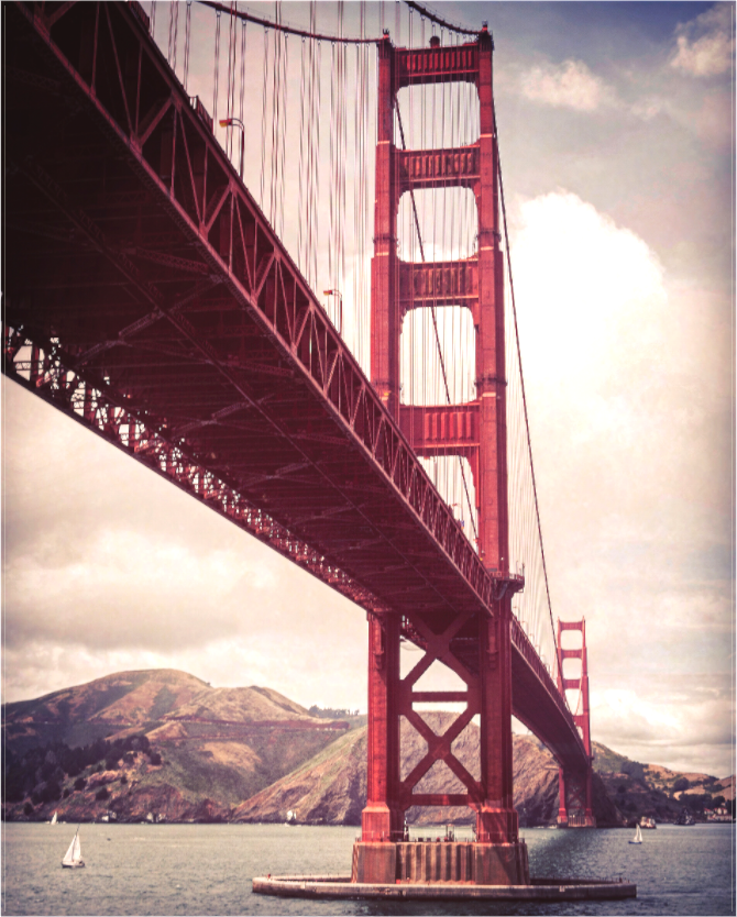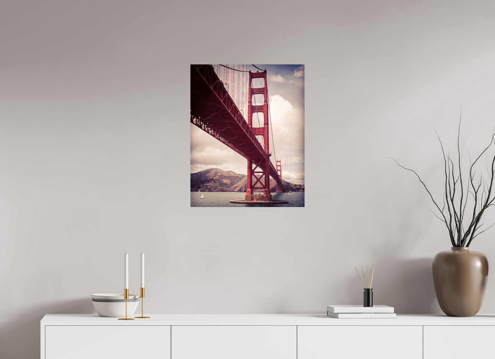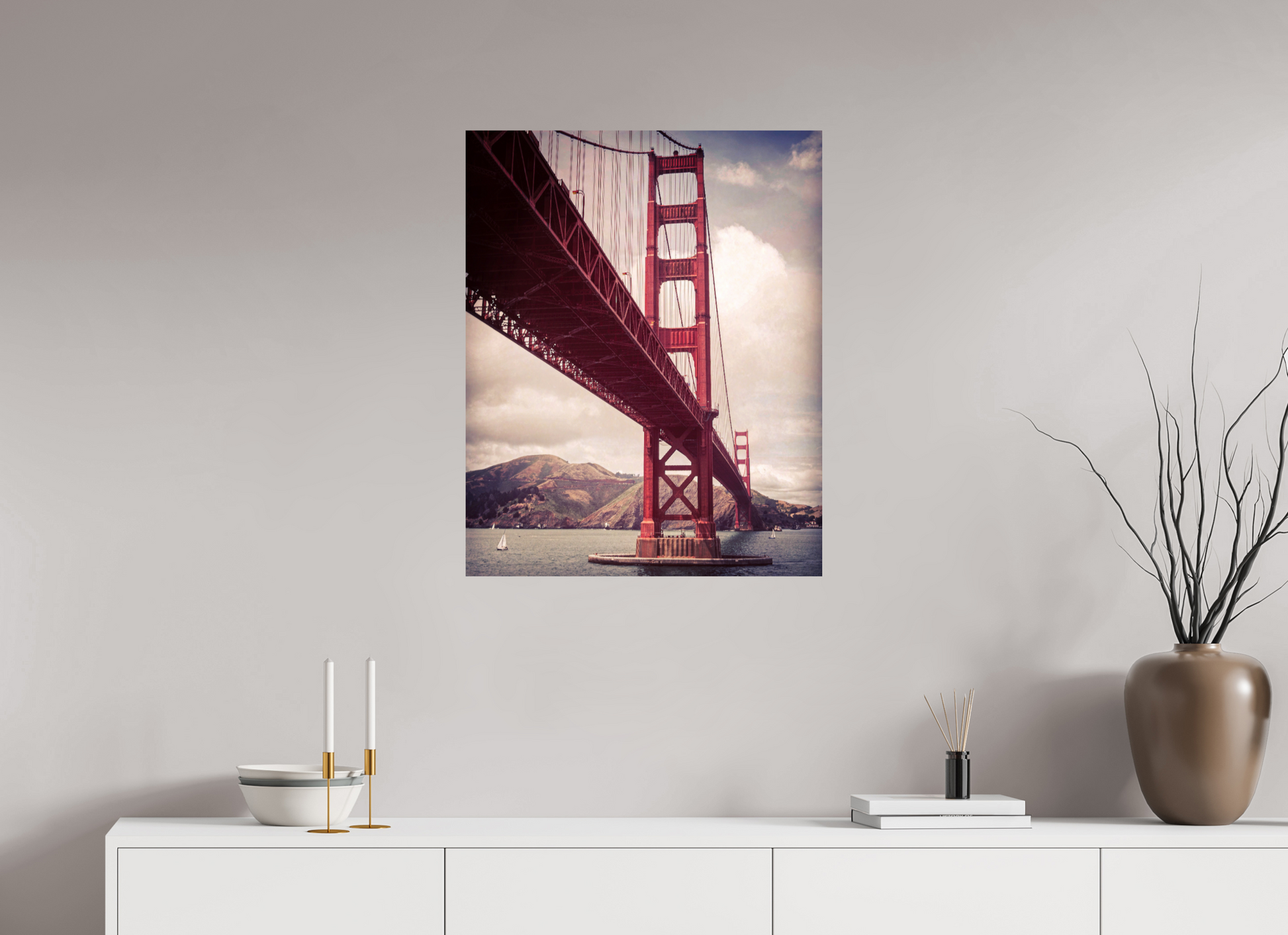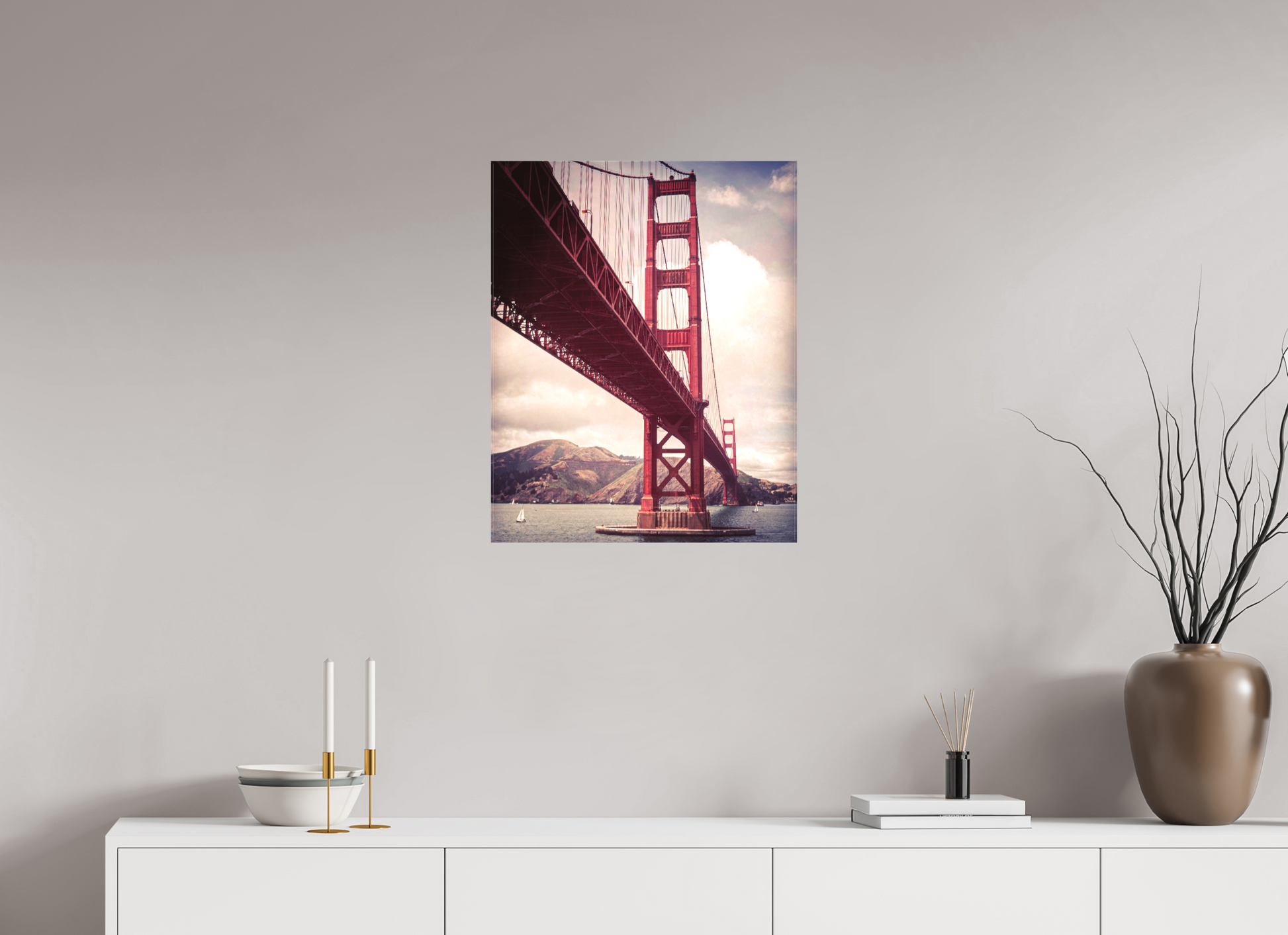 This photograph of the Golden Gate Bridge was taken from Fort Point, capturing the towering span from beneath as it reaches across the bay. The image has been thoughtfully modified with added texture and subtle vignetting to evoke the look and feel of a classic color photograph from the 1940s. The result is both timeless and nostalgic—an homage to the era when the bridge was still new, and the world saw it as a symbol of boldness and possibility.