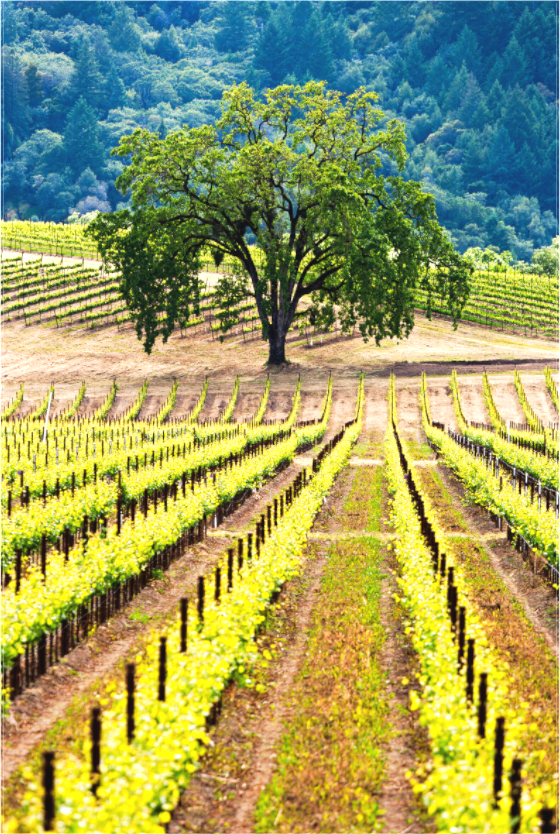 Captured during the height of the season, this photograph celebrates nature’s renewal through a rich tapestry of greens—from the tender shoots in the vineyard rows to the deep, shadowed hues of the forest beyond.