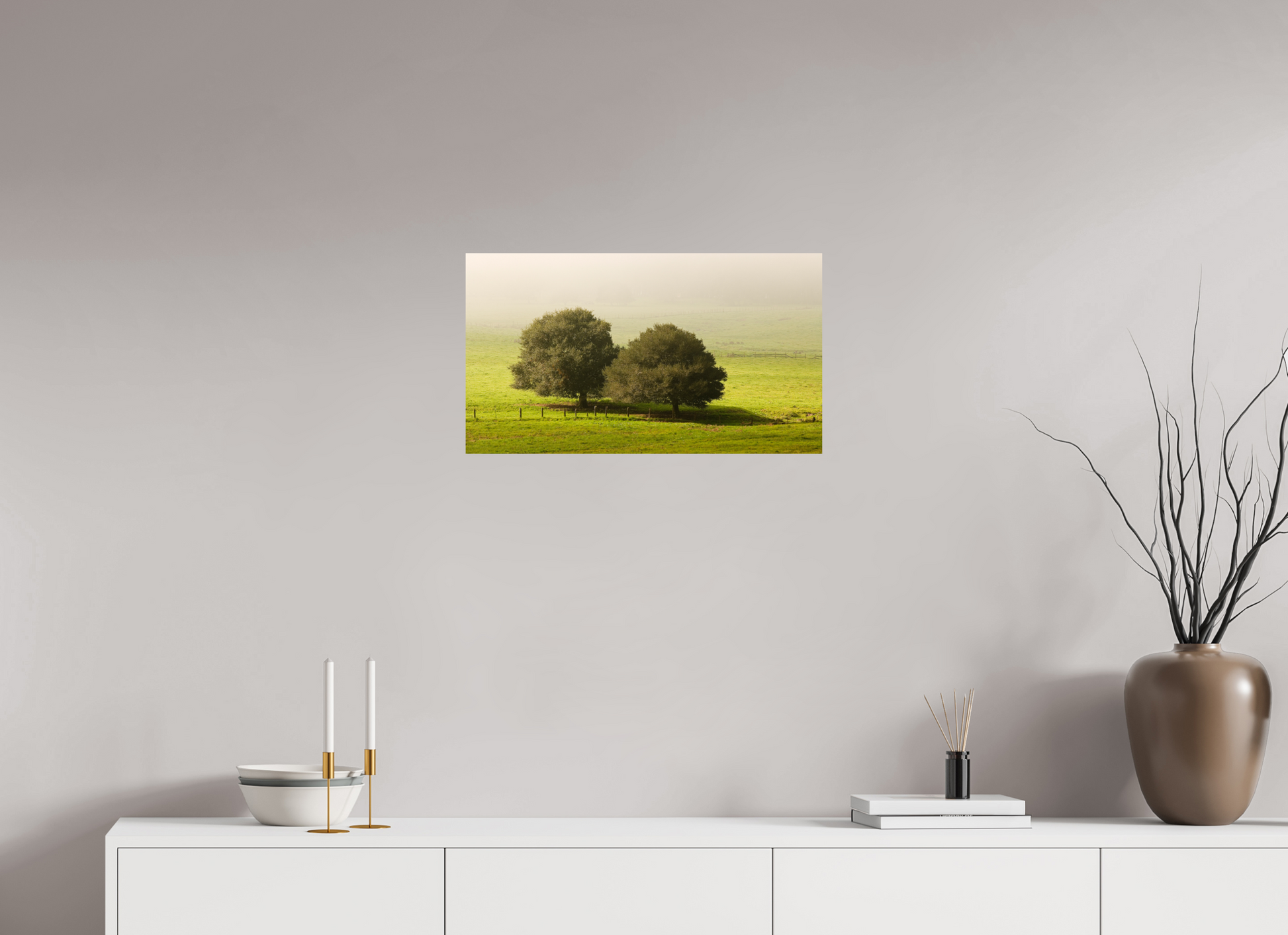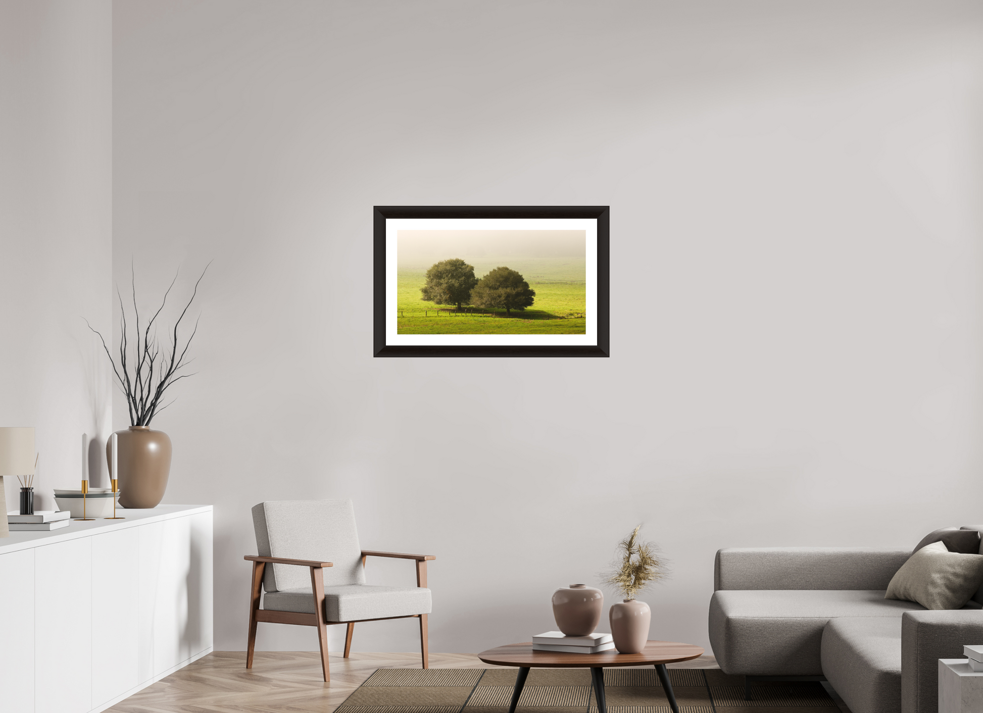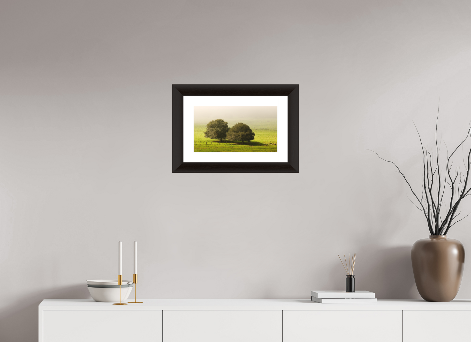 Taken on a quiet winter morning just north of Petaluma in Sonoma County, this fine art photograph captures the peaceful stillness of the season. Two old oaks stand side by side in an open pasture, their forms dark and grounded against a veil of soft morning fog. The grass is lush with winter green, and the air holds the hush of a world not yet fully awake.