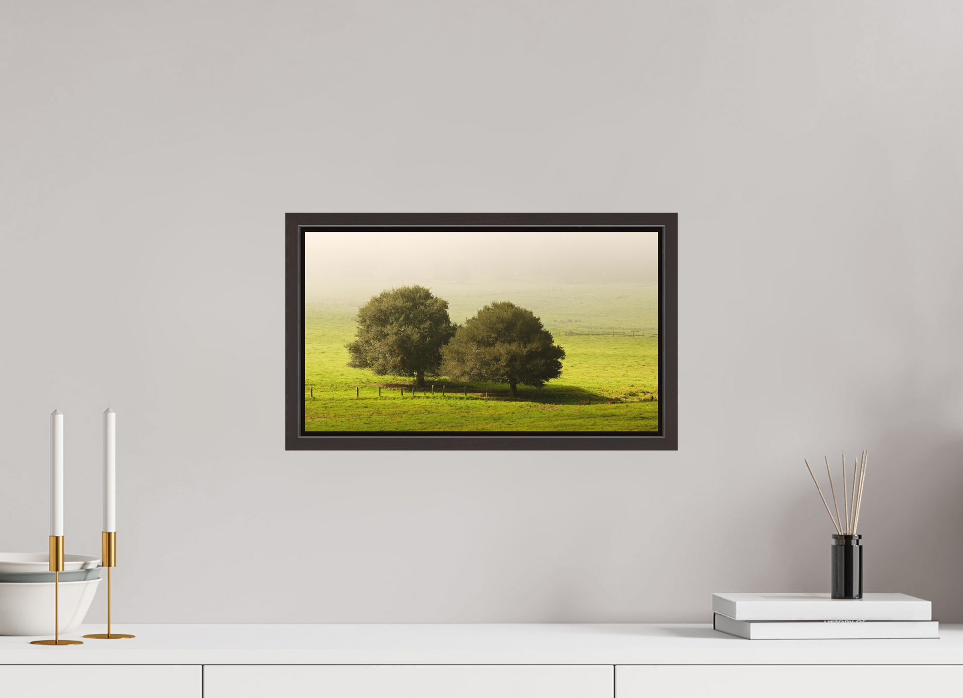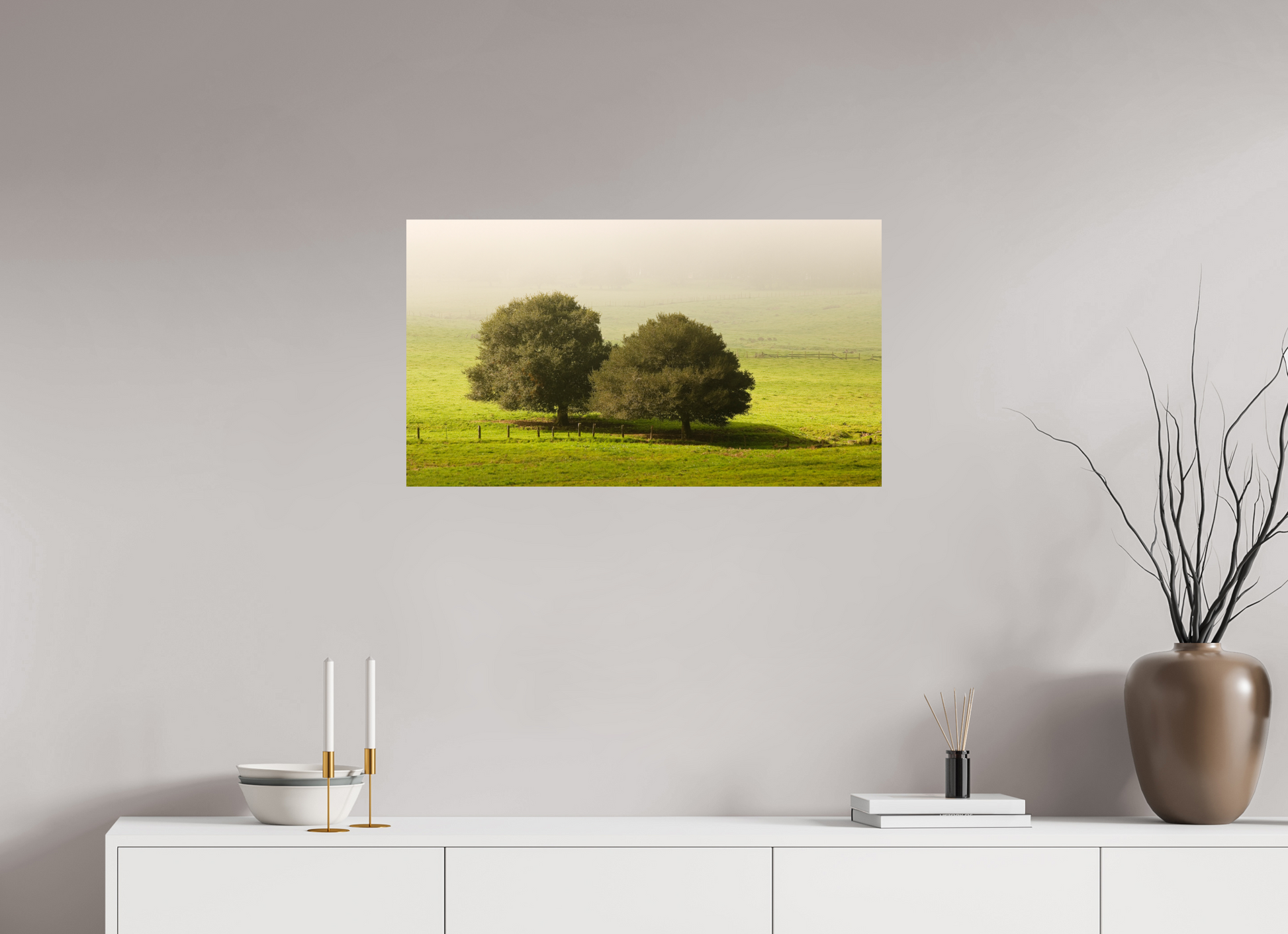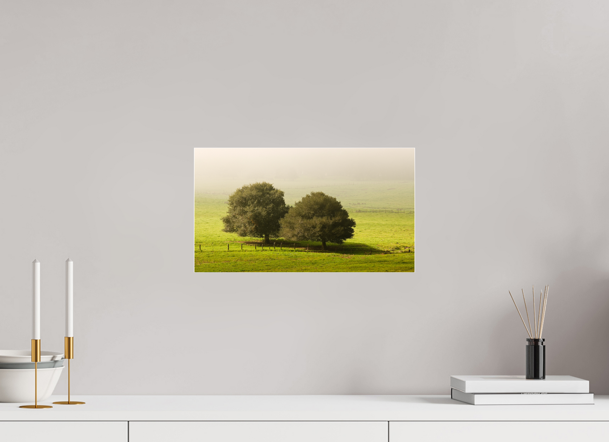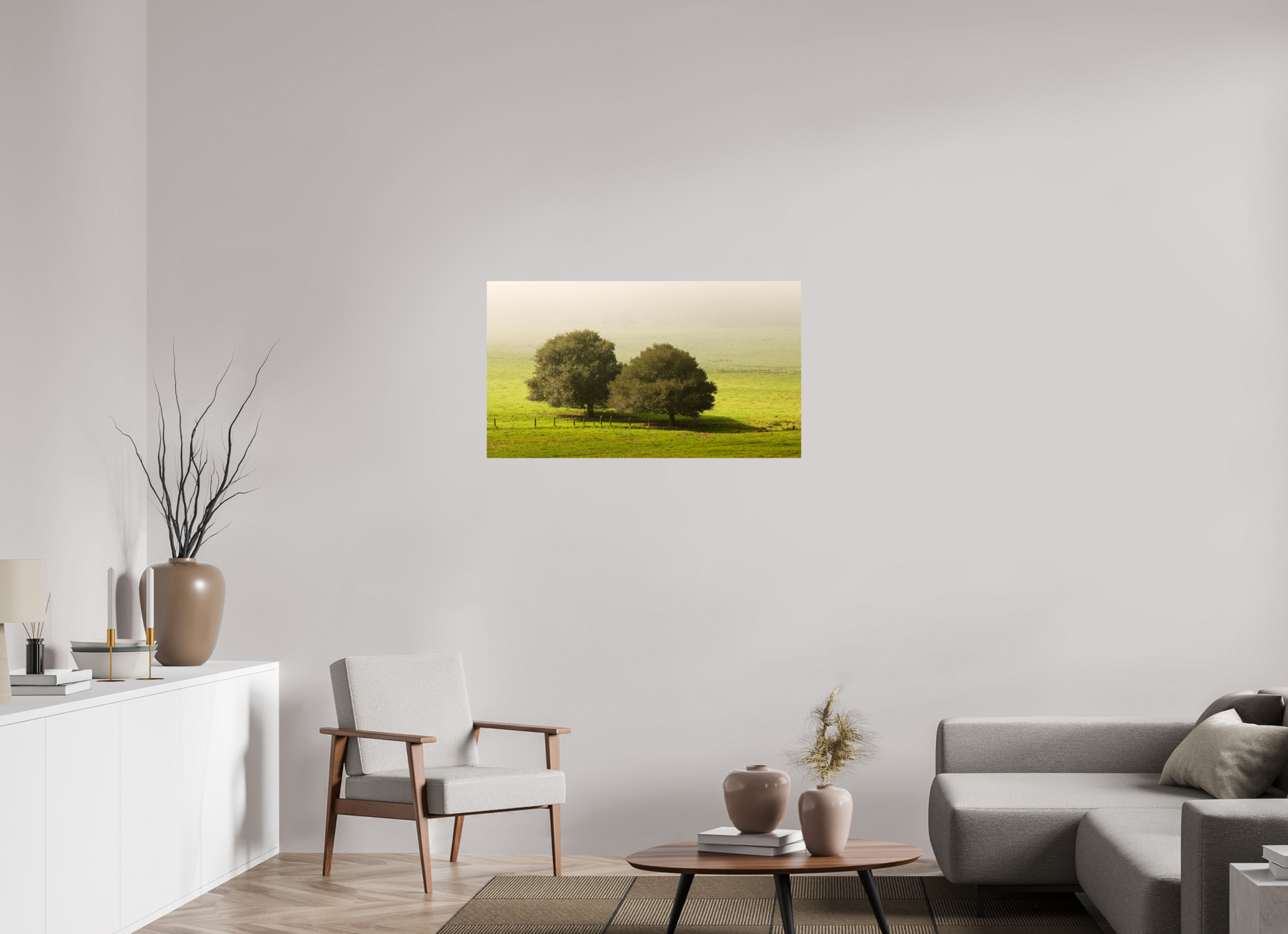 Taken on a quiet winter morning just north of Petaluma in Sonoma County, this fine art photograph captures the peaceful stillness of the season. Two old oaks stand side by side in an open pasture, their forms dark and grounded against a veil of soft morning fog. The grass is lush with winter green, and the air holds the hush of a world not yet fully awake.