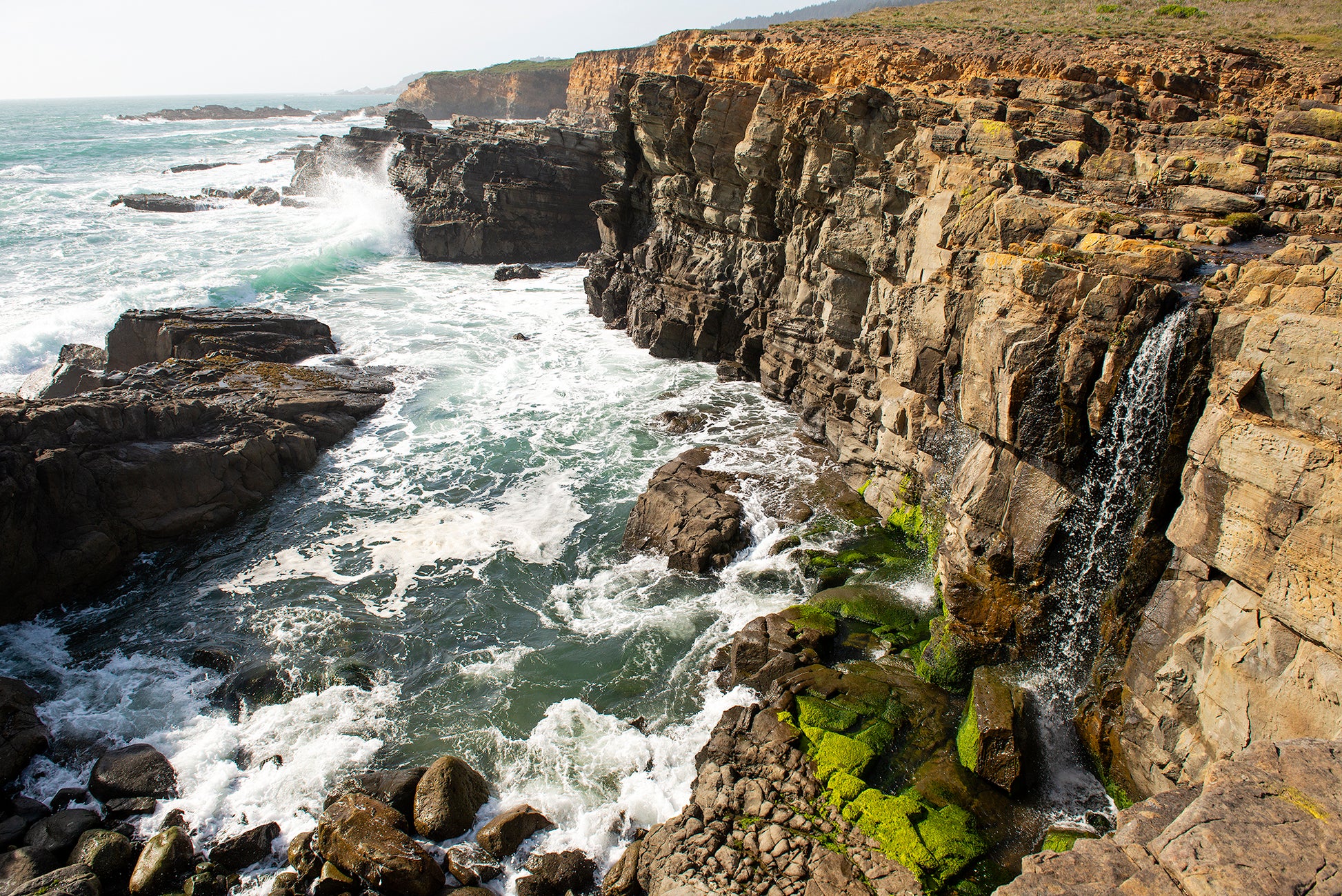 💦 Coastal Waterfall at Salt Point – A rare waterfall spills over weathered sandstone cliffs into a rocky cove, set against the backdrop of the open ocean—a stunning and rare sight on the Sonoma Coast.