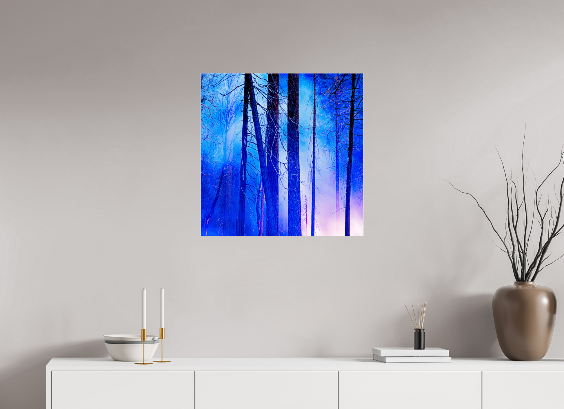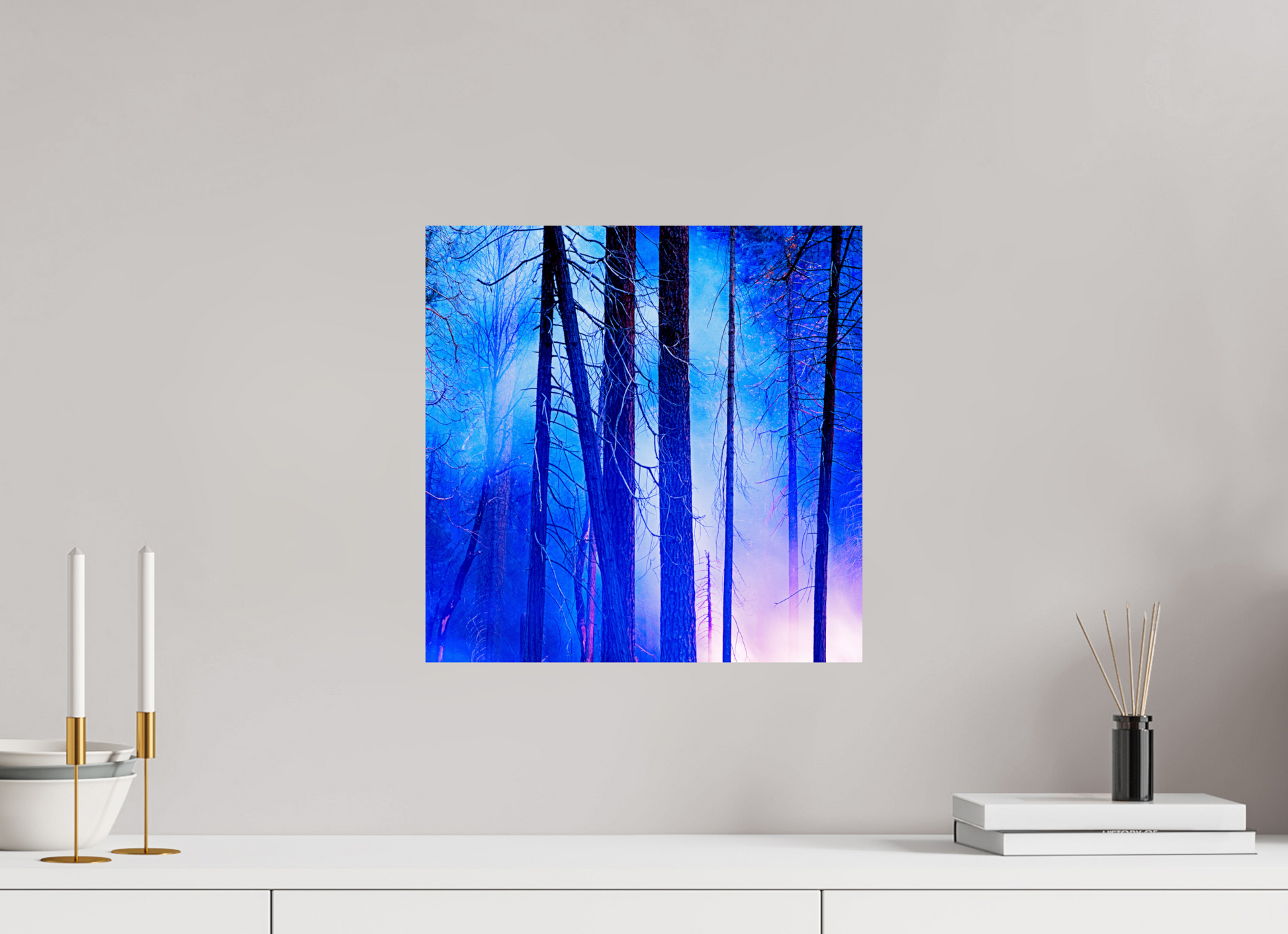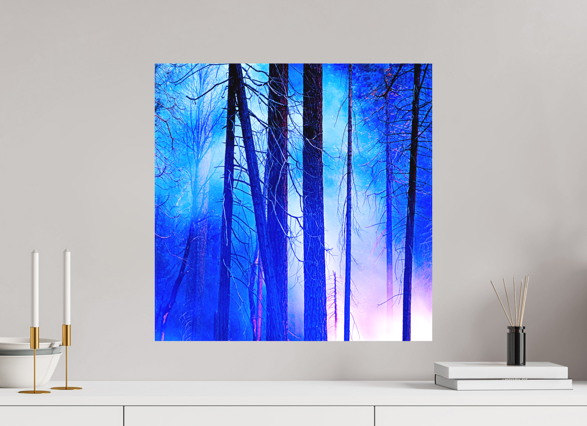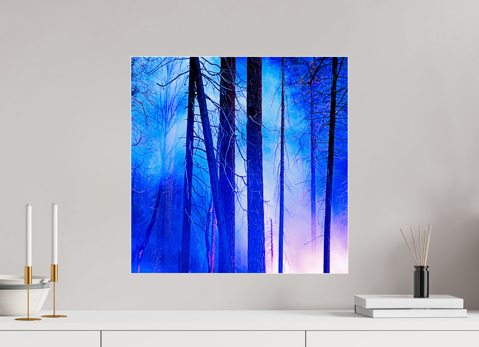 You can see the night sky reflecting in cool blue across the upper branches, while the lingering fire casts a soft red glow below, illuminating the trunks like brushstrokes.