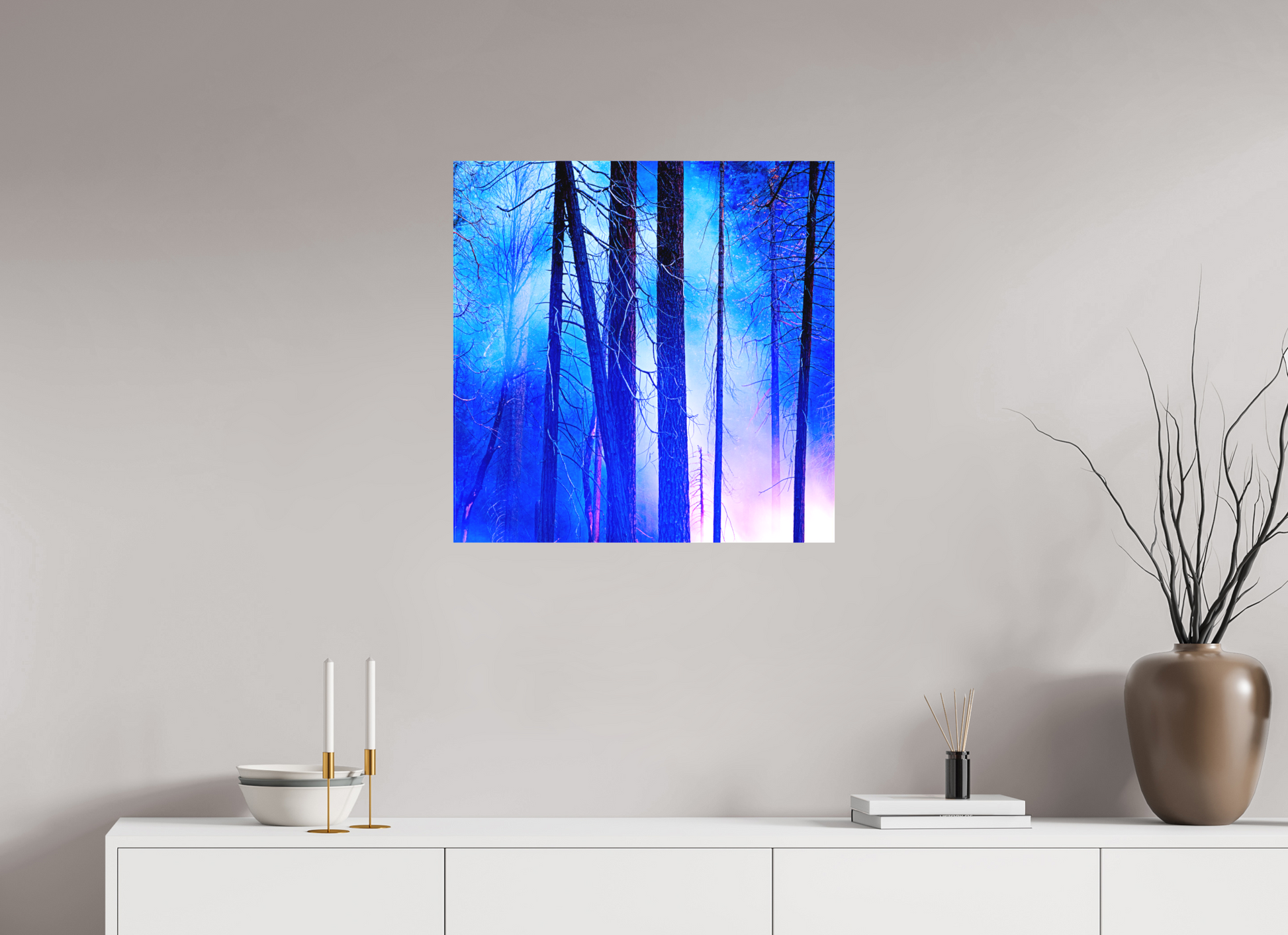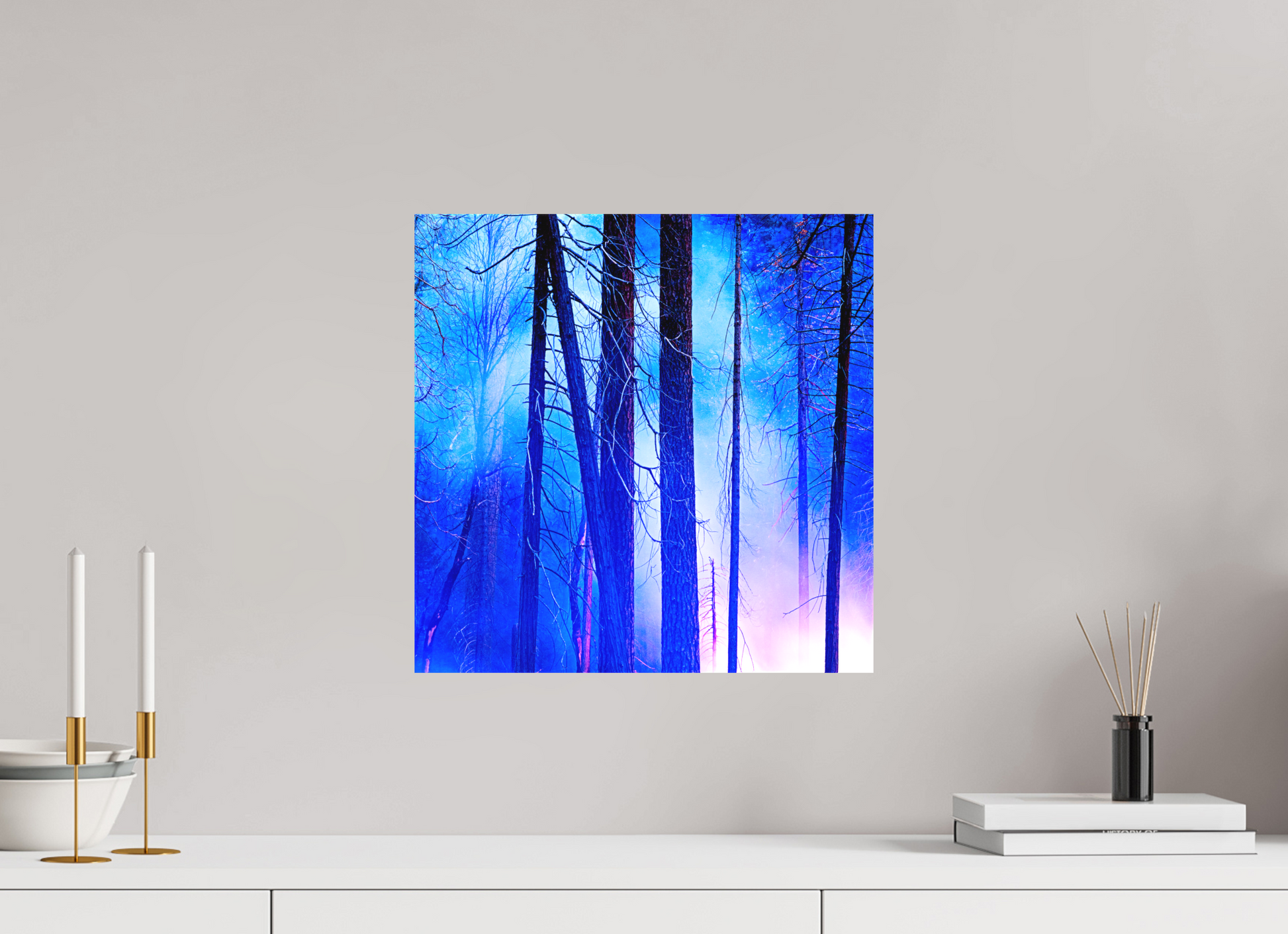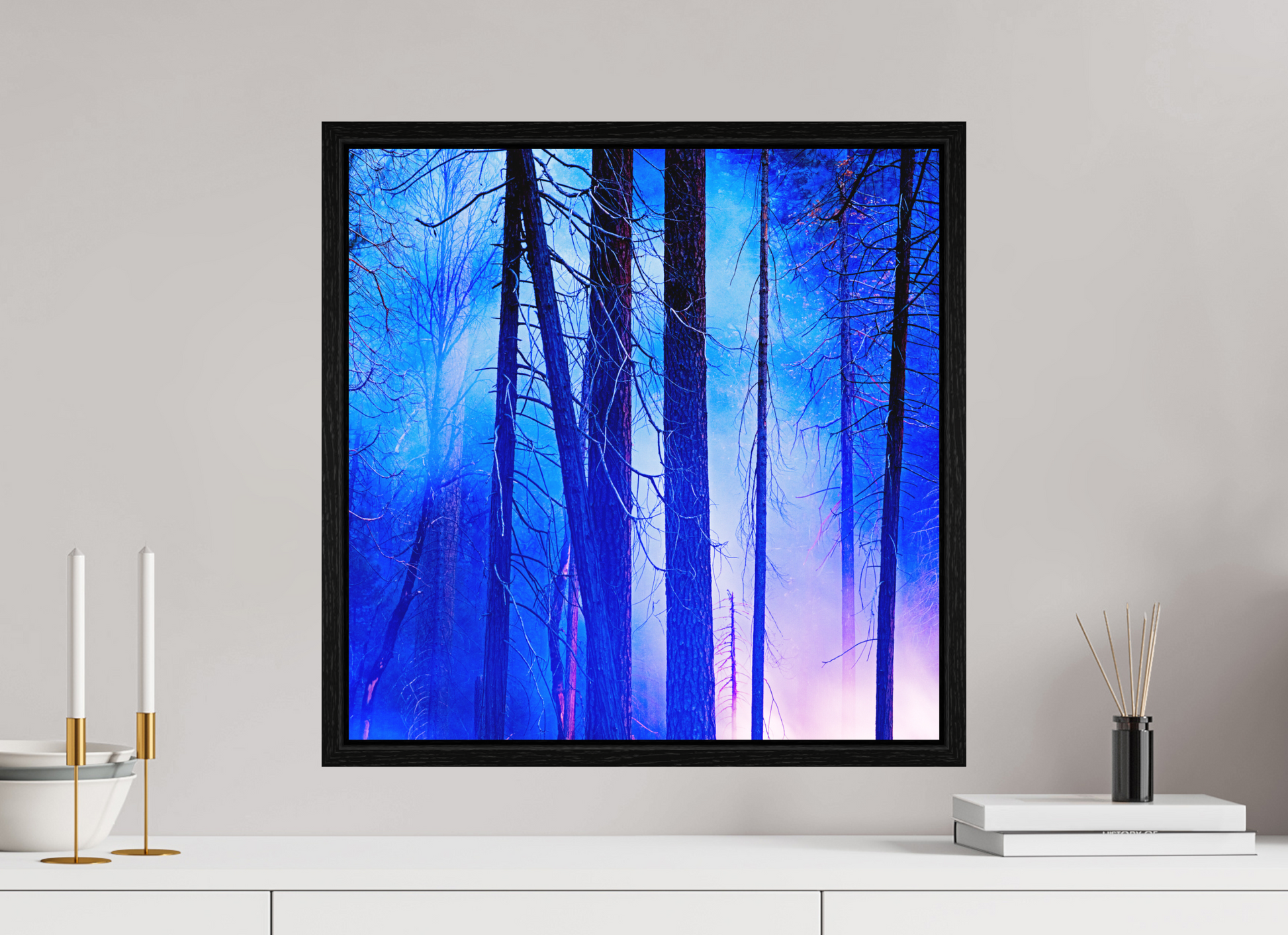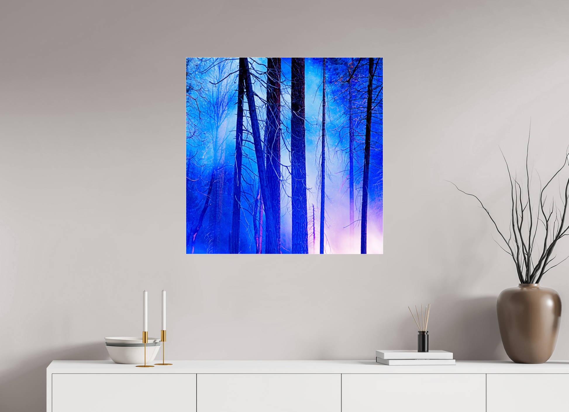 You can see the night sky reflecting in cool blue across the upper branches, while the lingering fire casts a soft red glow below, illuminating the trunks like brushstrokes.