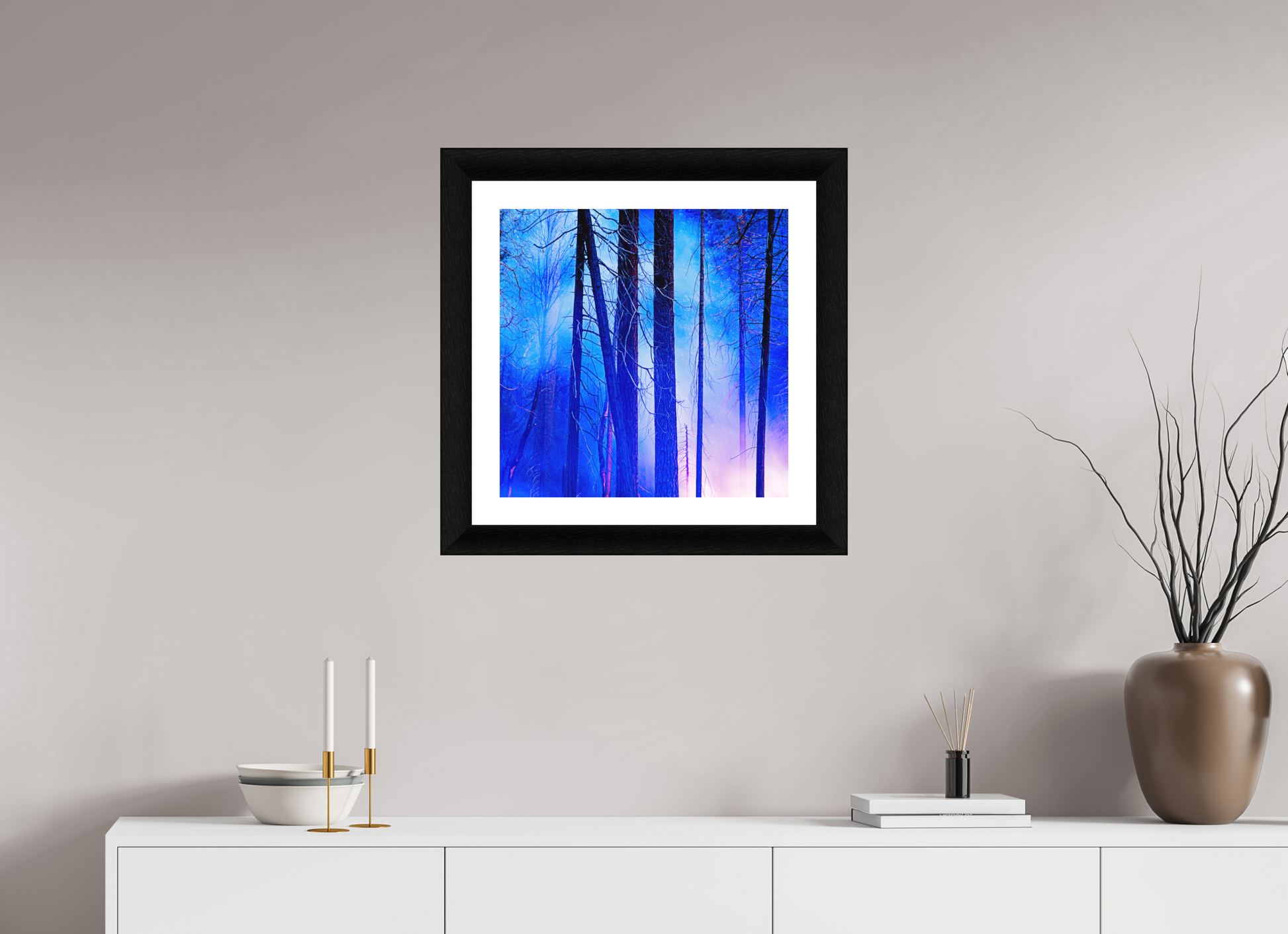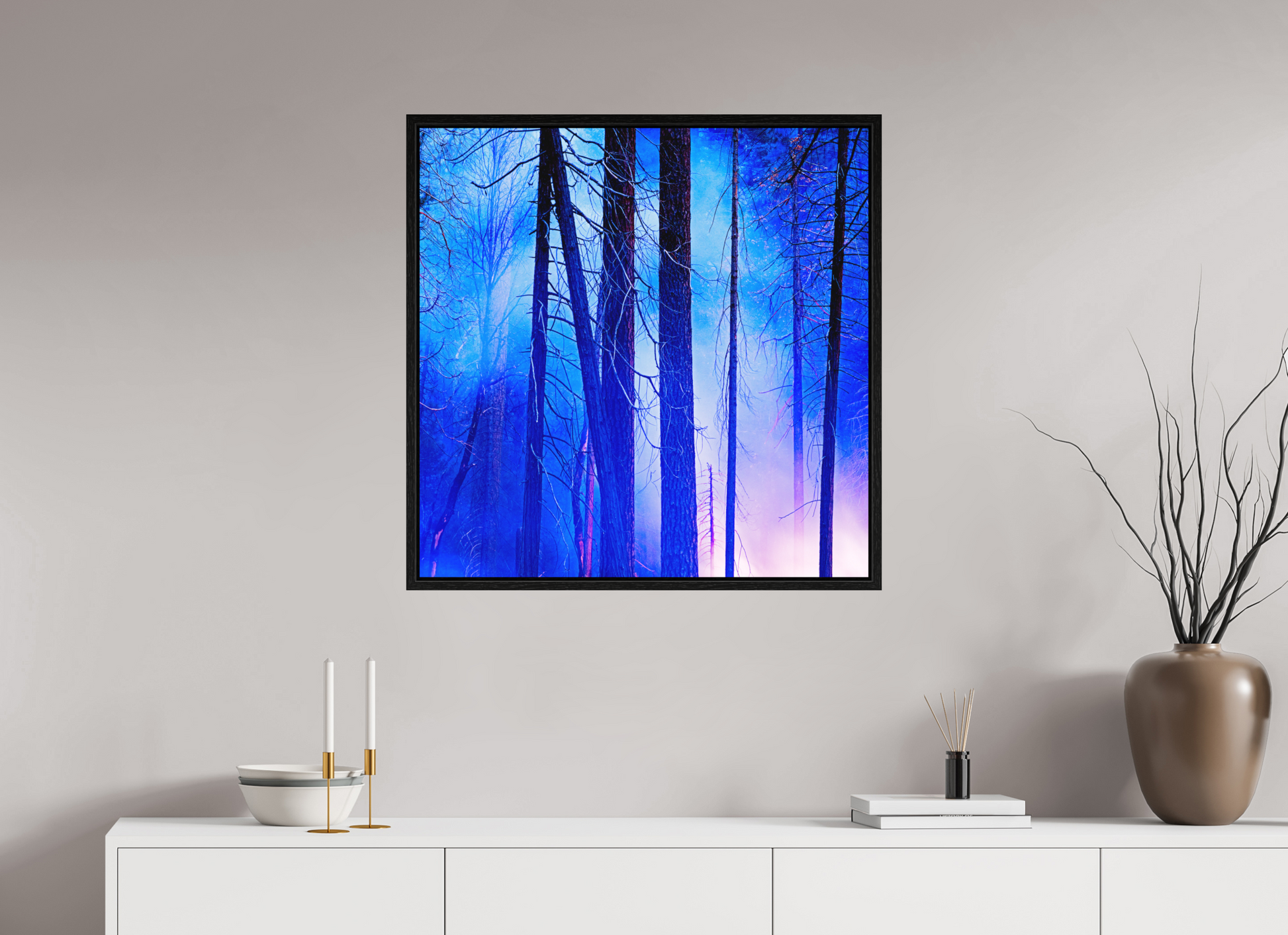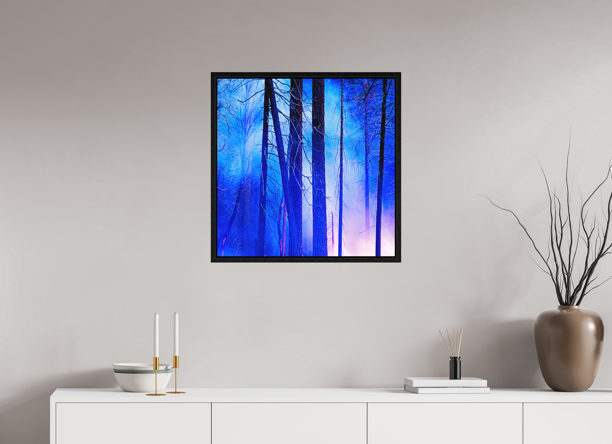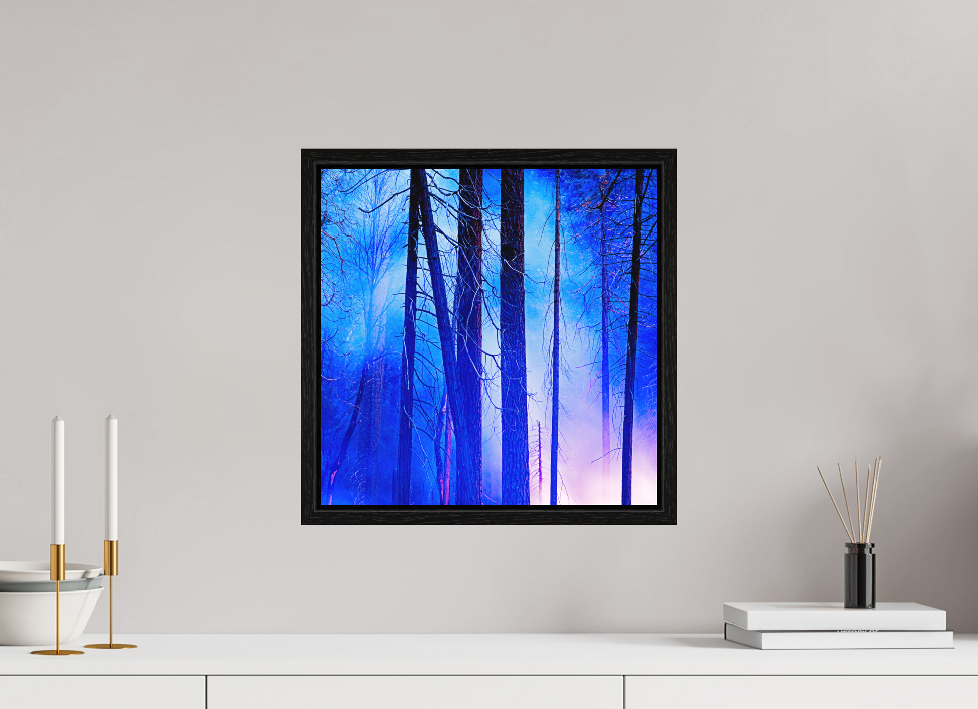 You can see the night sky reflecting in cool blue across the upper branches, while the lingering fire casts a soft red glow below, illuminating the trunks like brushstrokes.