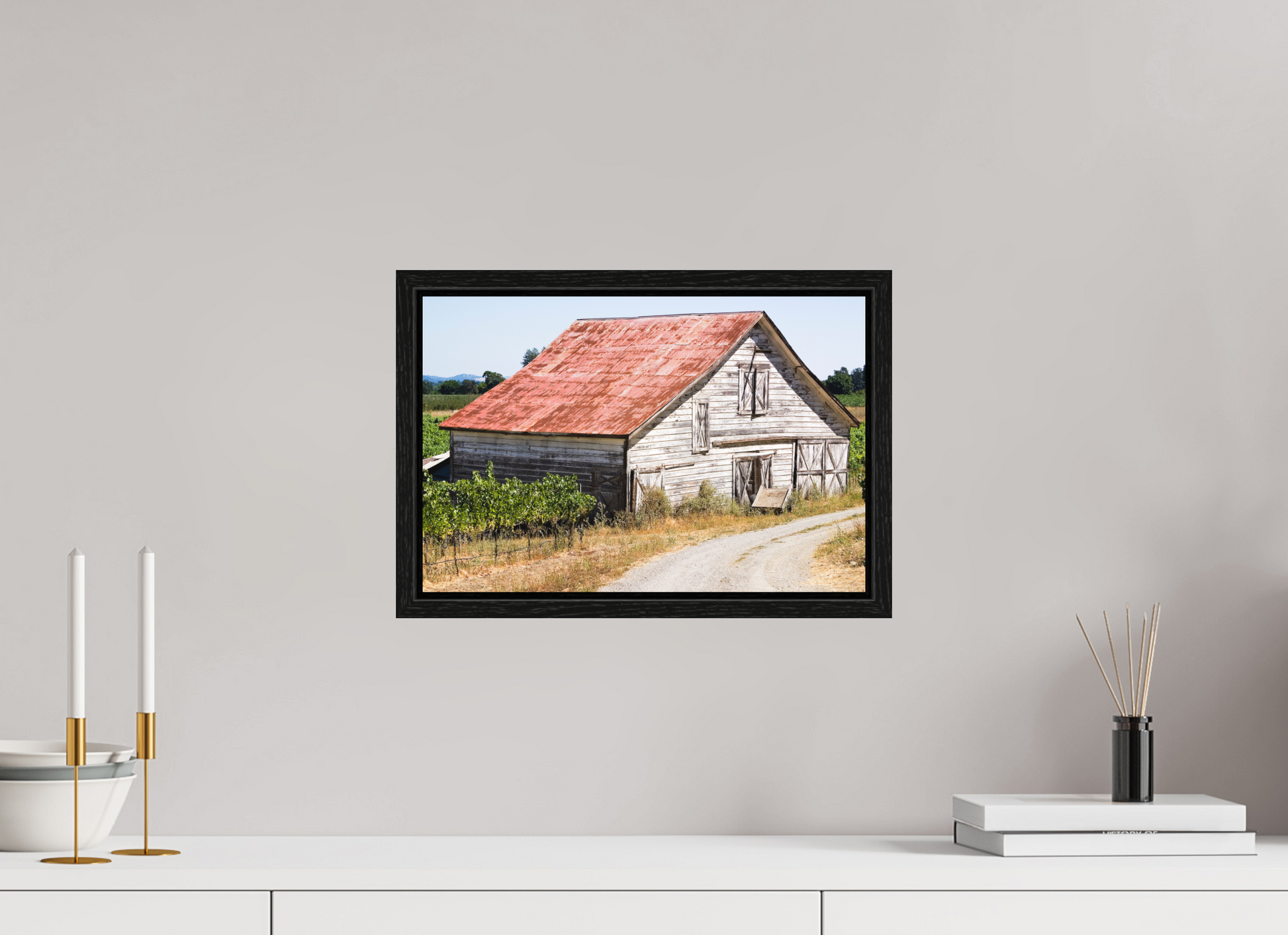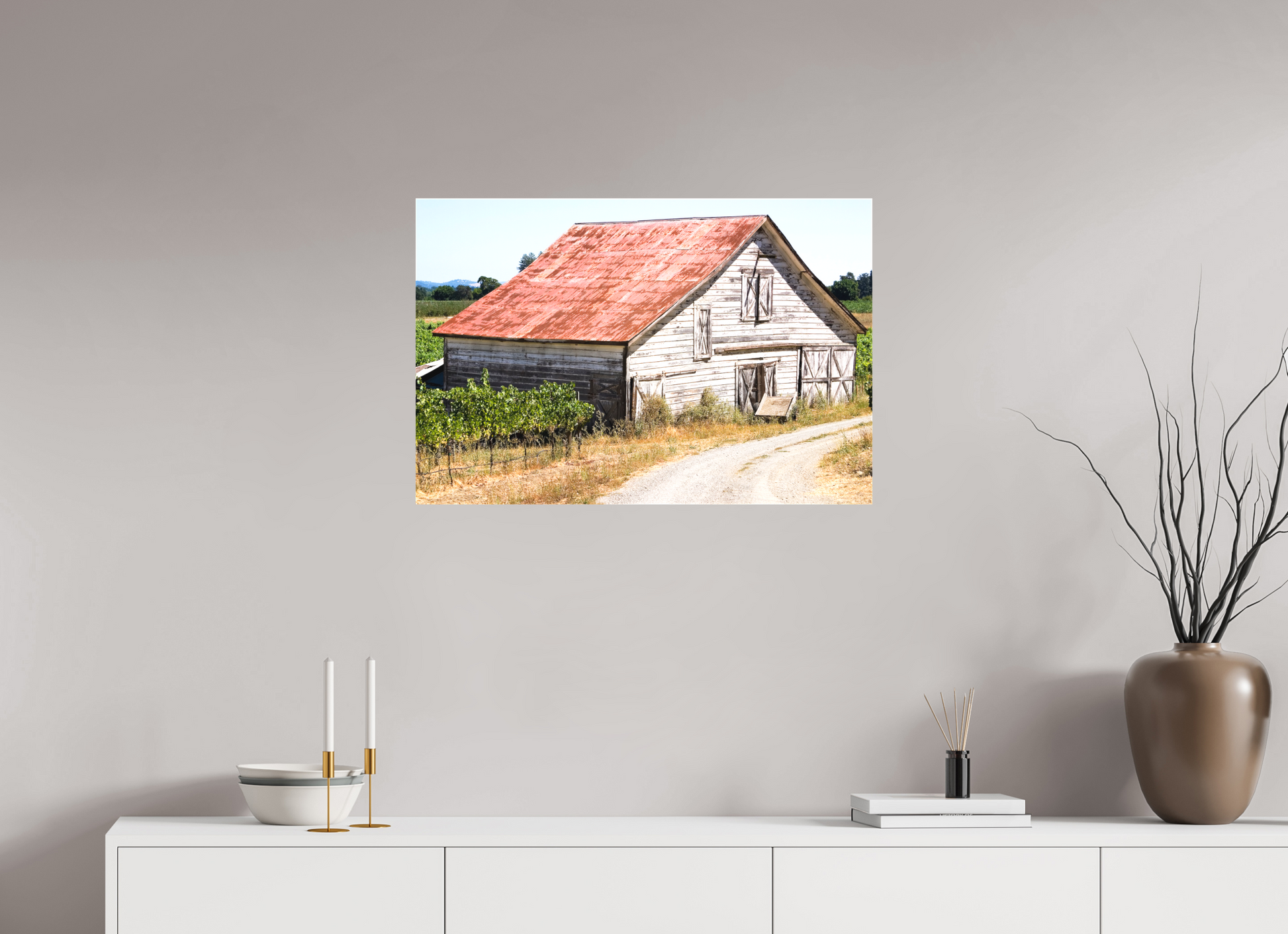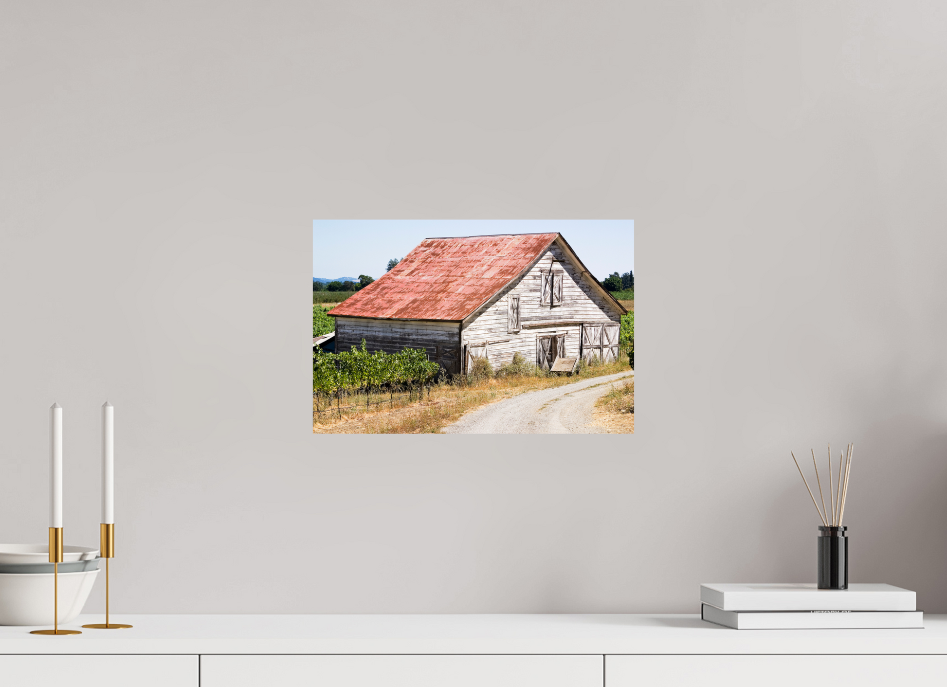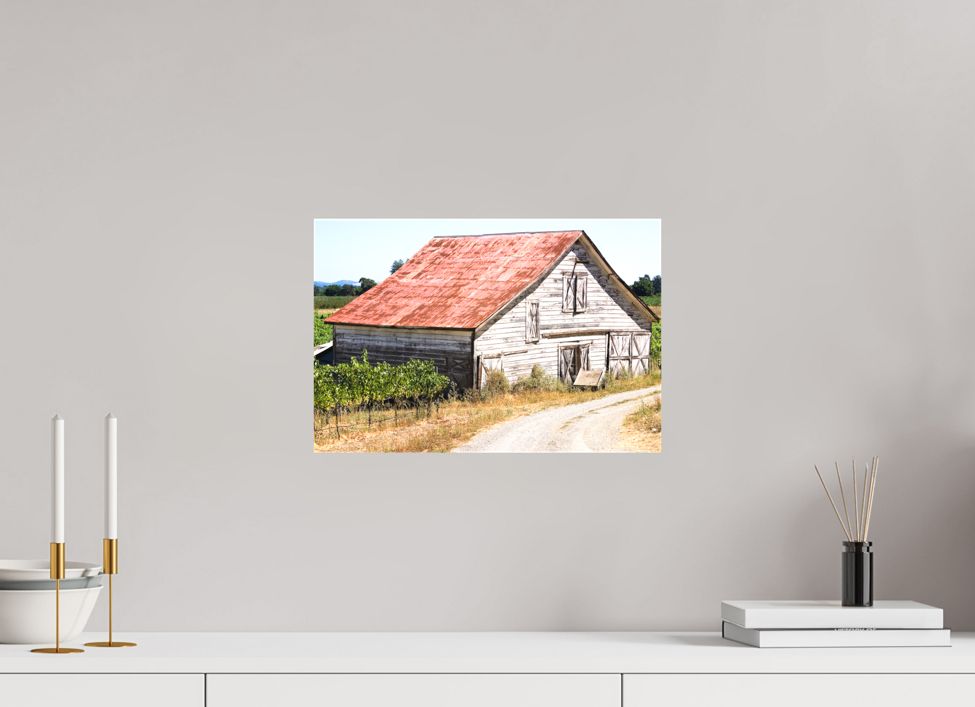 This fine art print—captured in Dry Creek Valley—is the very first photograph of wine country I ever offered for sale. The weathered barn, rusted roof, and winding gravel path are all real, rendered with such clarity and character that viewers often mistake it for a painting.