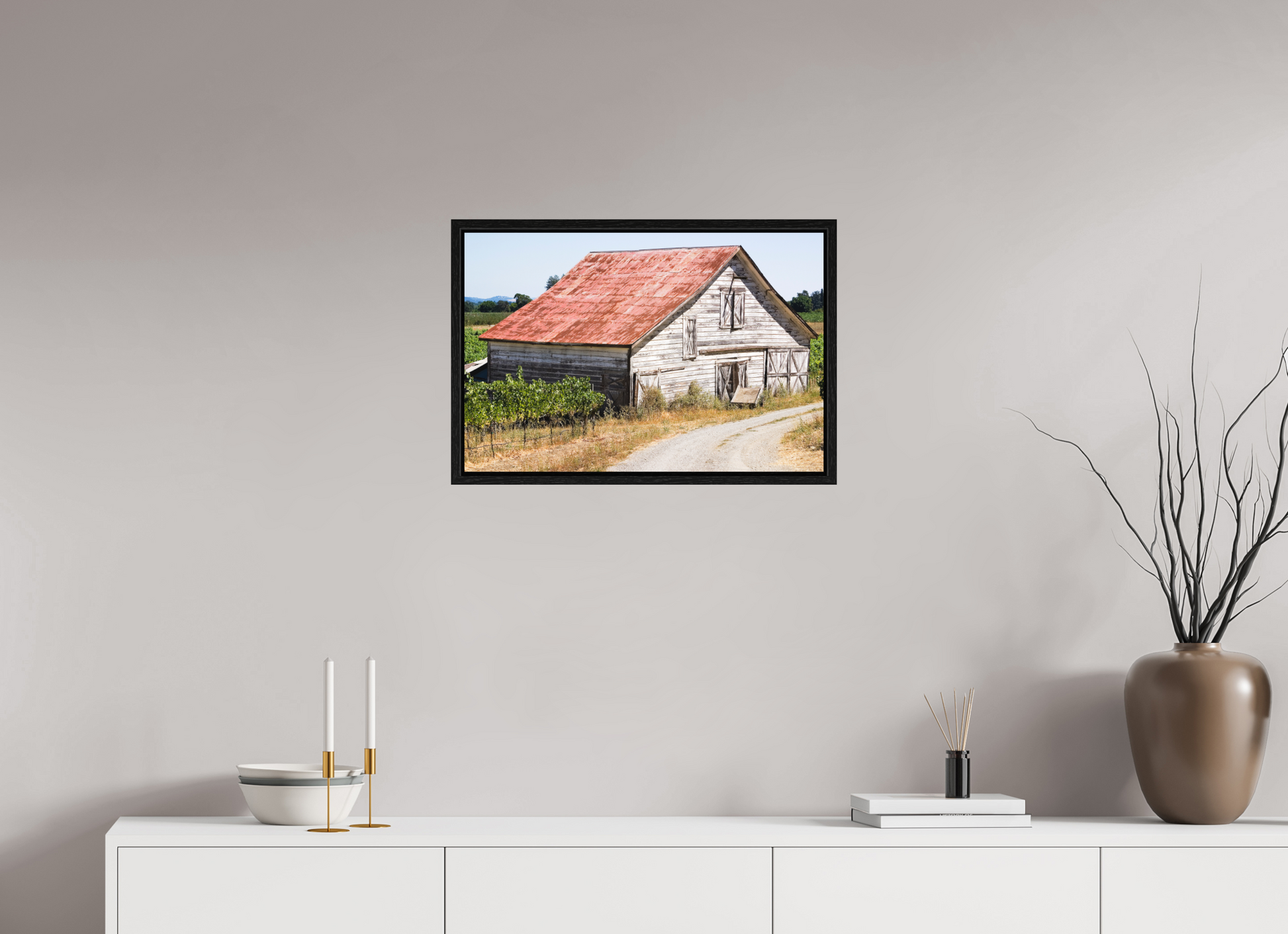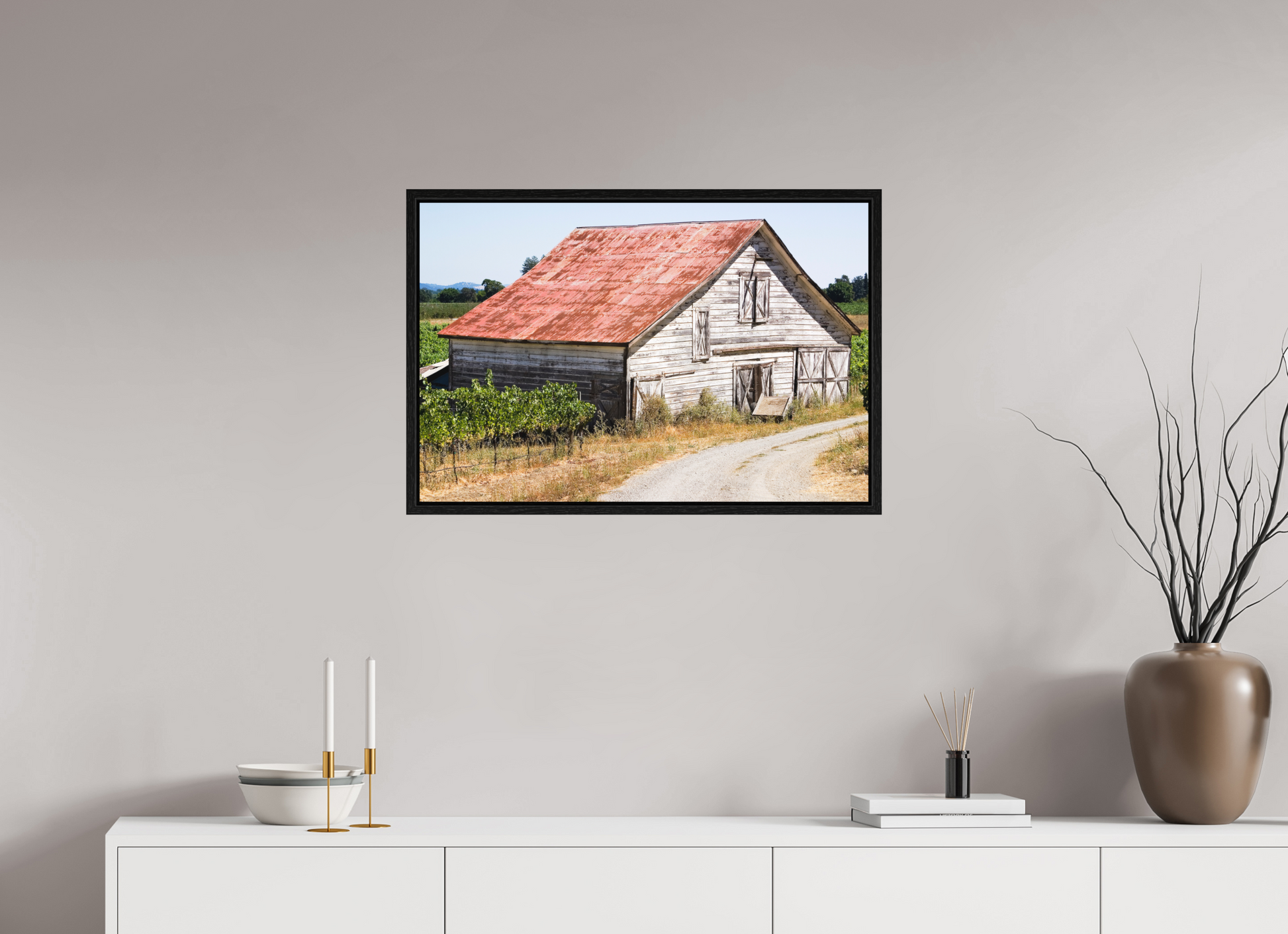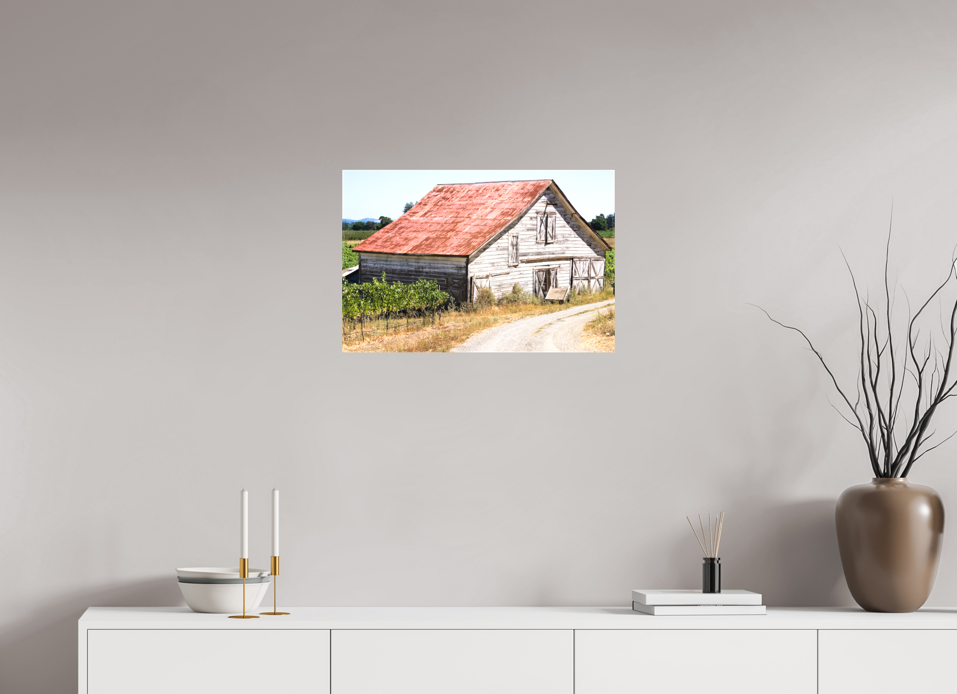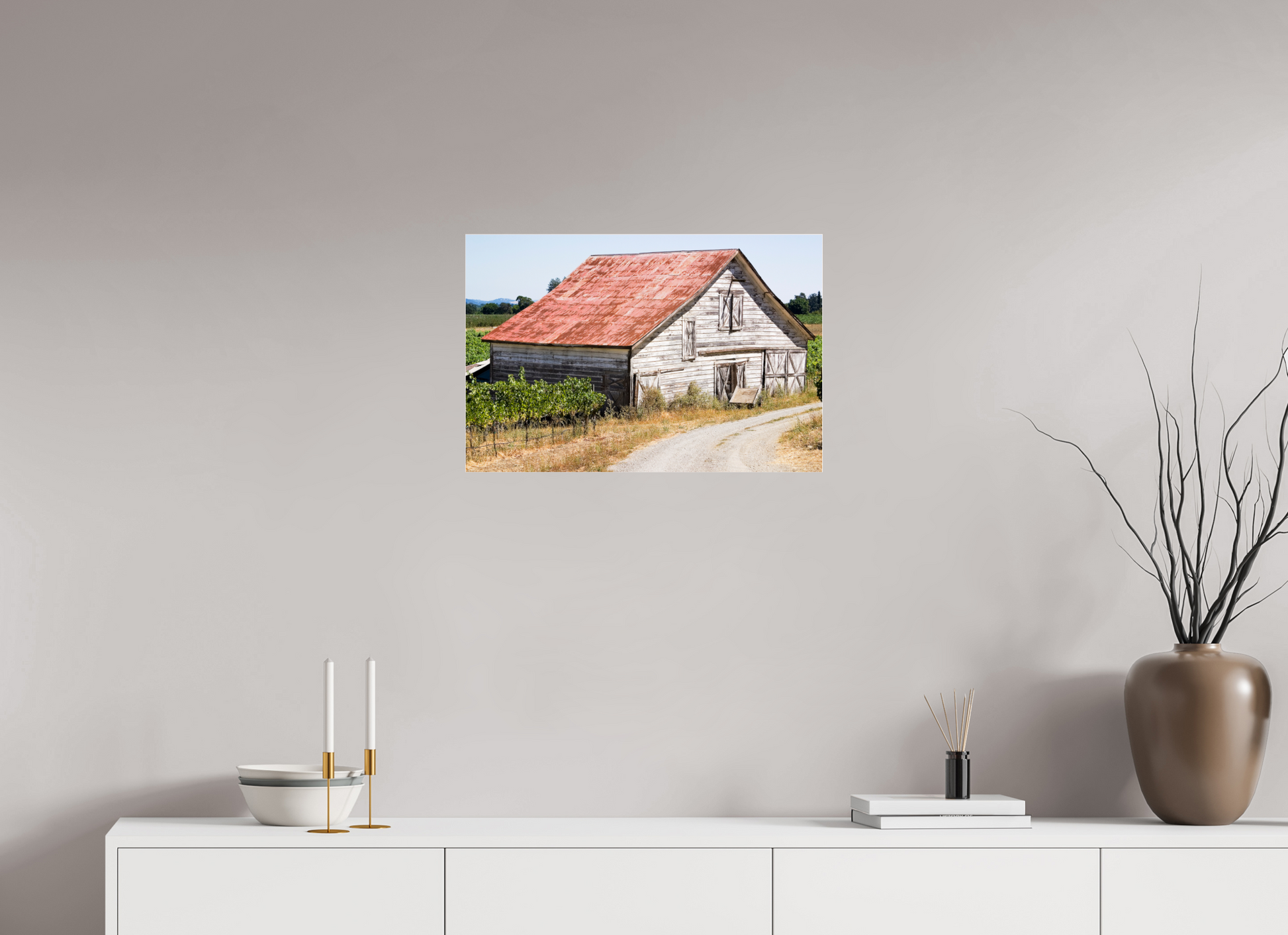 This fine art print—captured in Dry Creek Valley—is the very first photograph of wine country I ever offered for sale. The weathered barn, rusted roof, and winding gravel path are all real, rendered with such clarity and character that viewers often mistake it for a painting.