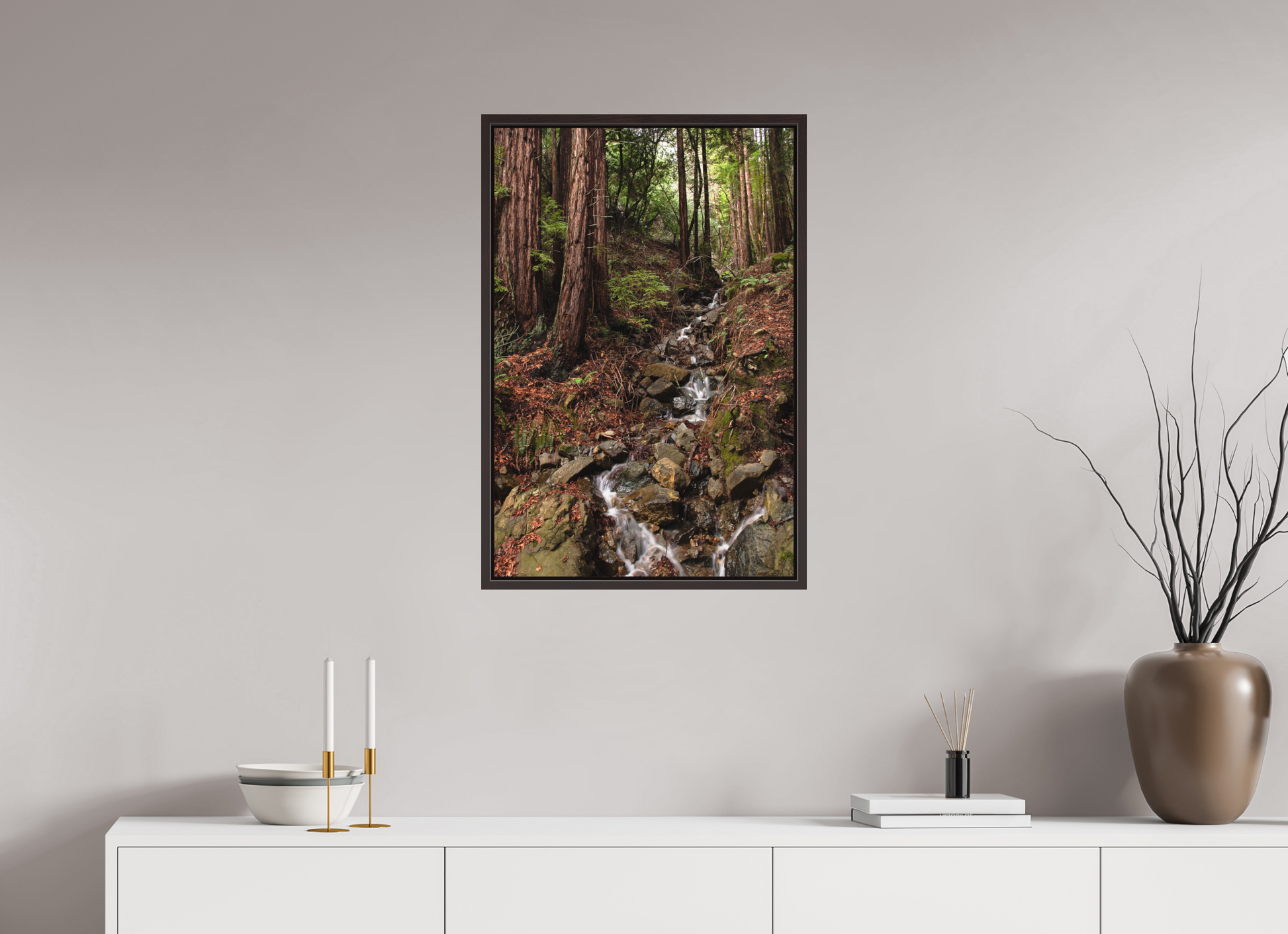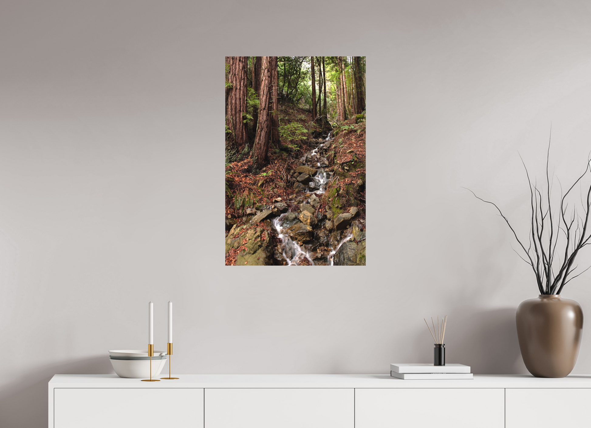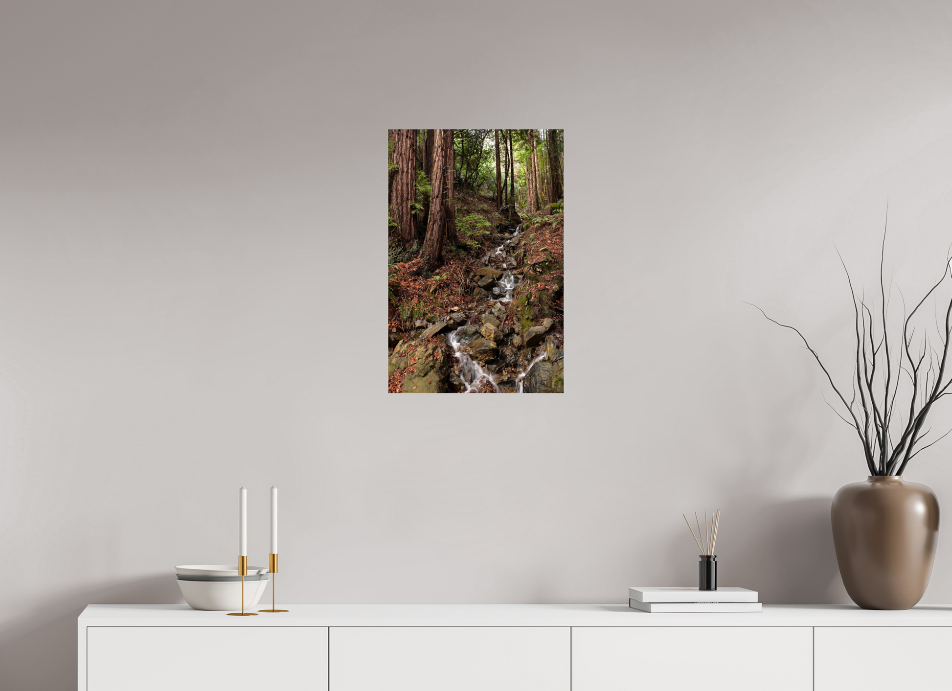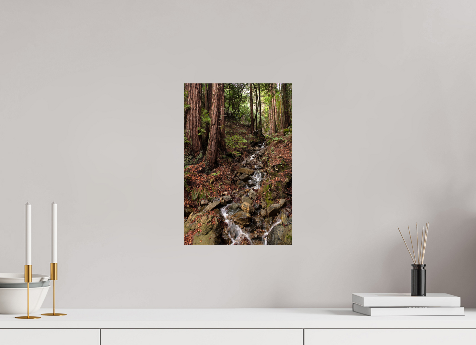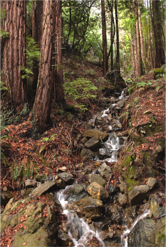 The redwoods stand tall and silent while the water cuts a path through stone and fallen leaves — a reminder that even in the quietest places, change is always moving through the land.