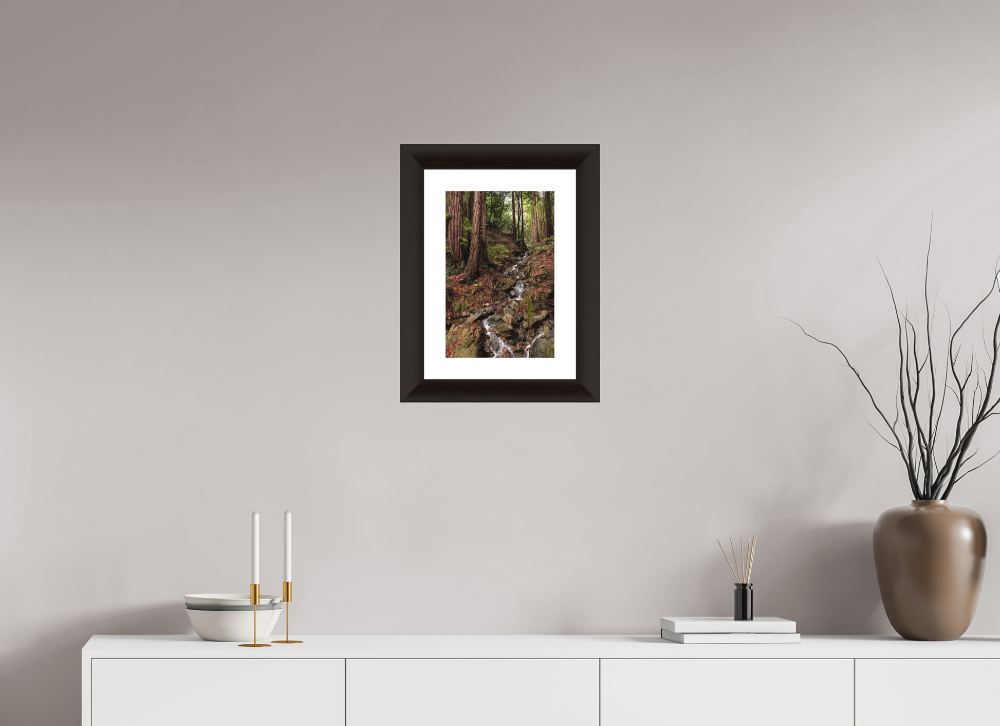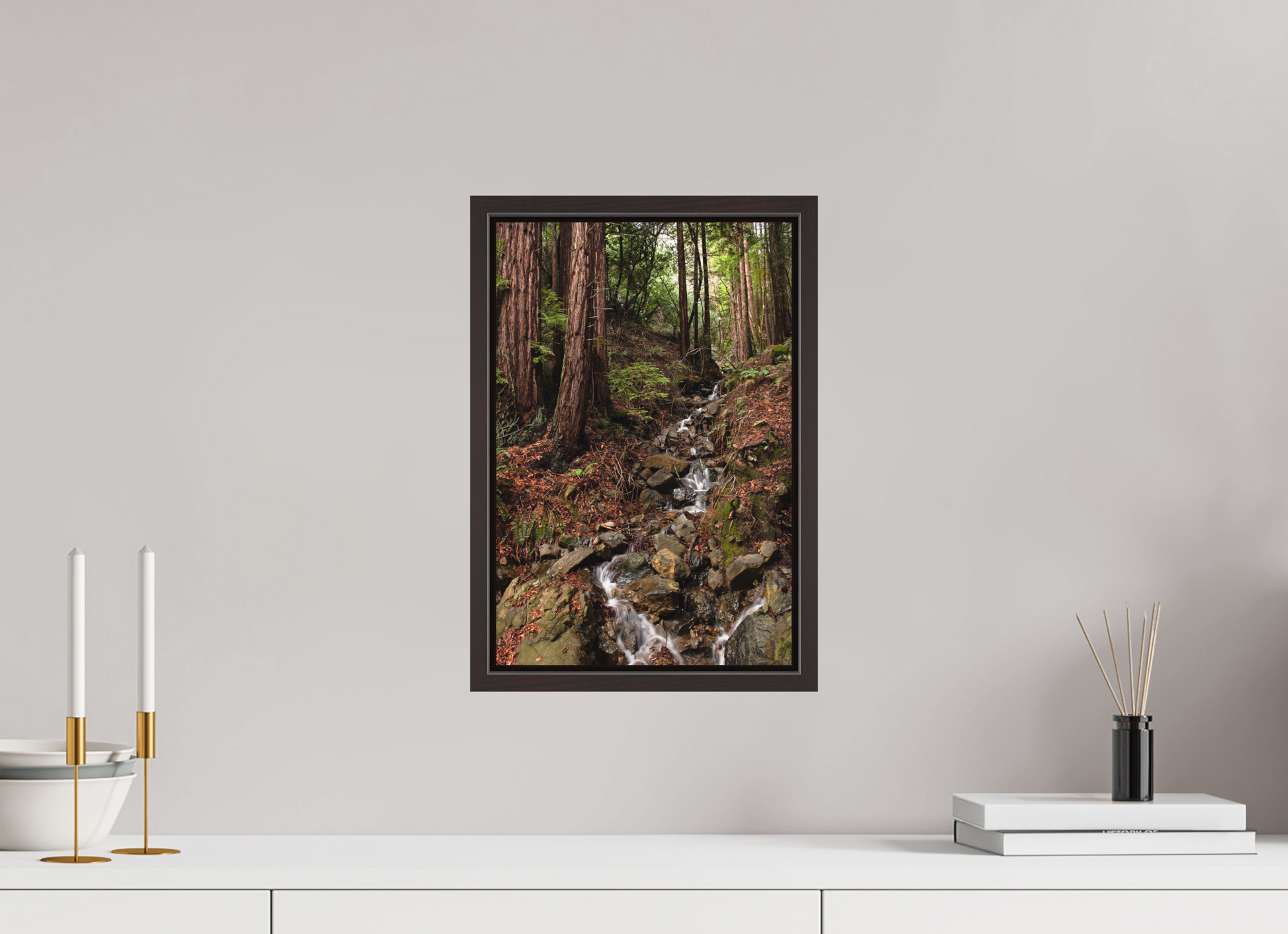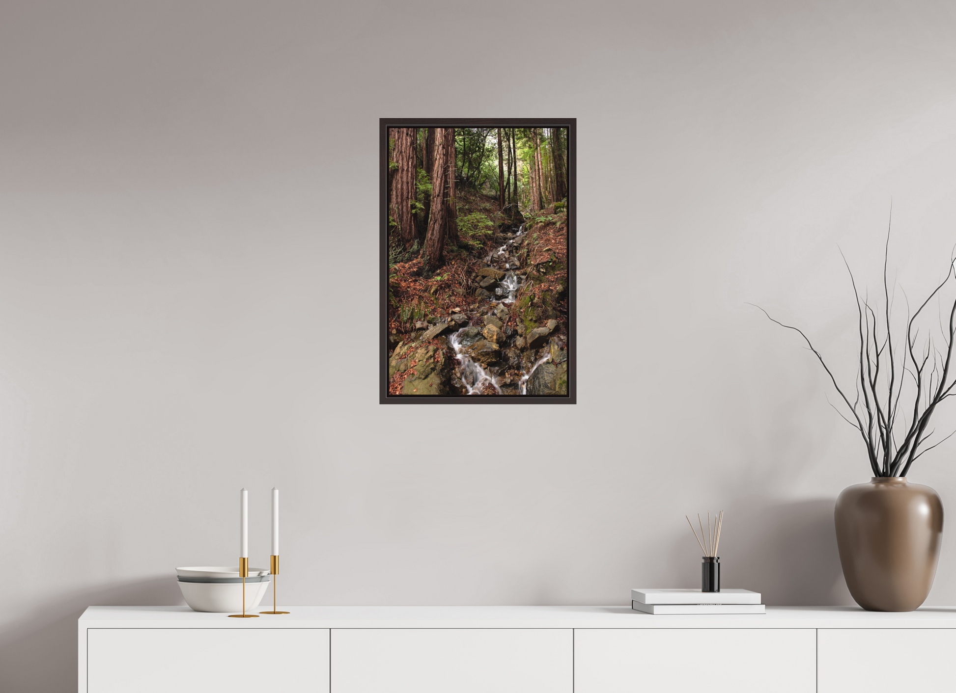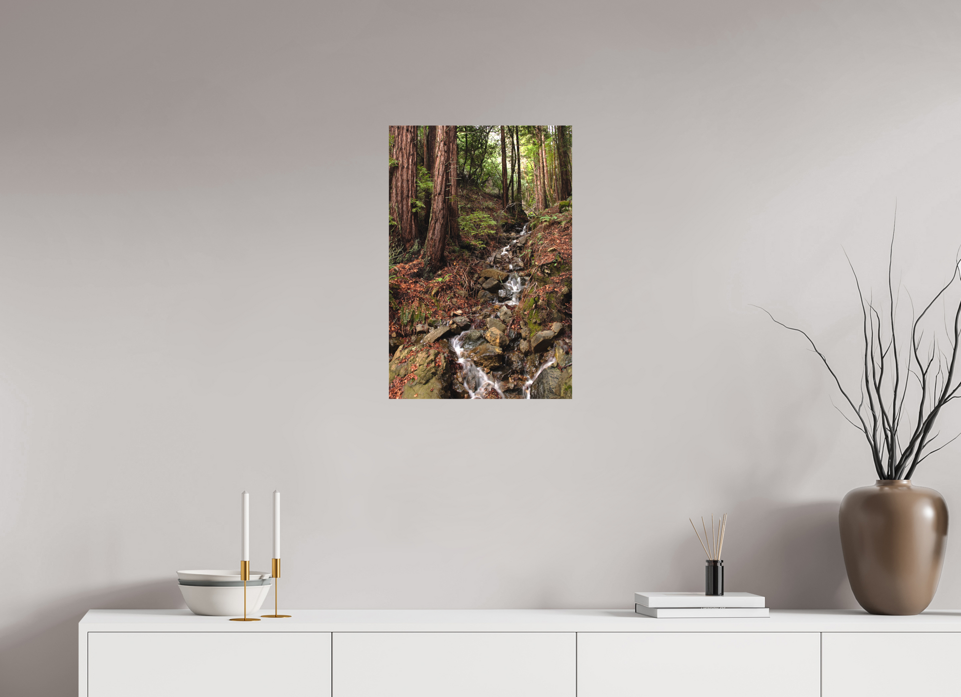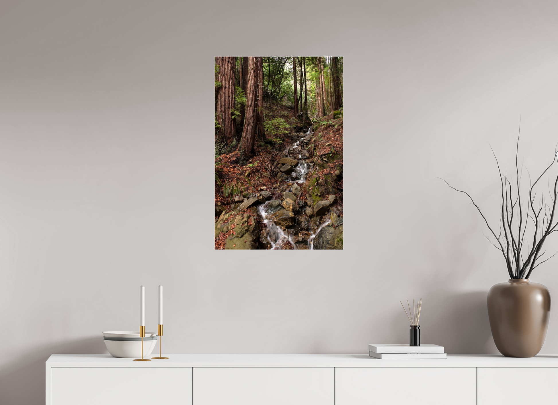 The redwoods stand tall and silent while the water cuts a path through stone and fallen leaves — a reminder that even in the quietest places, change is always moving through the land.