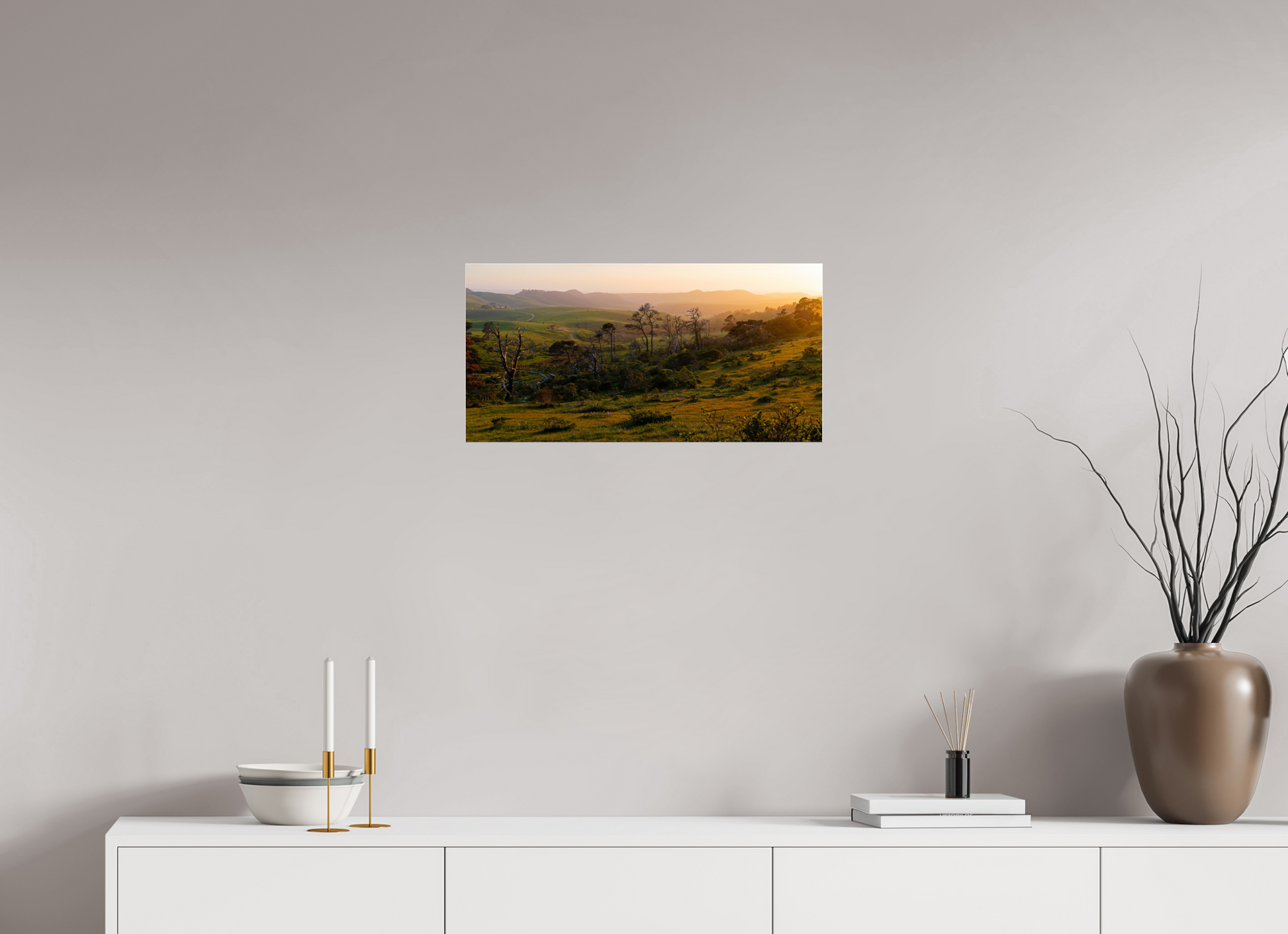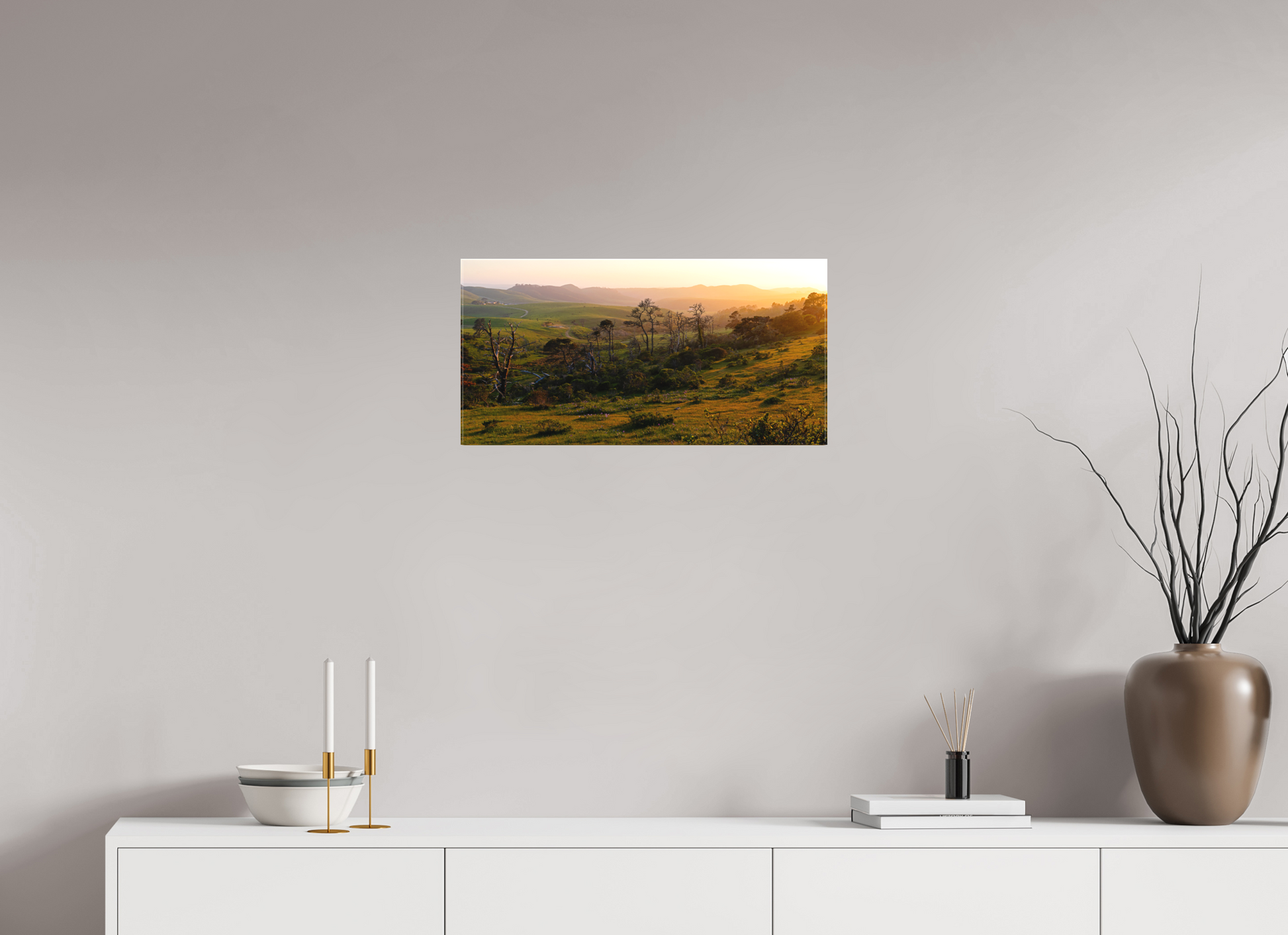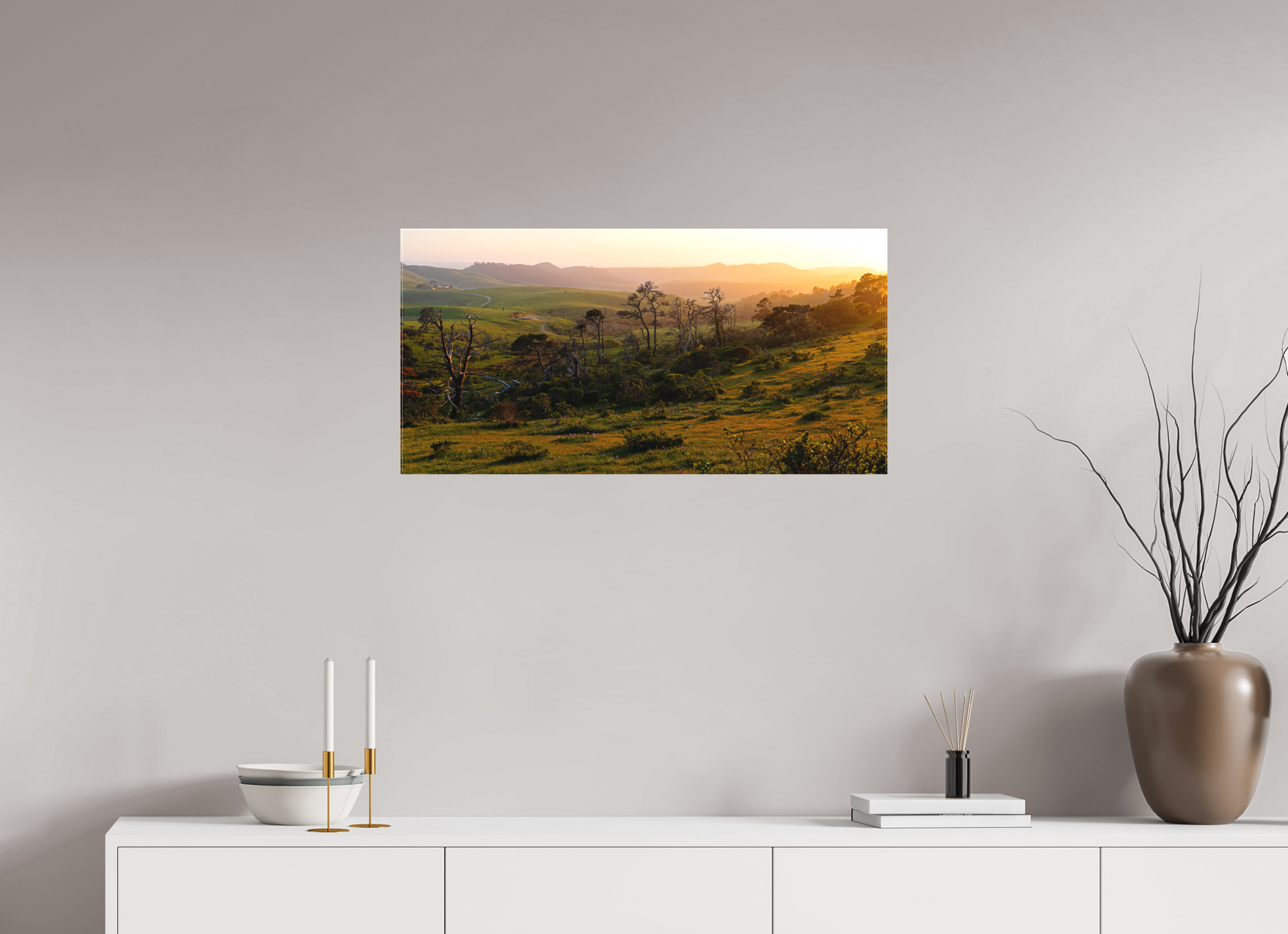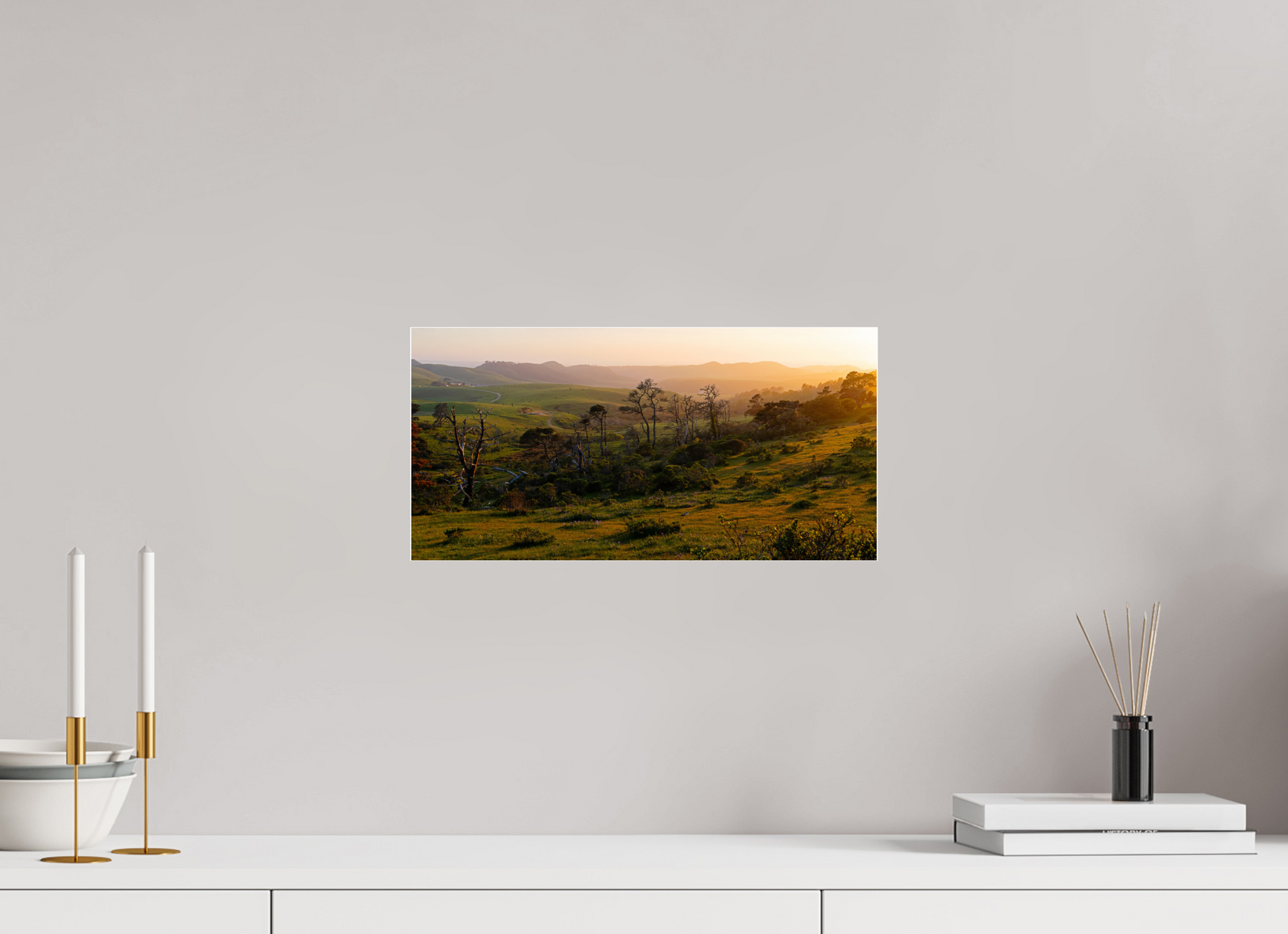 The warm evening light spills across the hills, casting long shadows and turning the grasses gold. Weathered trees rise from the landscape like silhouettes from another time, standing among fresh spring growth and scattered wildflowers. A winding path draws your eye through layers of rolling terrain, inviting you into the scene’s depth and calm.