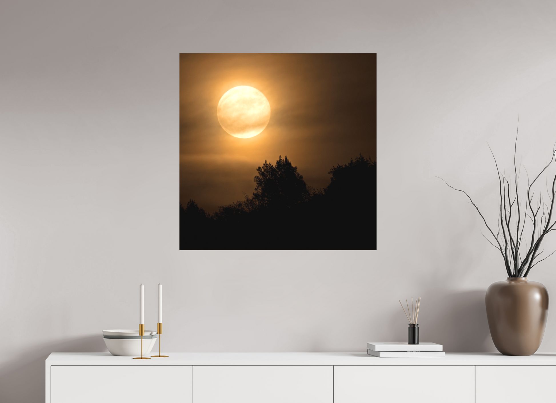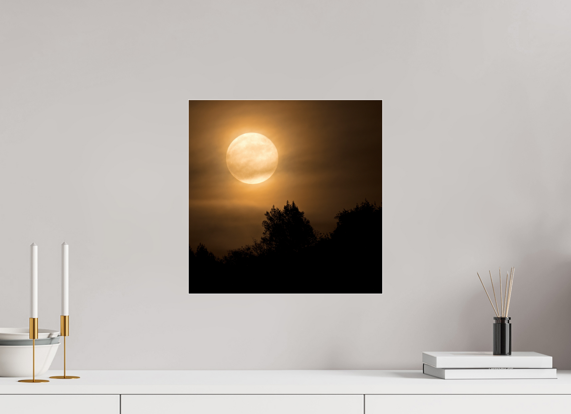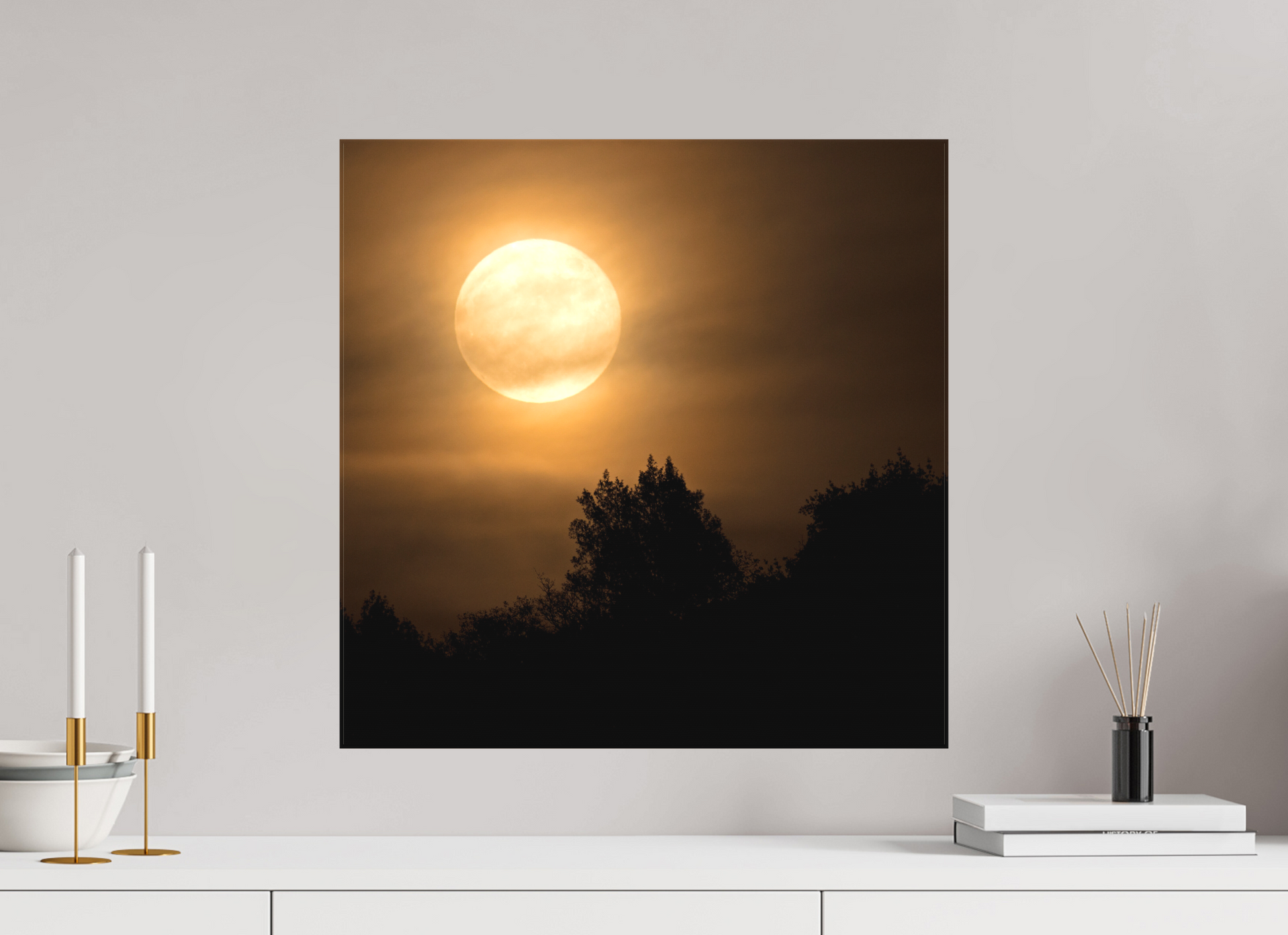 Printed on glossy metal, this image takes on an almost three-dimensional quality — the moon’s glow deepens, the shadows grow richer, and the scene feels alive with atmosphere.