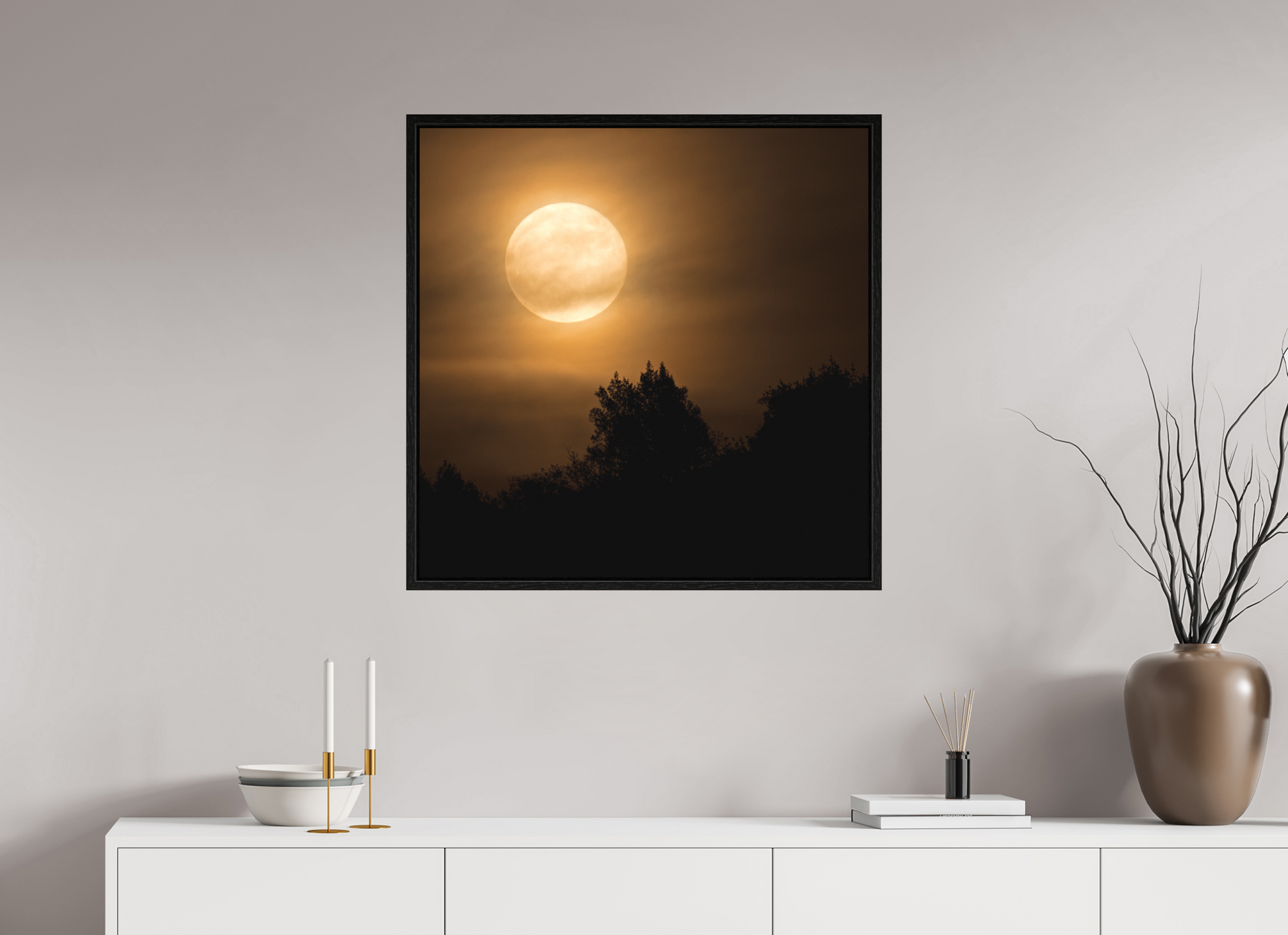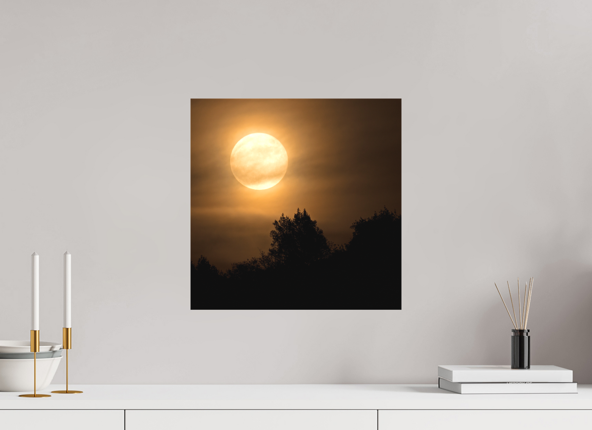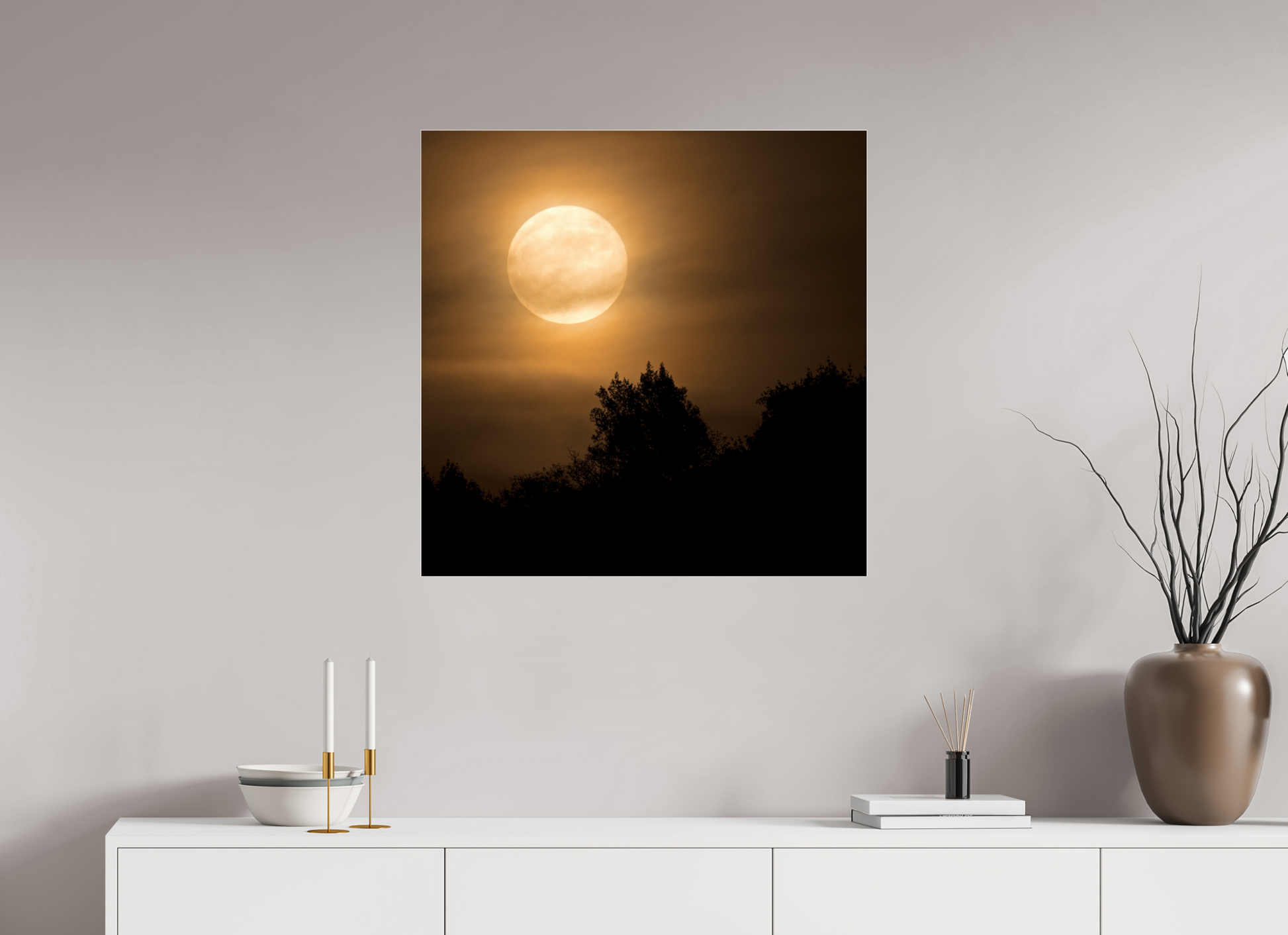 Printed on glossy metal, this image takes on an almost three-dimensional quality — the moon’s glow deepens, the shadows grow richer, and the scene feels alive with atmosphere.