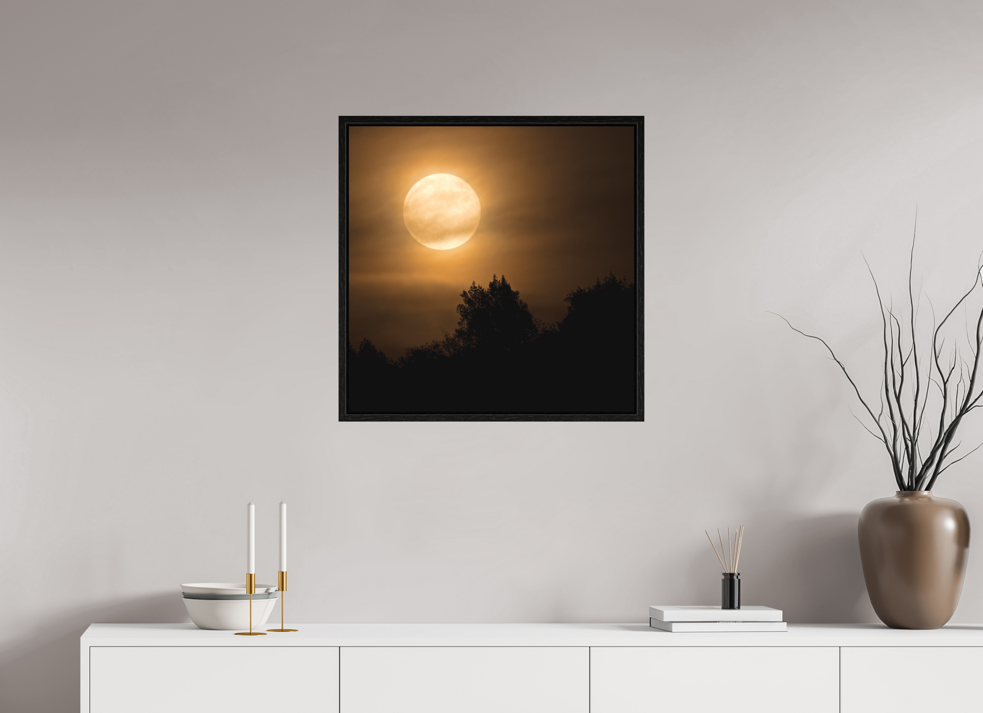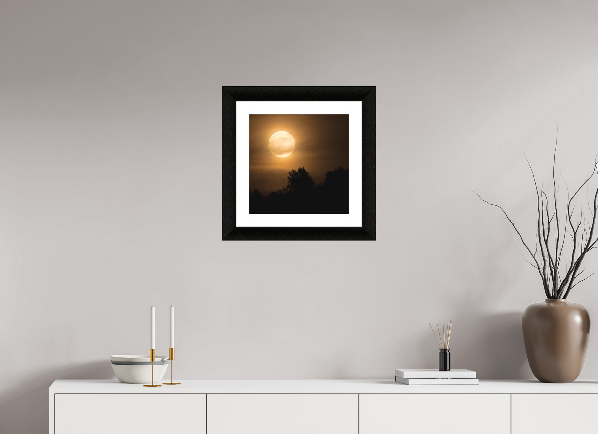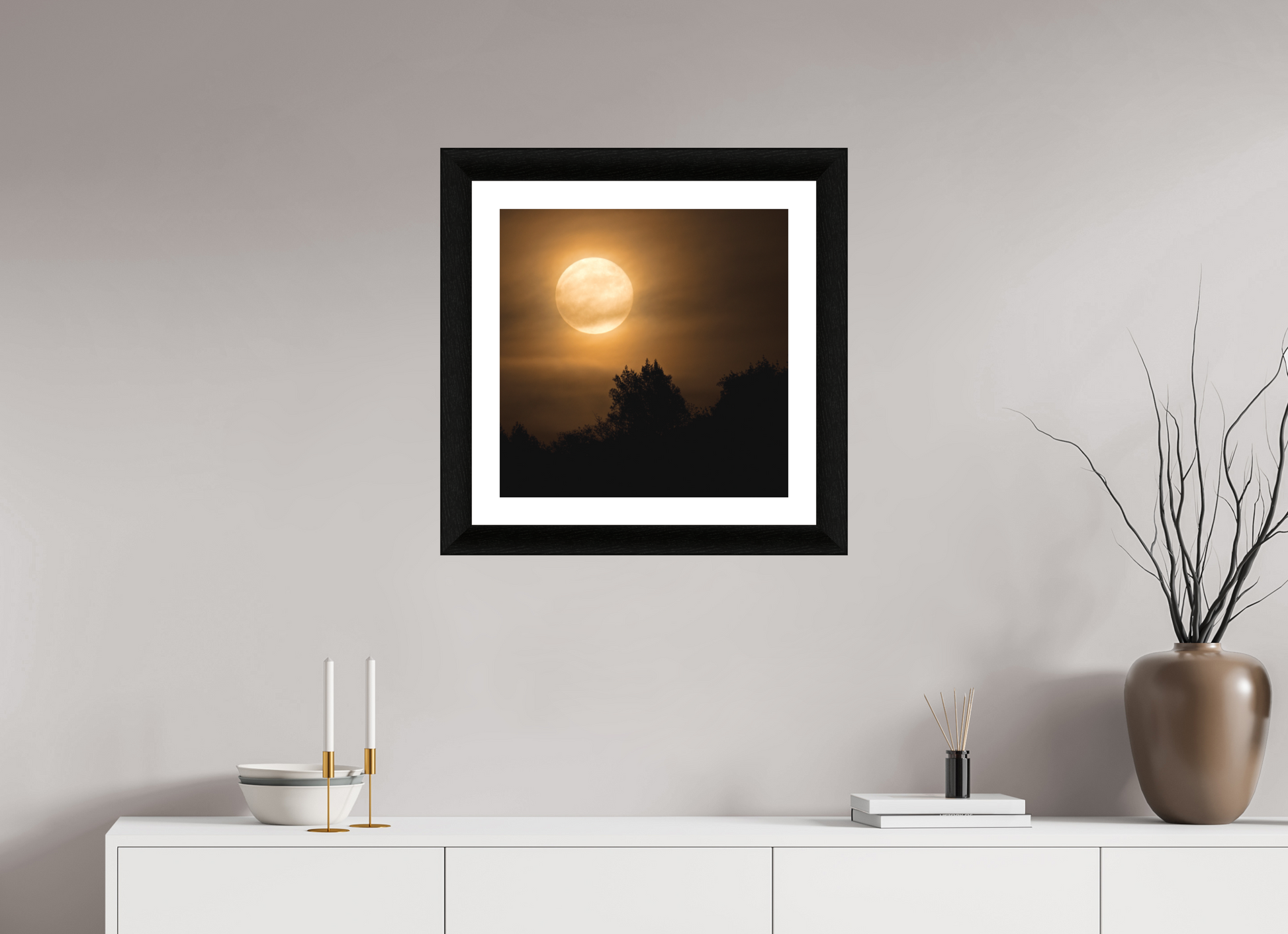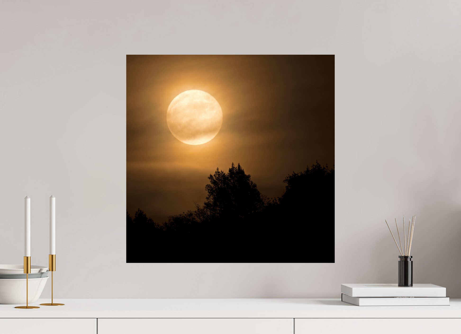 Capture the quiet power of a fall evening with this fine art photograph, taken near the hills east of Santa Rosa, California. The full moon rises heavy and luminous through thin clouds, casting a soft glow over the silhouetted trees below.