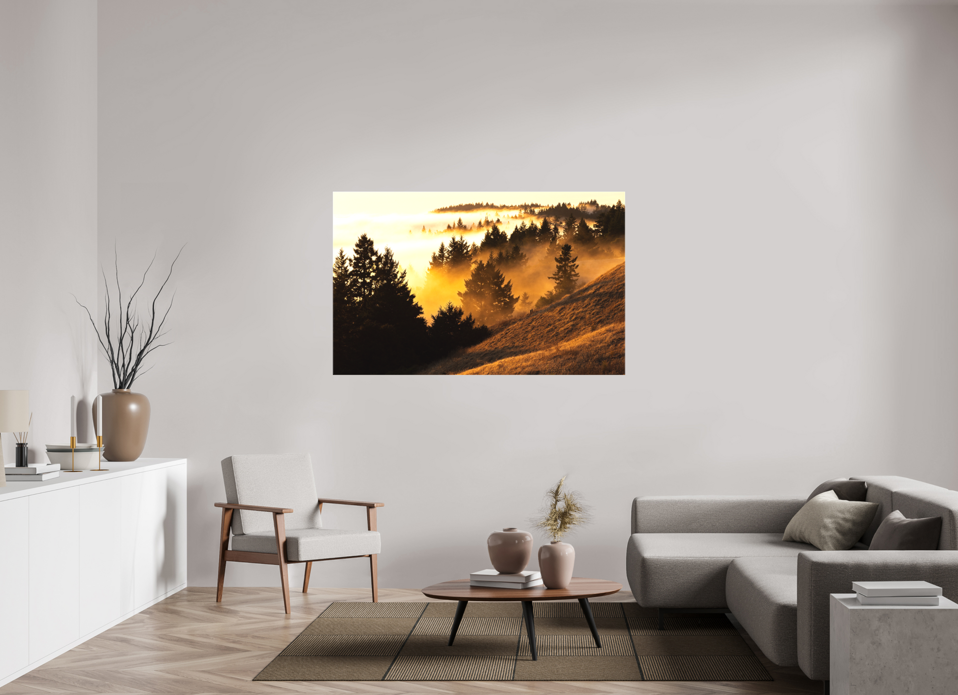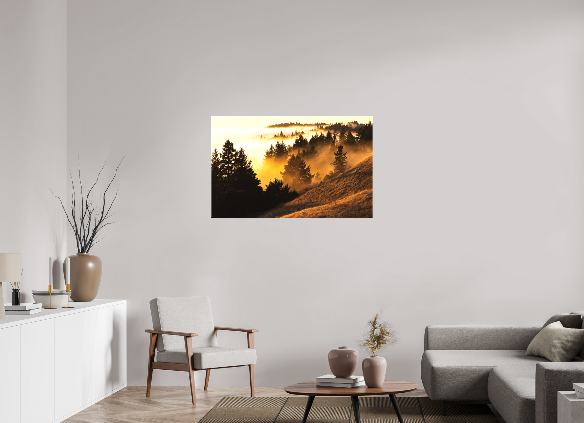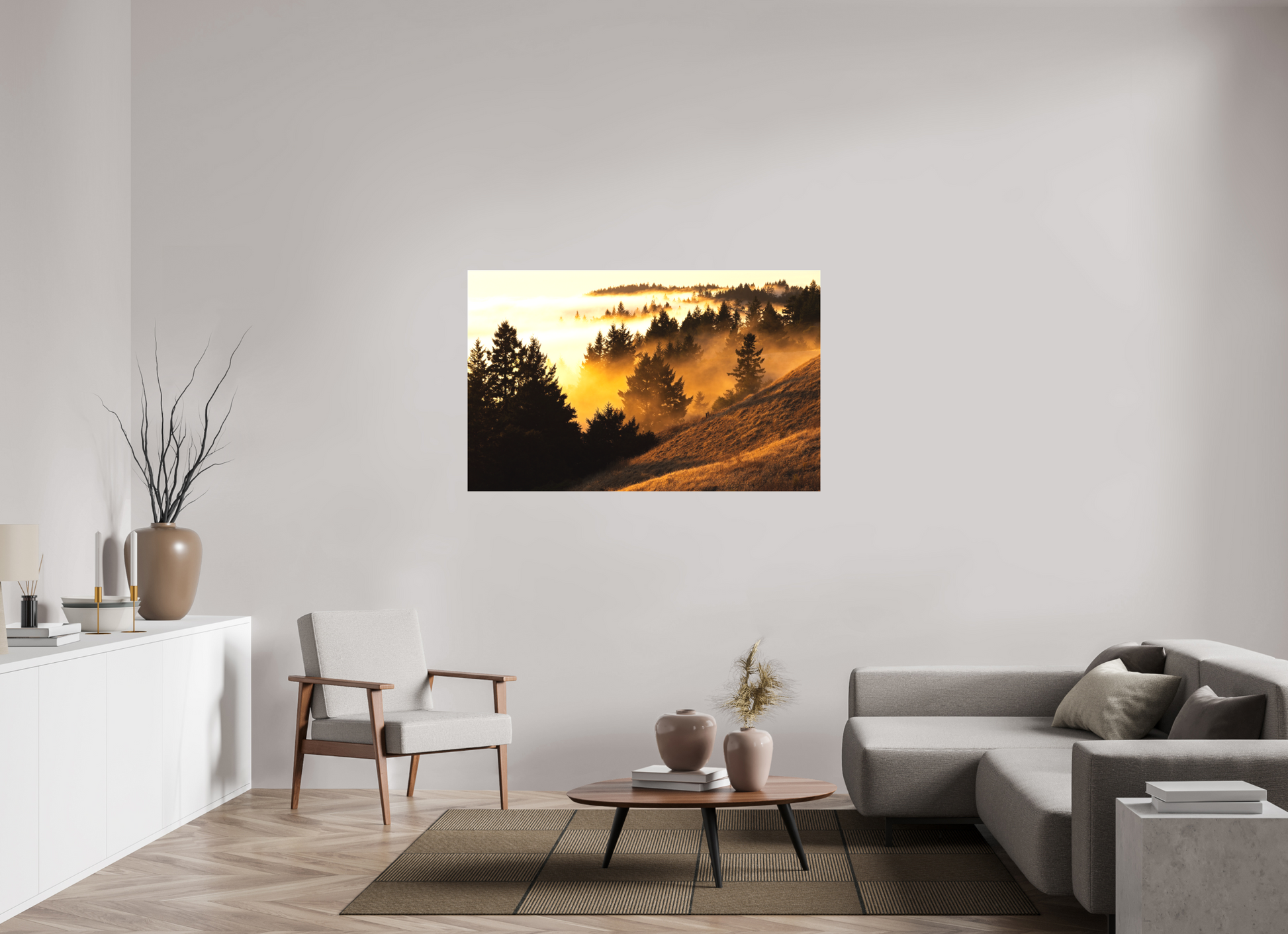 This fine art photograph captures that fleeting moment when the hills glow warm, the air turns to gold, and the coastal mist dances through the trees. A rare stillness, preserved.