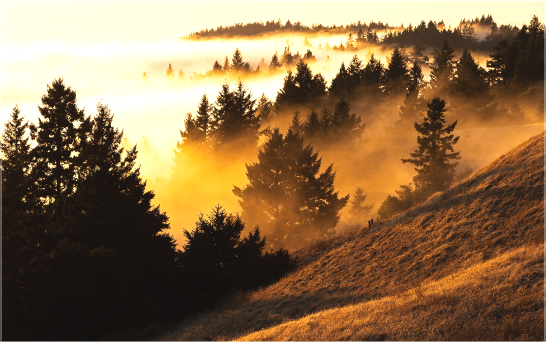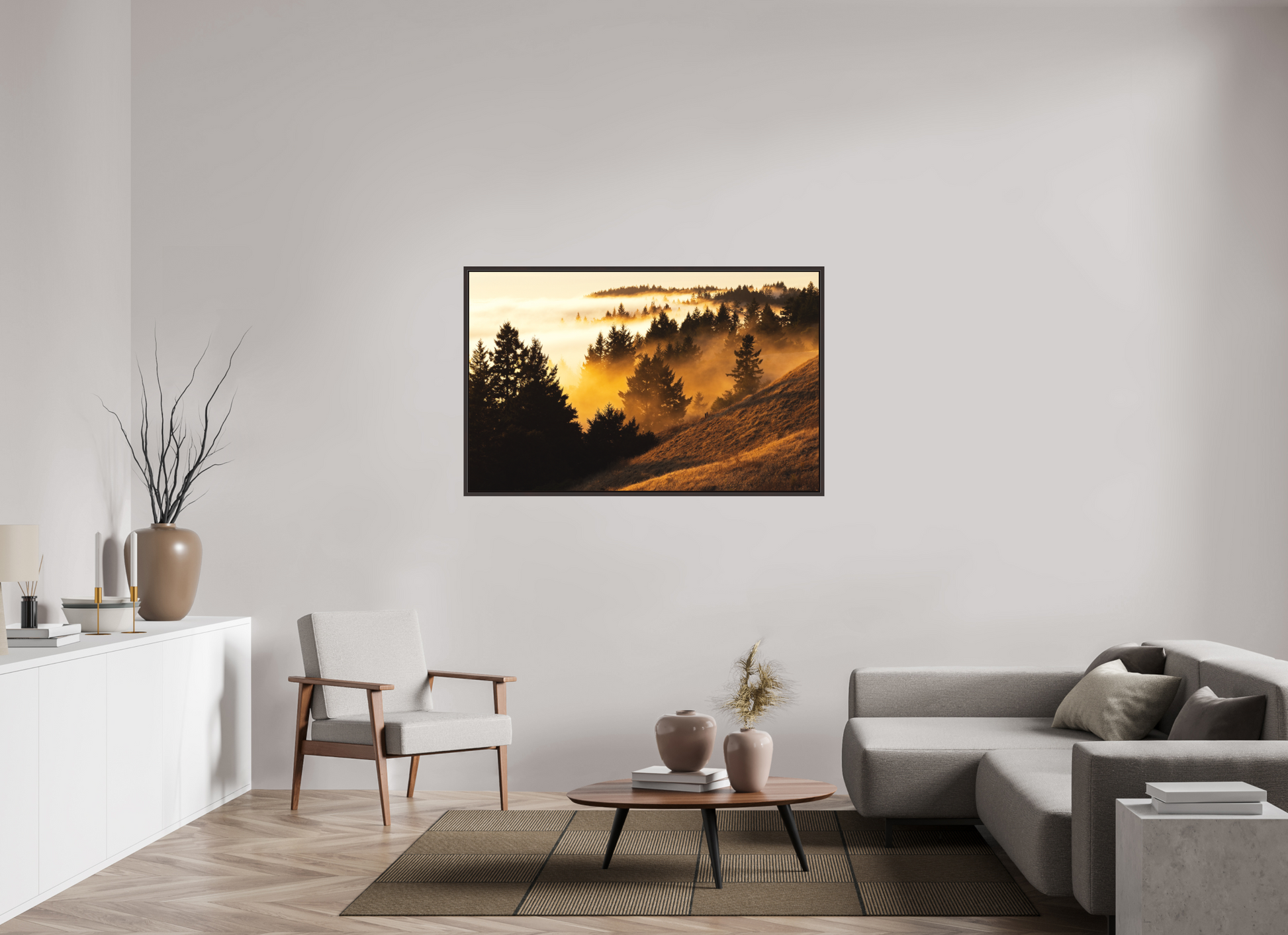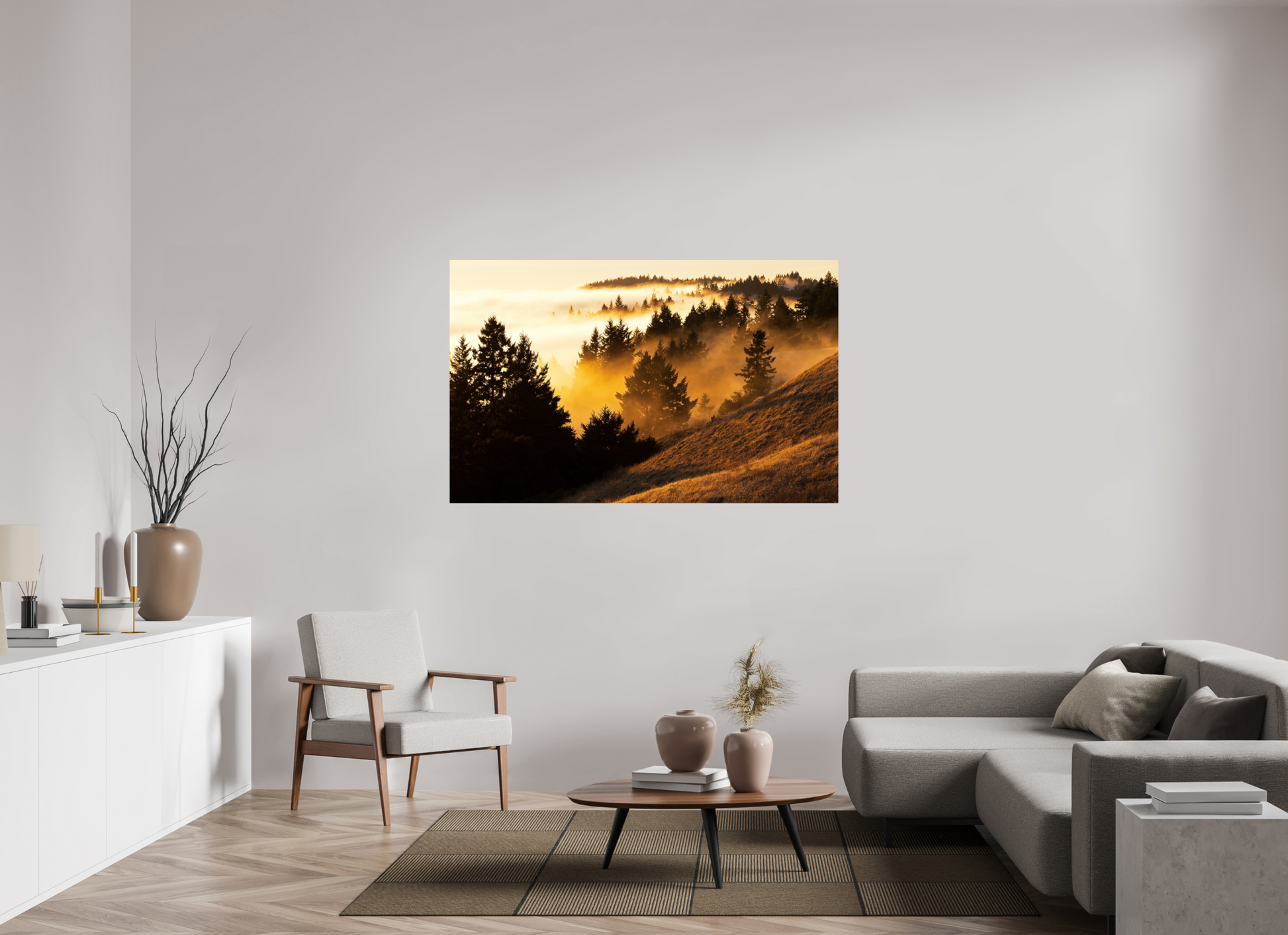 This fine art photograph captures that fleeting moment when the hills glow warm, the air turns to gold, and the coastal mist dances through the trees. A rare stillness, preserved.