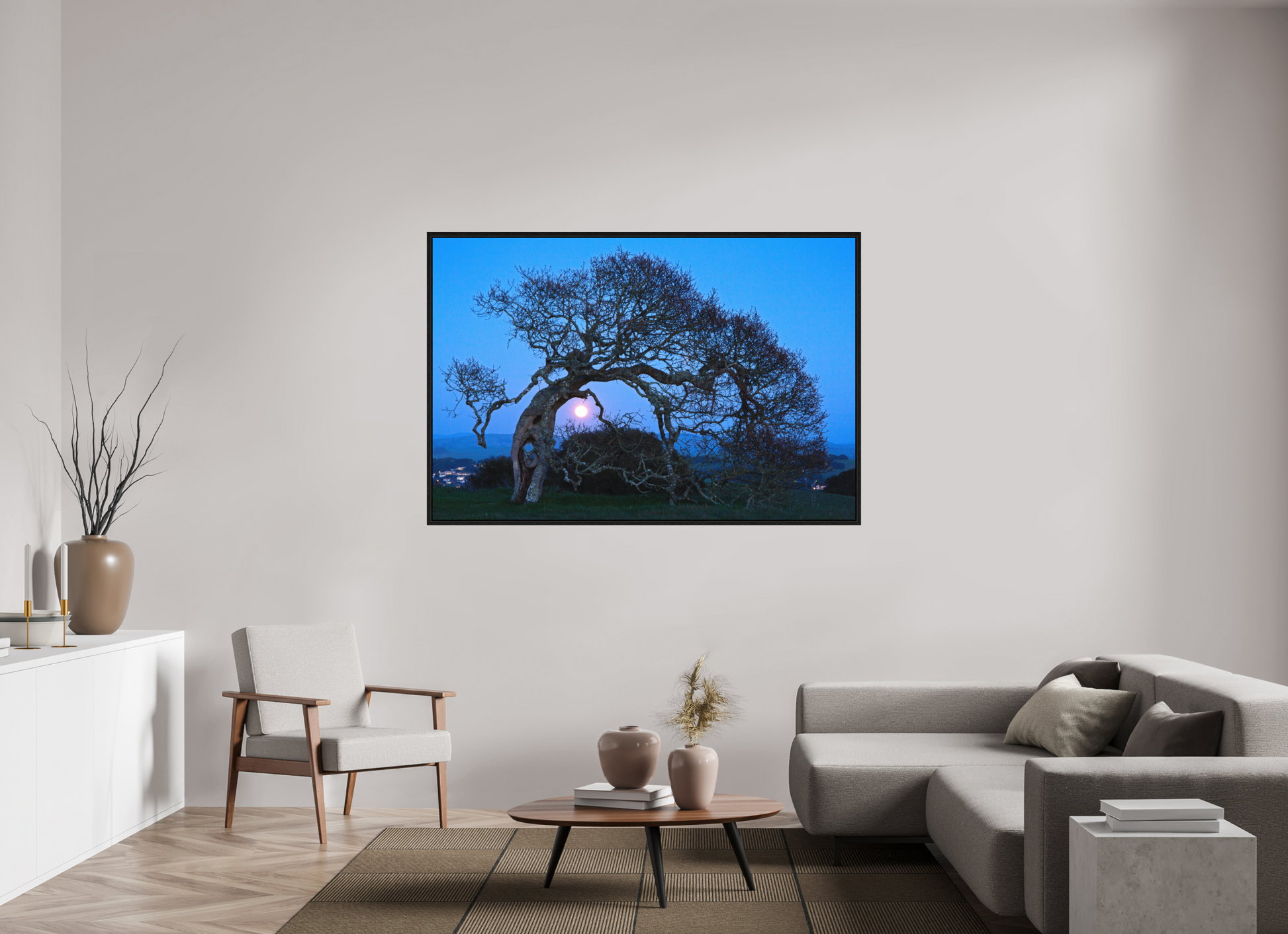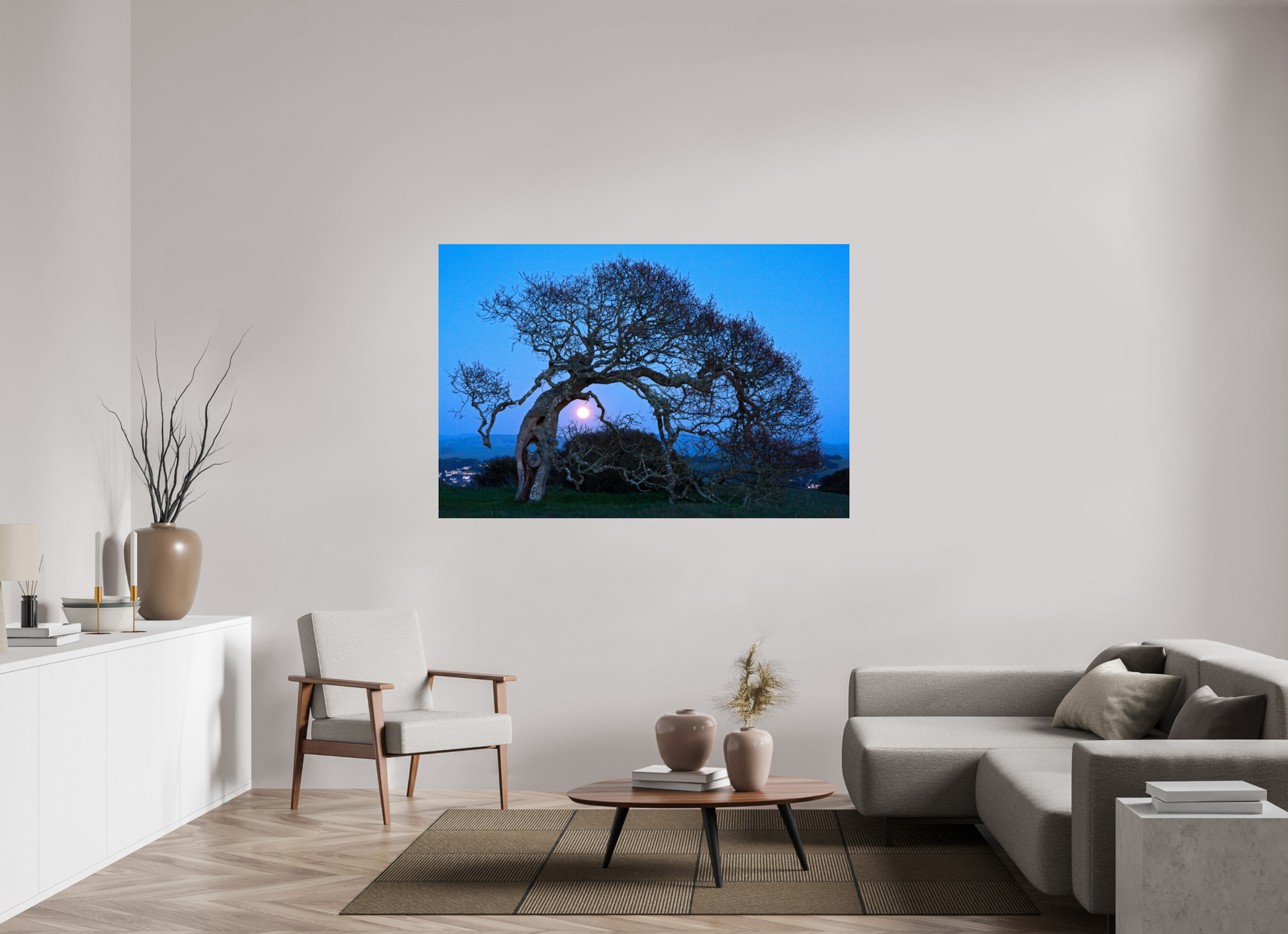 Own this fine art print and bring home a piece of the quiet truth—moonlight, an old tree, and the town below, caught in one breath of evening.