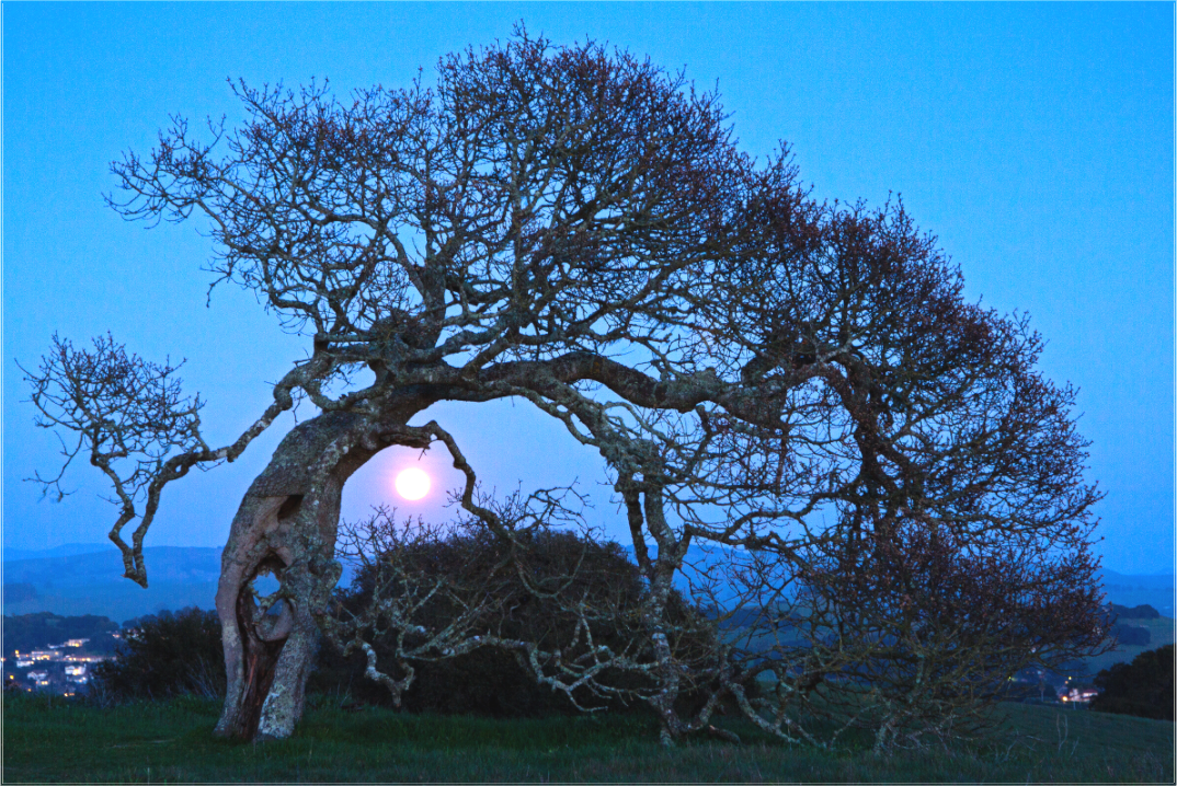 The tree stands alone in Helen Putnam Park, shaped by years of wind and time. The moon rises behind it, full and clear, caught in the curve of its branches like it was meant to be there. Below, the lights of Petaluma begin to glow, quiet and steady. This moment doesn’t shout. It doesn’t need to. It’s honest and still, the kind you don’t forget.