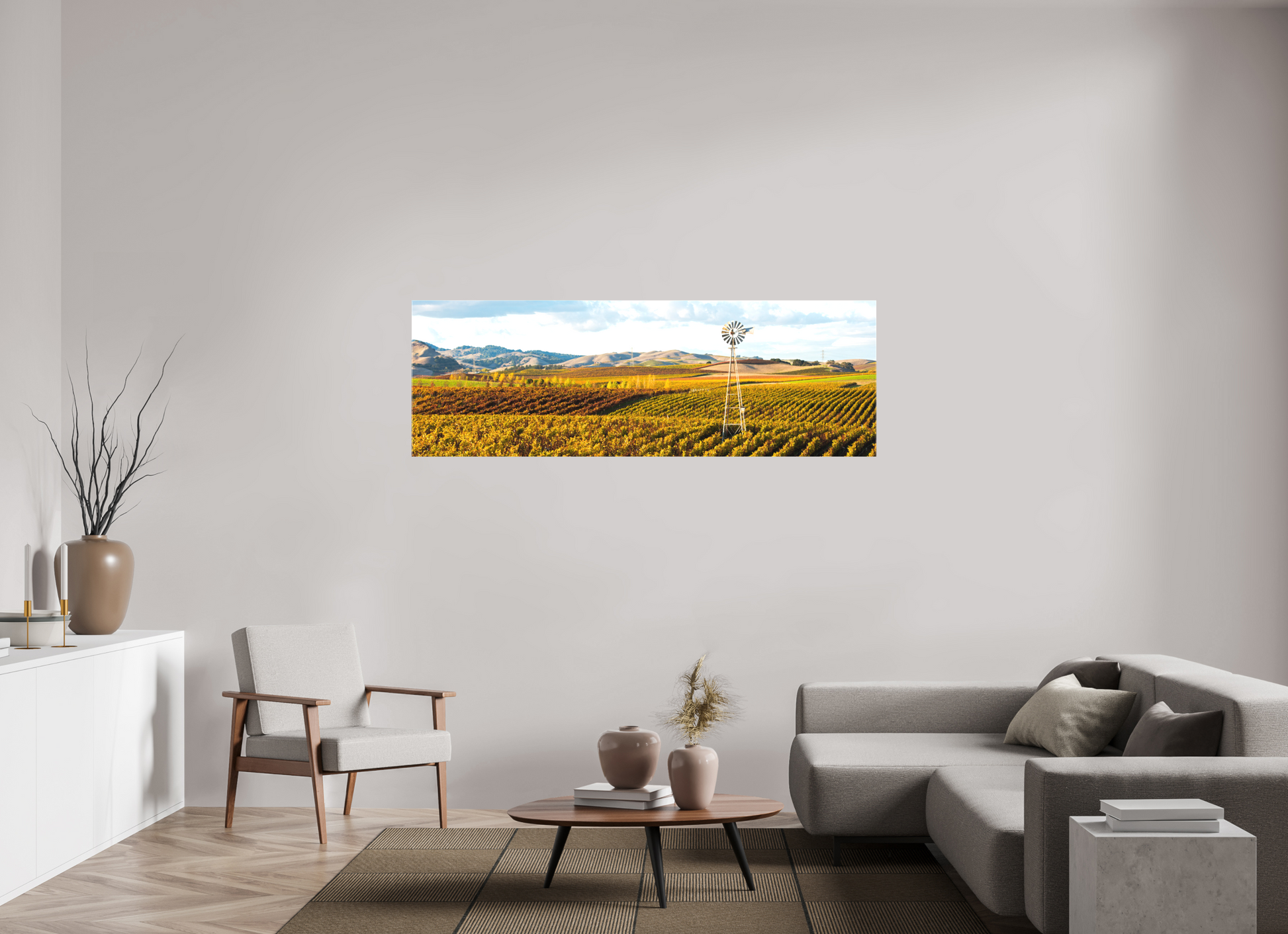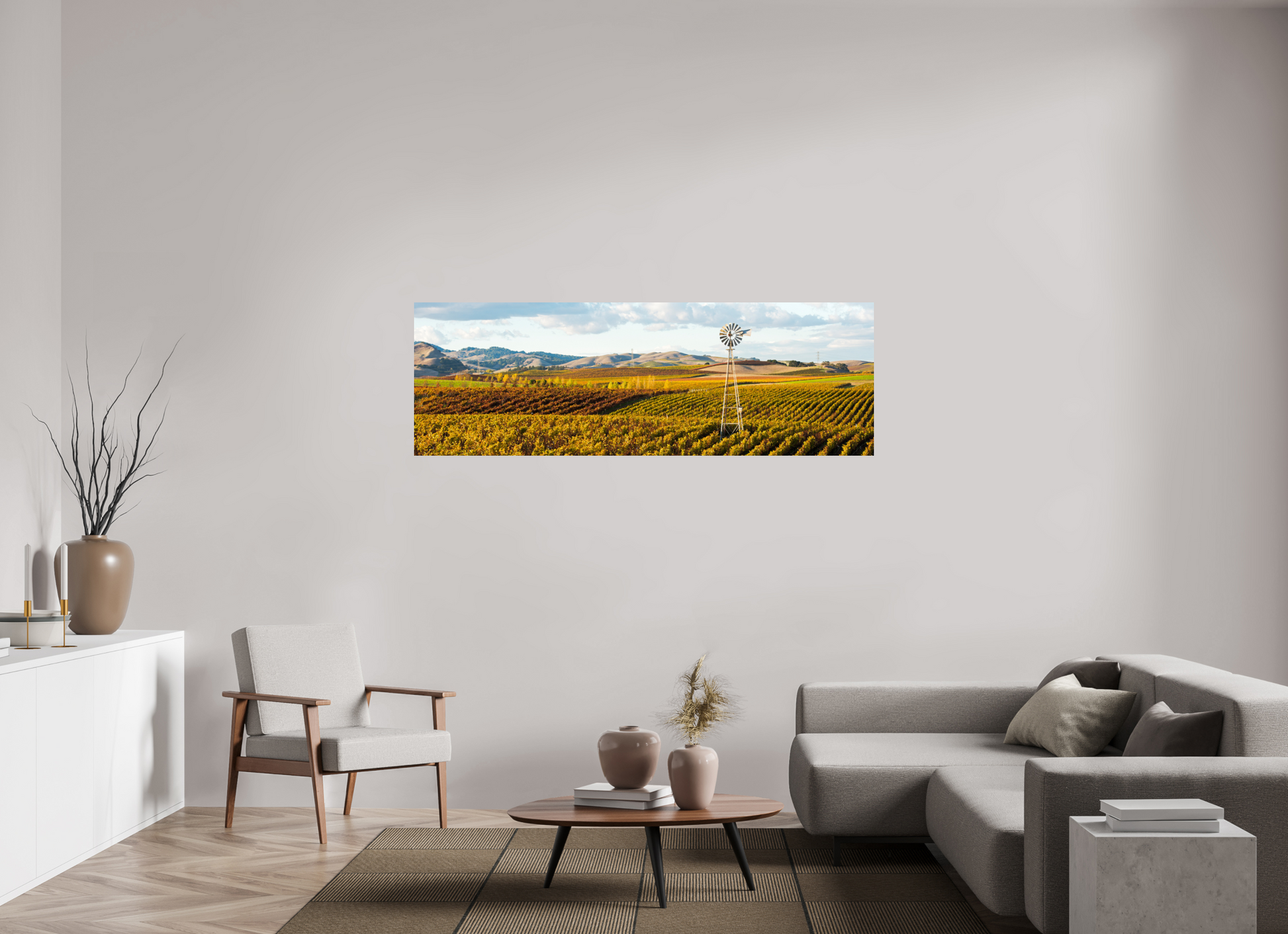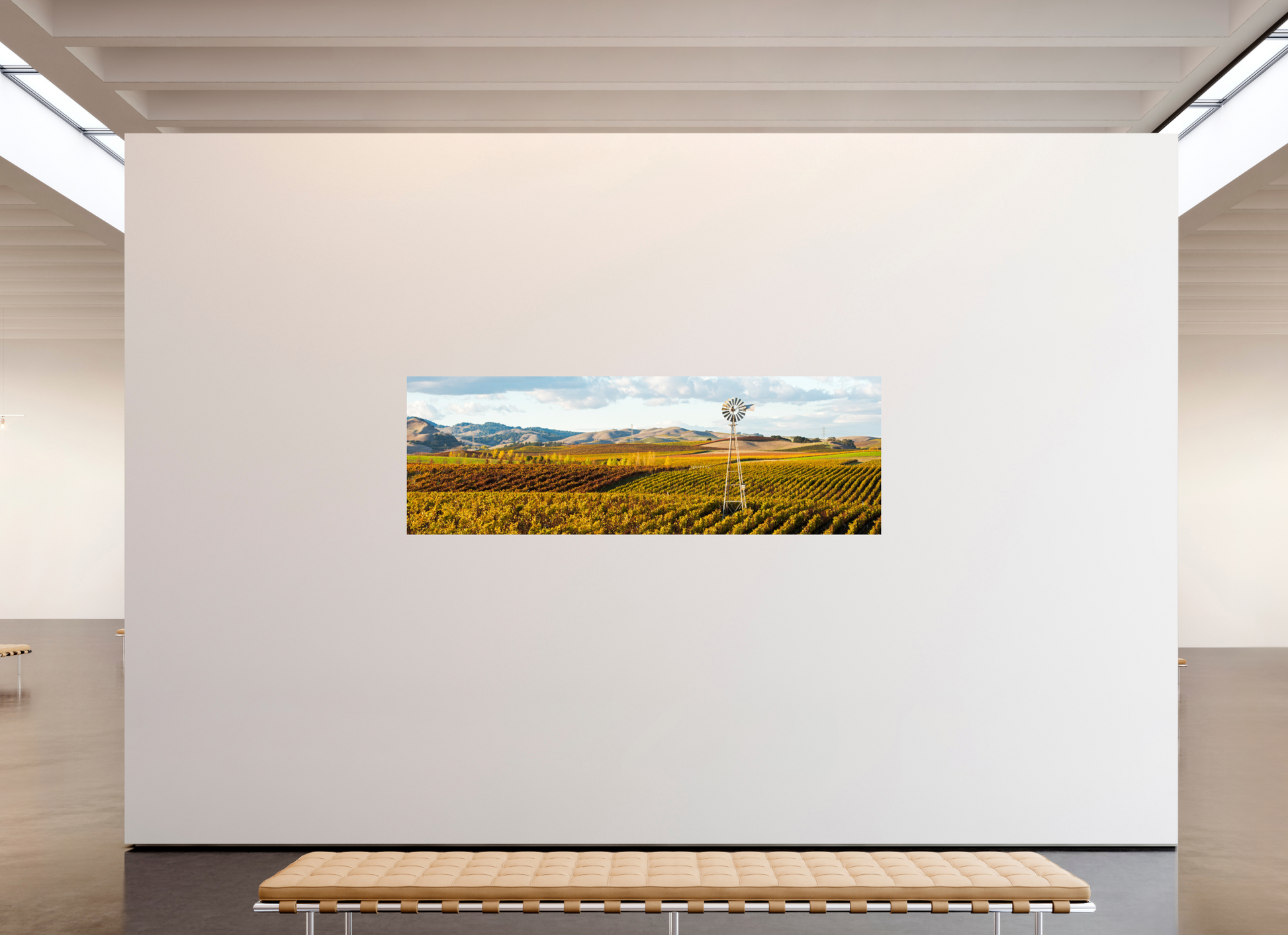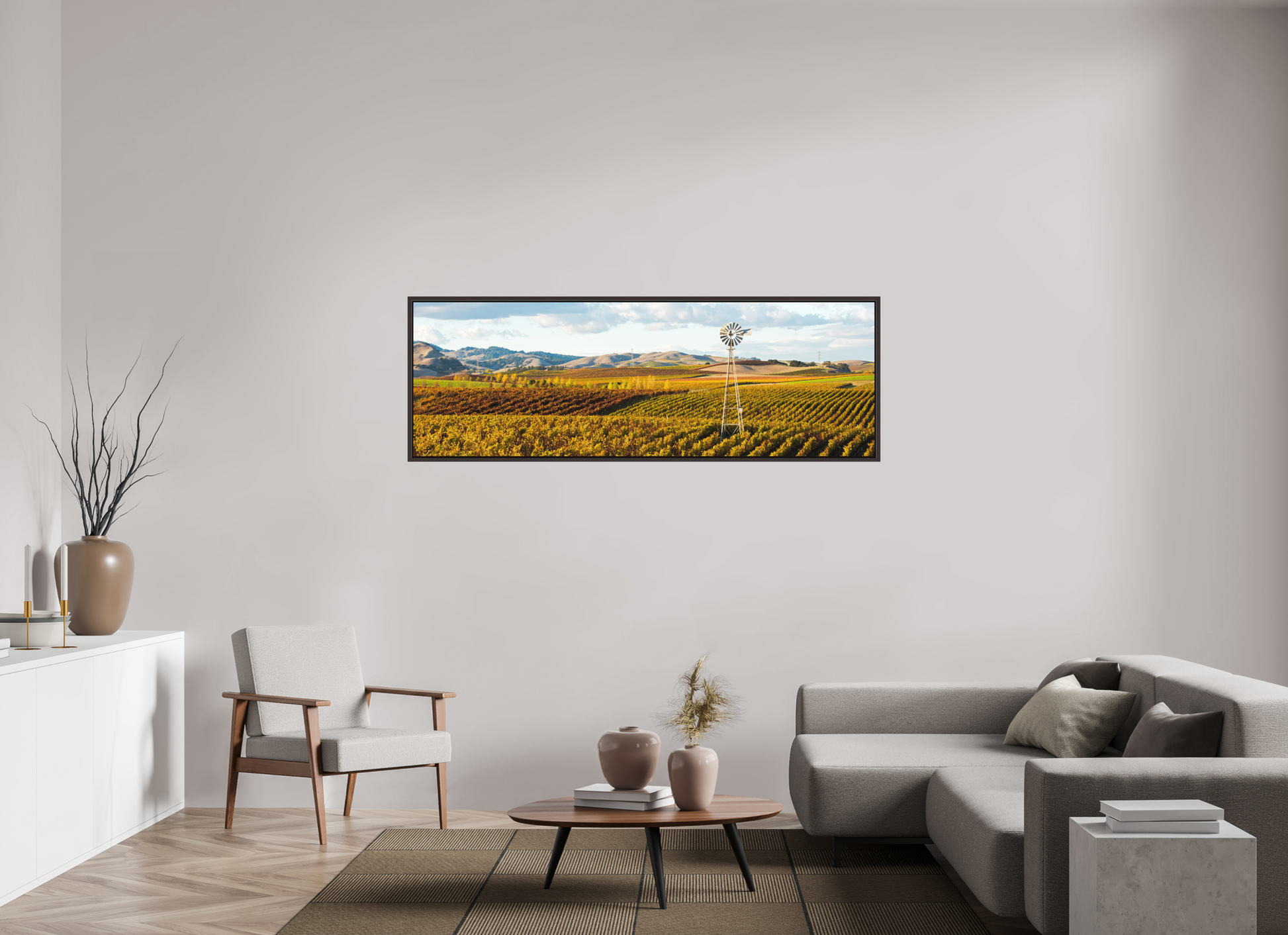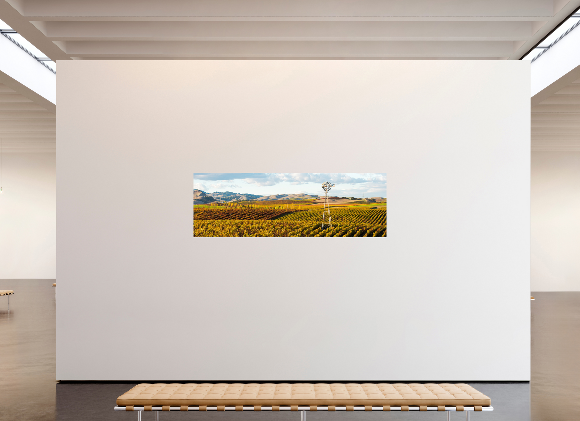 At the heart of the image stands a solitary windmill, weathered and elegant, its birdhouse so finely rendered you can count the bolts holding it together. This is more than a vineyard scene—it’s a study in stillness, texture, and timeless rural charm. Perfect for any space that calls for a touch of warmth and understated grandeur.