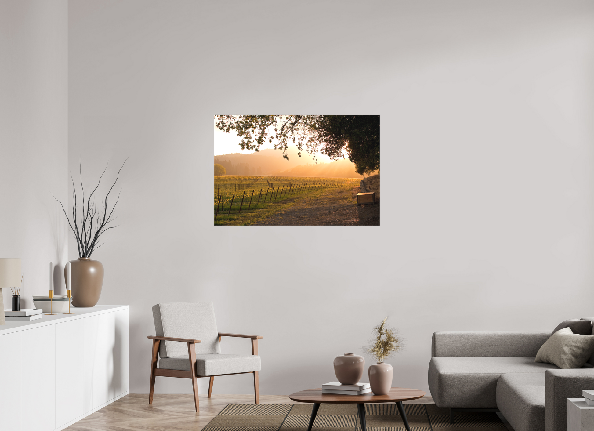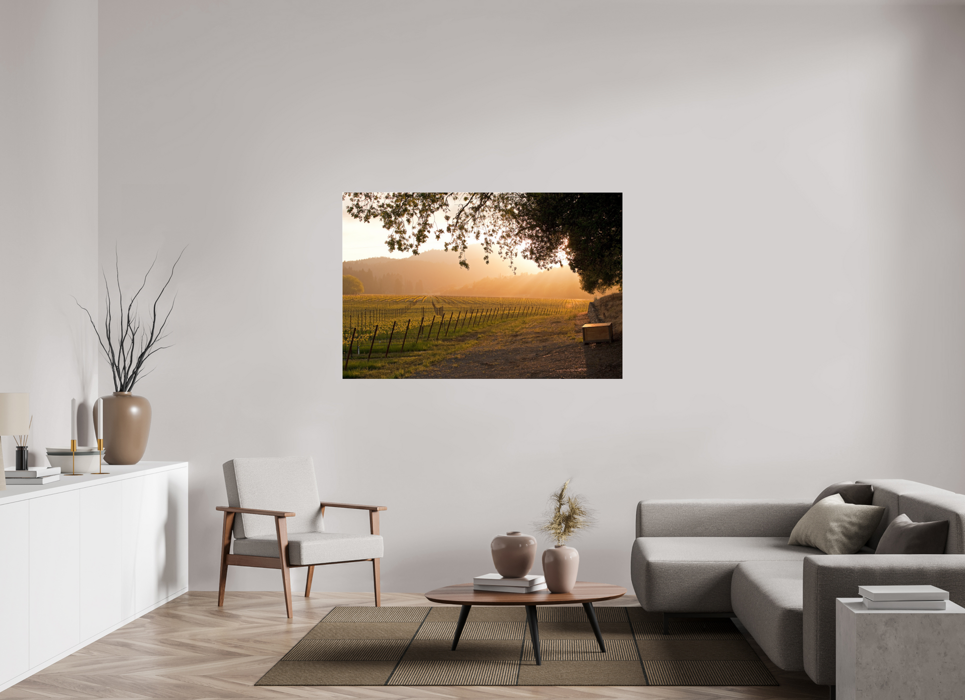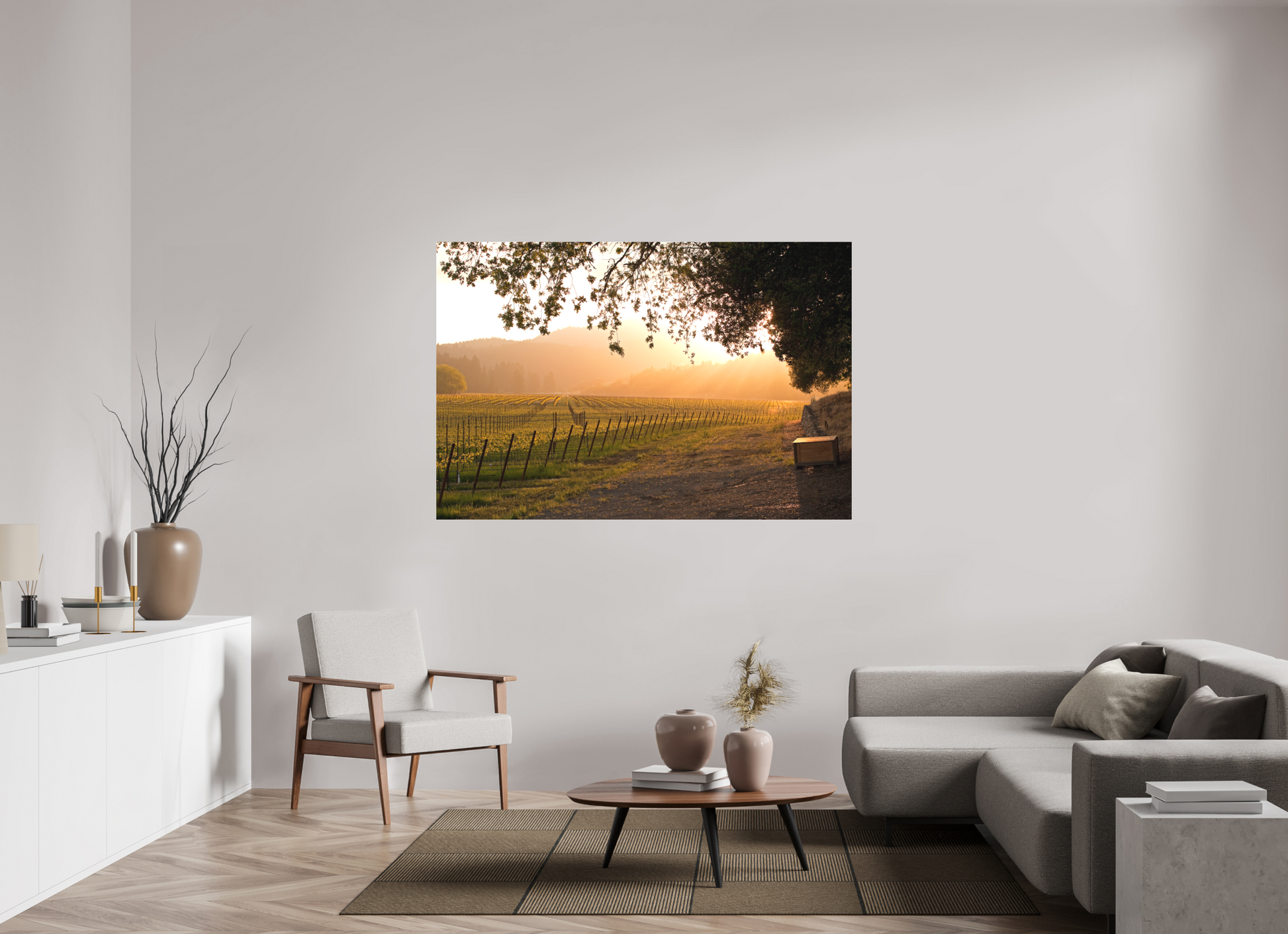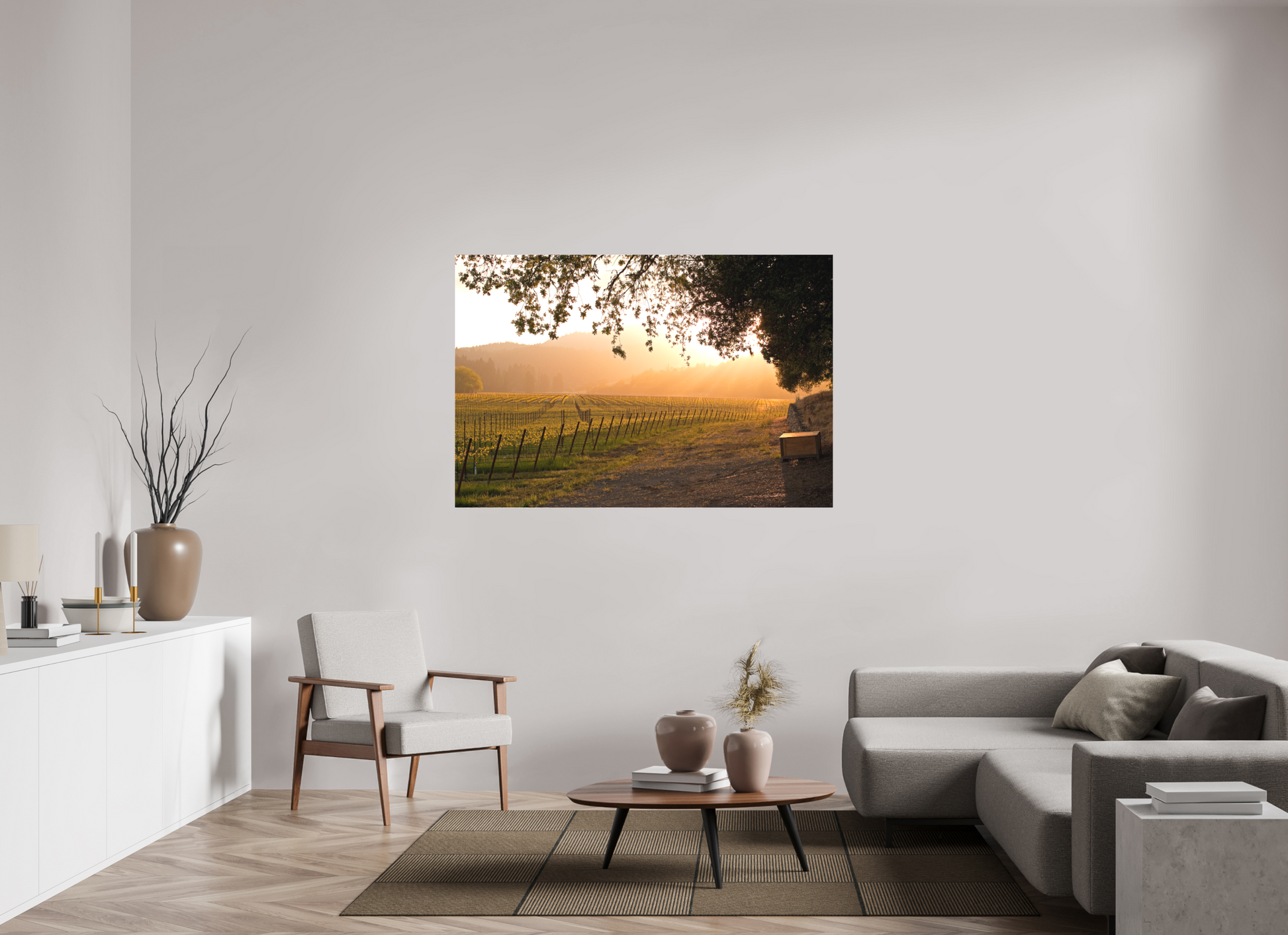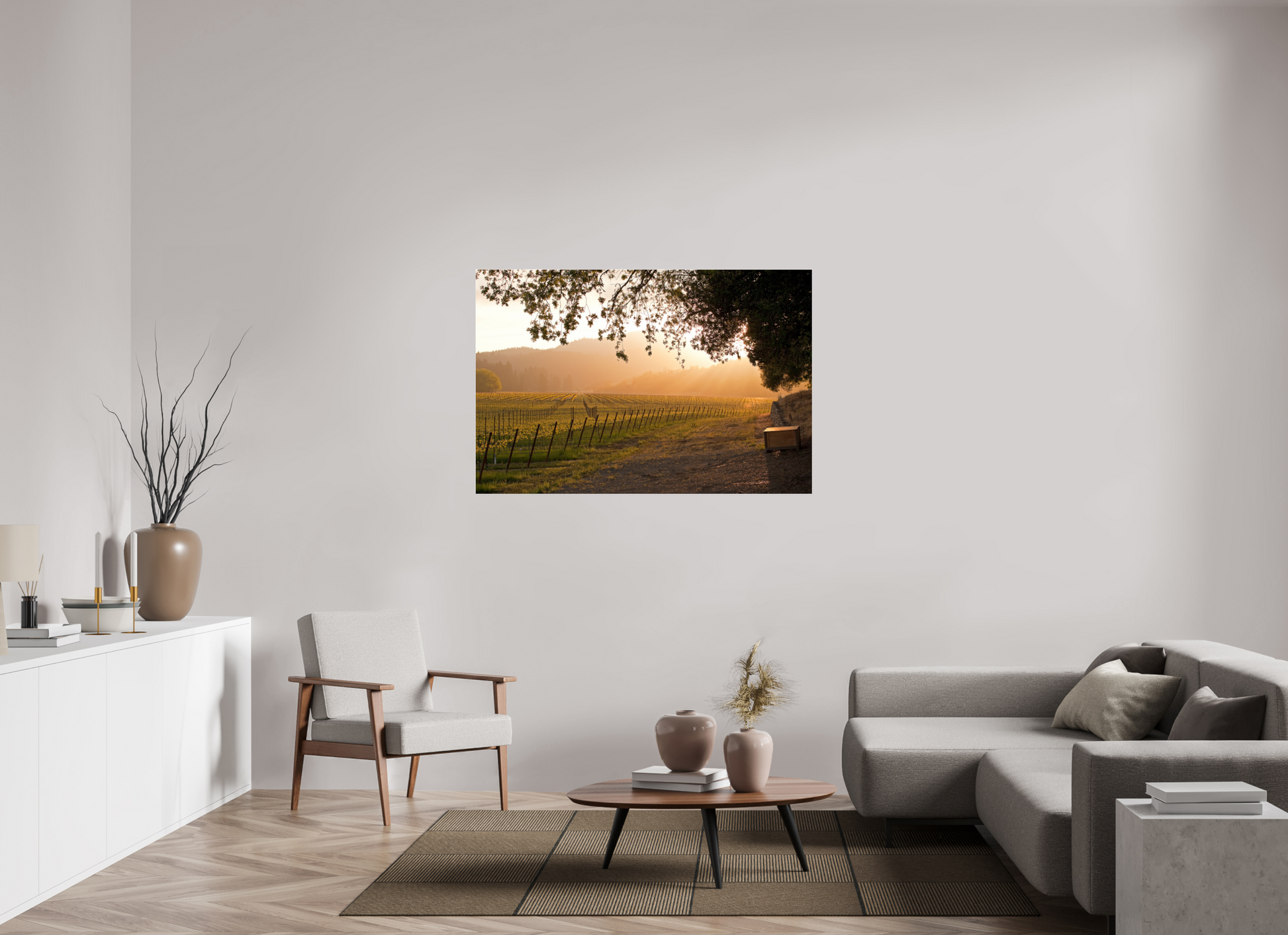 Invite the golden stillness of a late spring afternoon in the Russian River wine region into your home with this evocative fine art print. Bathed in soft, amber light, the vineyard stretches toward the horizon, its orderly rows framed by the shadow of ancient oaks and the silhouette of distant hills.