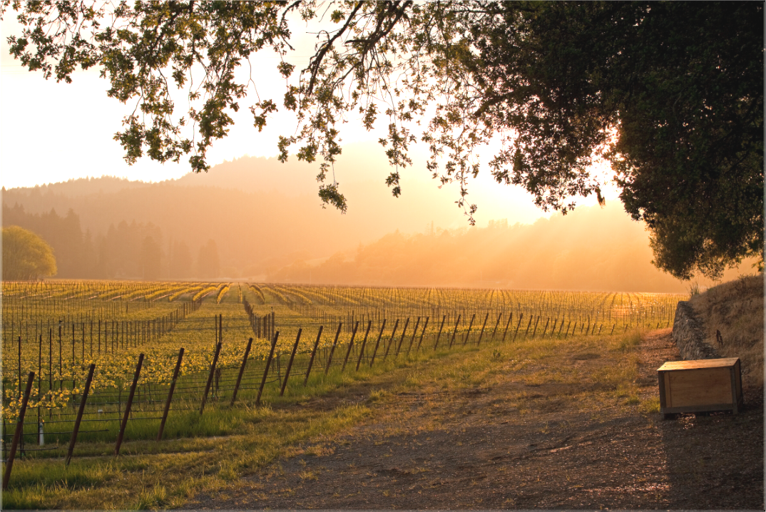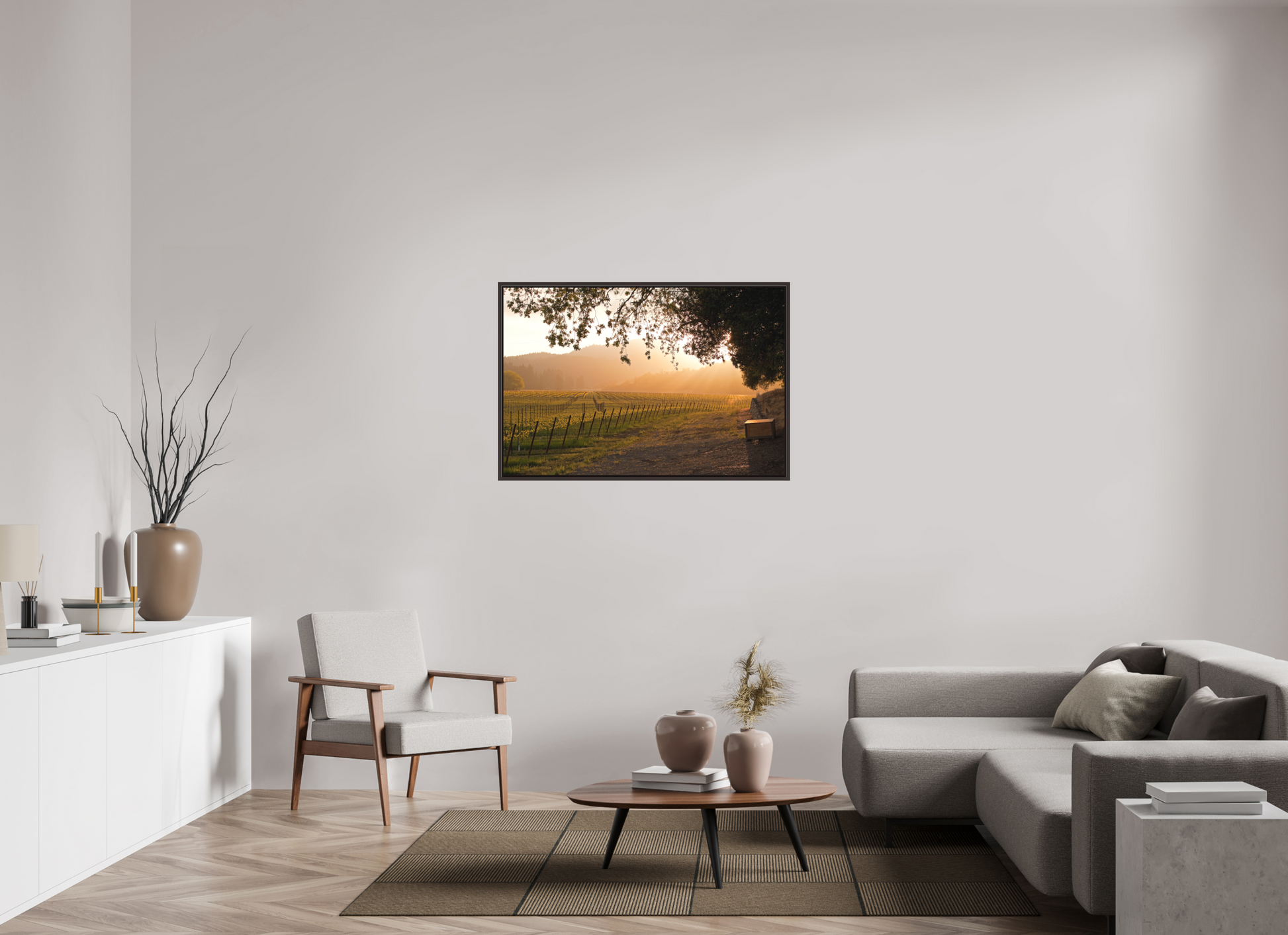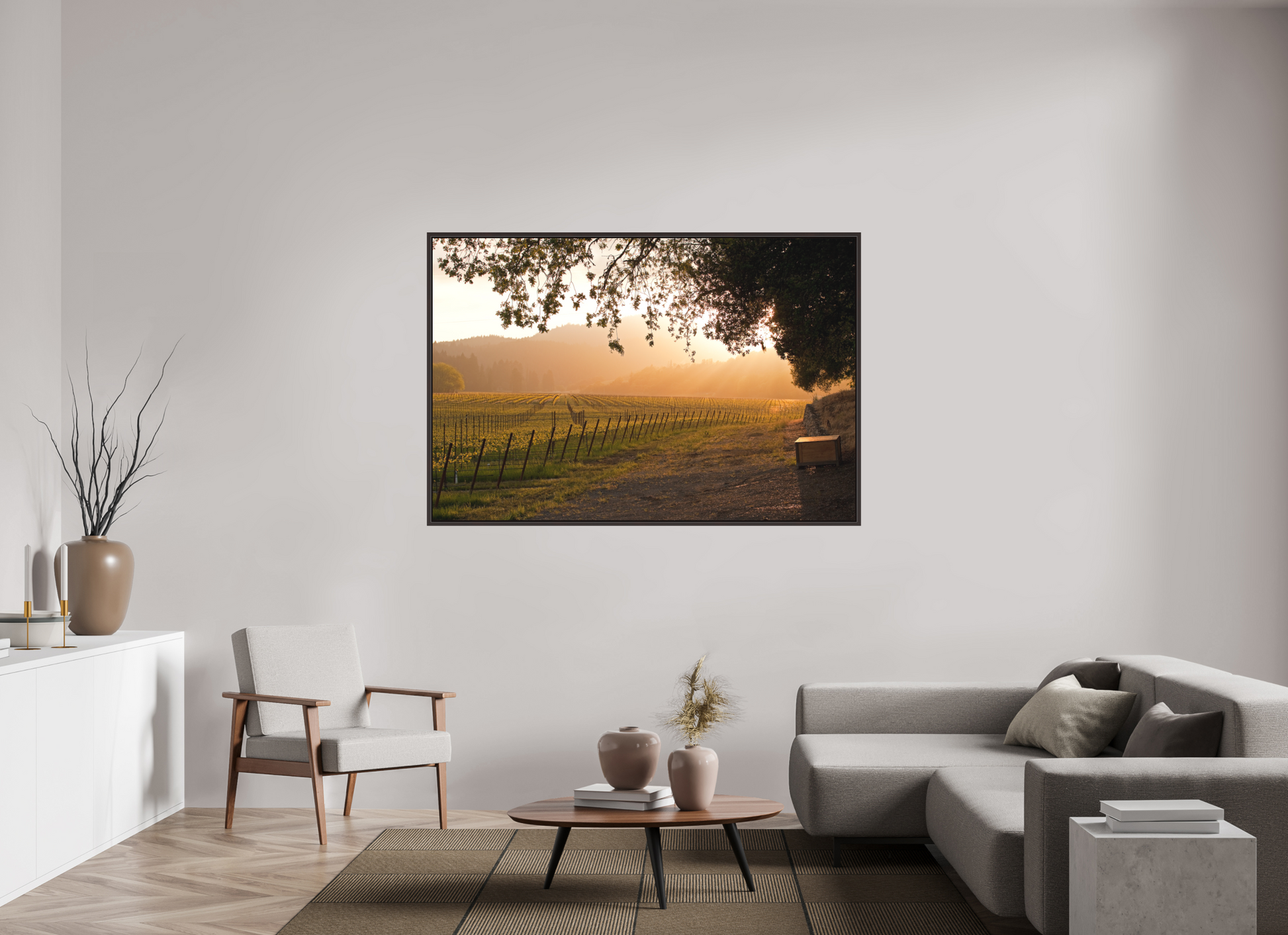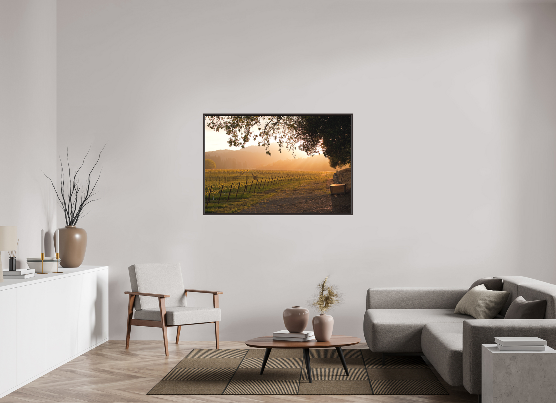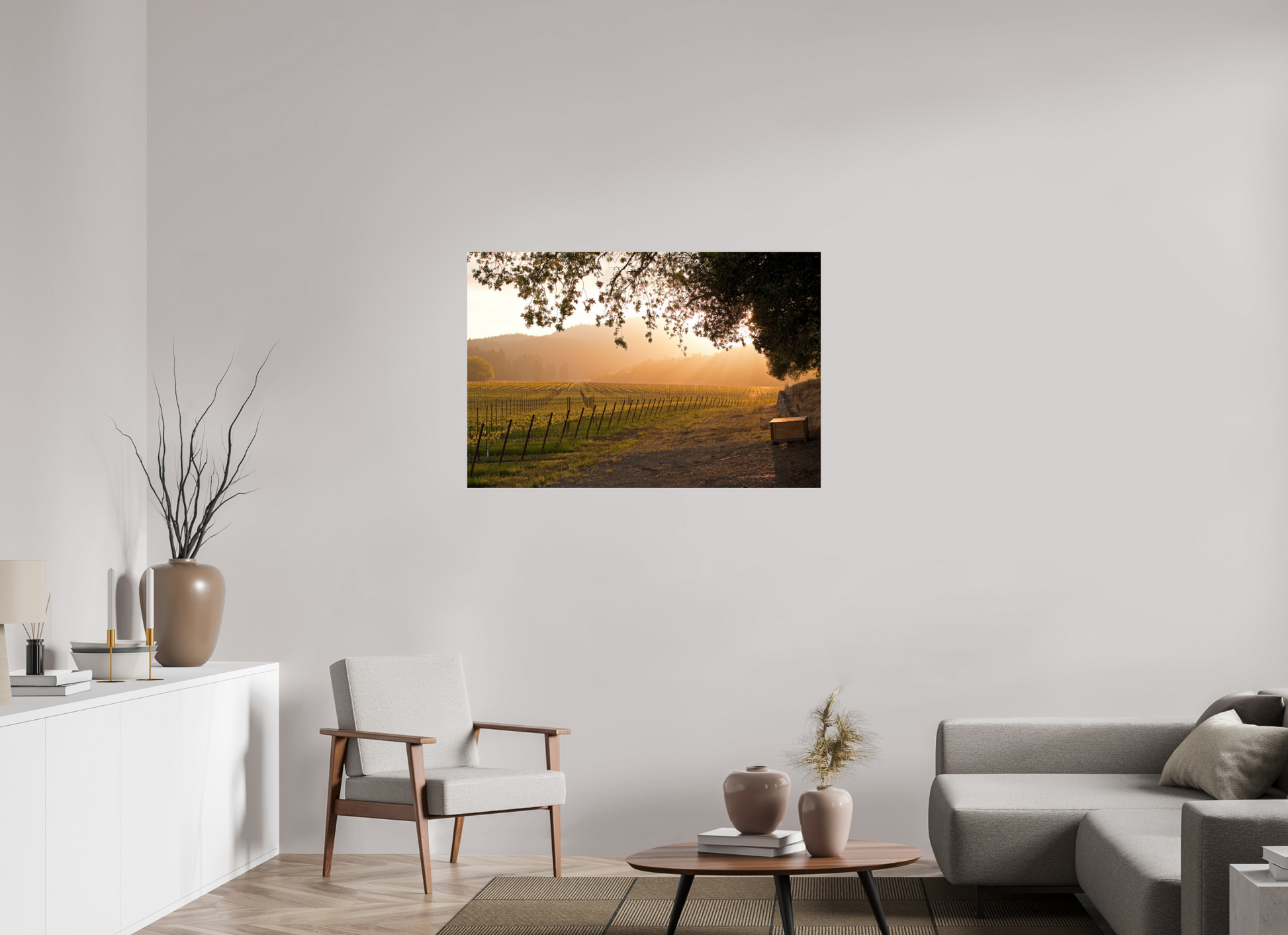 Invite the golden stillness of a late spring afternoon in the Russian River wine region into your home with this evocative fine art print. Bathed in soft, amber light, the vineyard stretches toward the horizon, its orderly rows framed by the shadow of ancient oaks and the silhouette of distant hills.