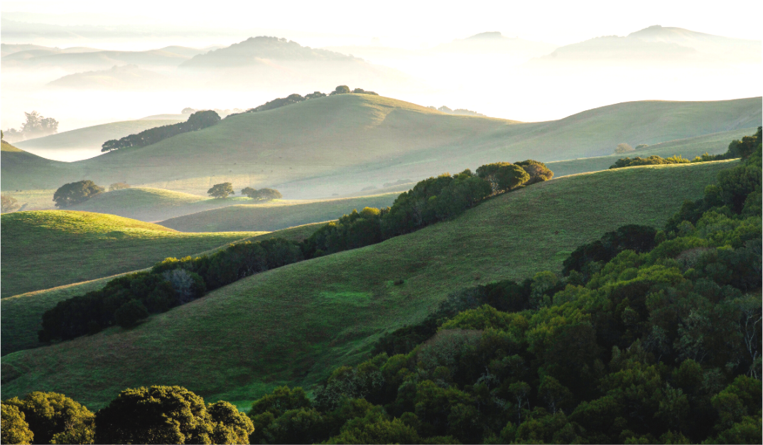 Soft green slopes roll toward the horizon, bathed in the low, golden light of daybreak, while a gentle mist lingers in the valleys like a fading dream. Trees gather in quiet clusters, anchoring the open landscape with rich textures and deep shadows.