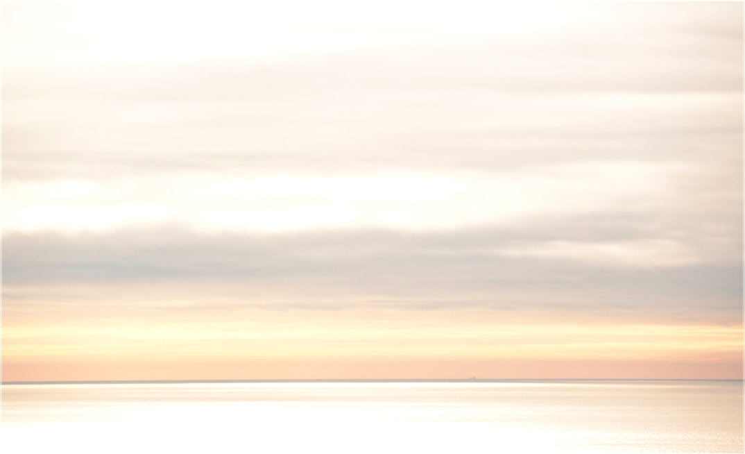 A soft veil of clouds stretches across the sky, and the sea shimmers below in muted tones of silver and gold. Far on the horizon, almost lost to the scale of it all, a solitary container ship drifts — a small but certain reminder of the enormity of the world beyond.