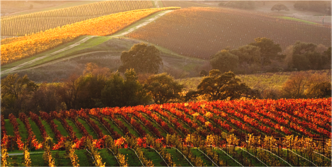 The sun hung low over the Carneros wine region, casting a golden hush across the land. Vines stretched in perfect rows of deep red and burnished gold, draping the hills like brushstrokes from a master’s hand. The earth, still damp from a recent rain, breathed green between the rows—alive, grounded, and full of promise.