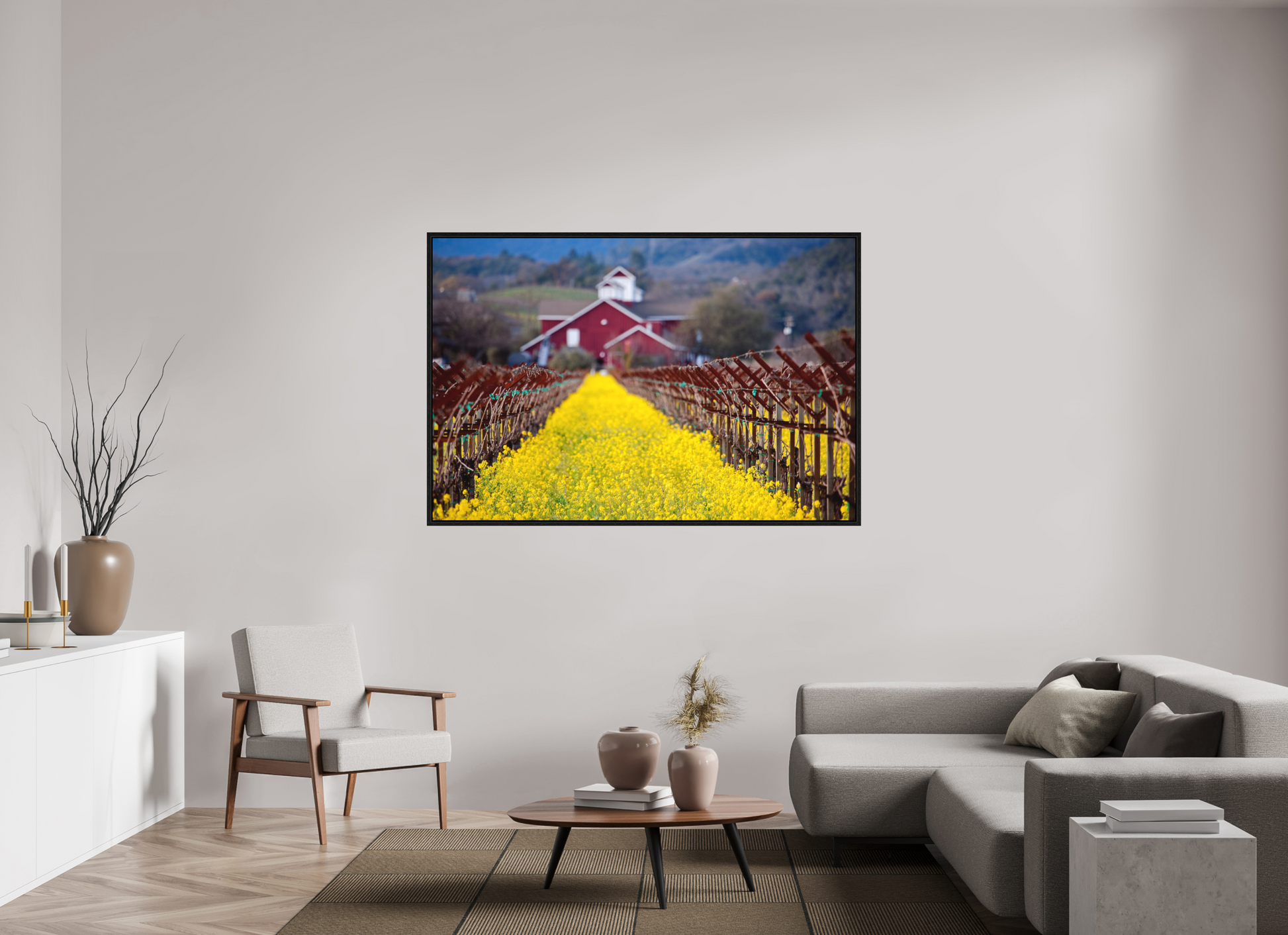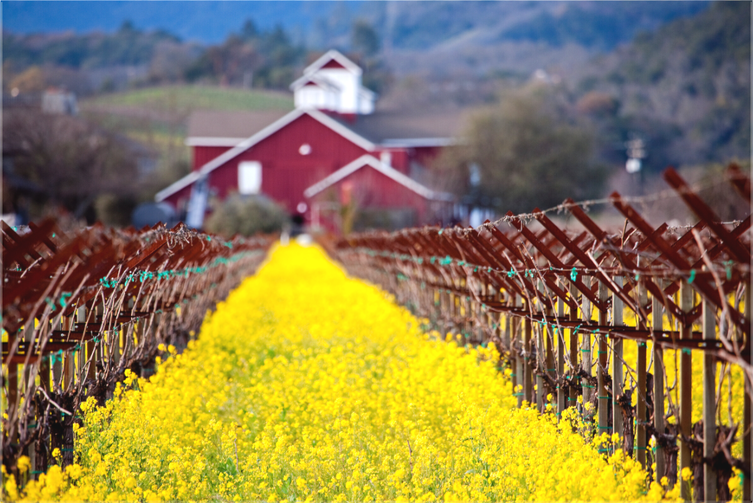 Winter in the Napa Valley brings a quiet kind of beauty—bare vines standing in perfect rows, their structure revealed. Between them, a river of mustard blooms rises bright and defiant, glowing yellow beneath the soft winter light.