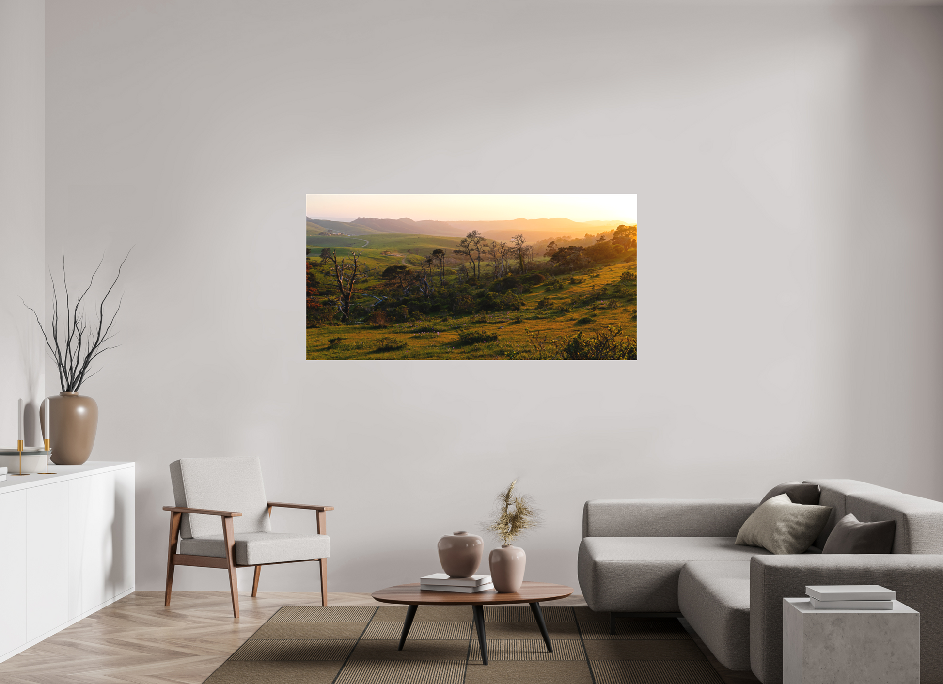 The warm evening light spills across the hills, casting long shadows and turning the grasses gold. Weathered trees rise from the landscape like silhouettes from another time, standing among fresh spring growth and scattered wildflowers. A winding path draws your eye through layers of rolling terrain, inviting you into the scene’s depth and calm.