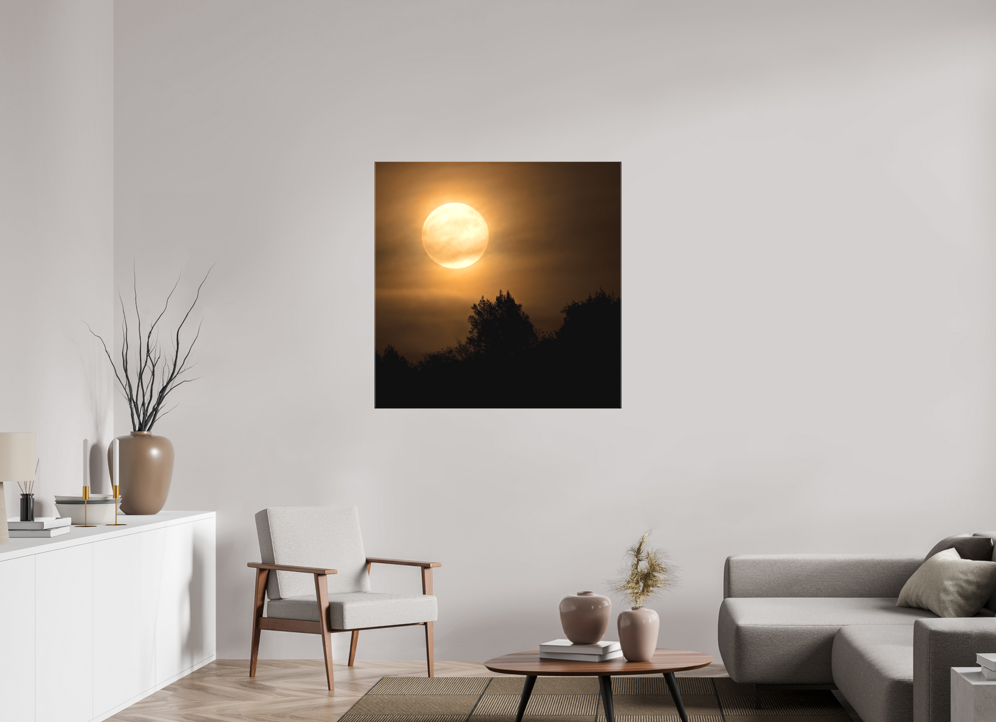 Printed on glossy metal, this image takes on an almost three-dimensional quality — the moon’s glow deepens, the shadows grow richer, and the scene feels alive with atmosphere.