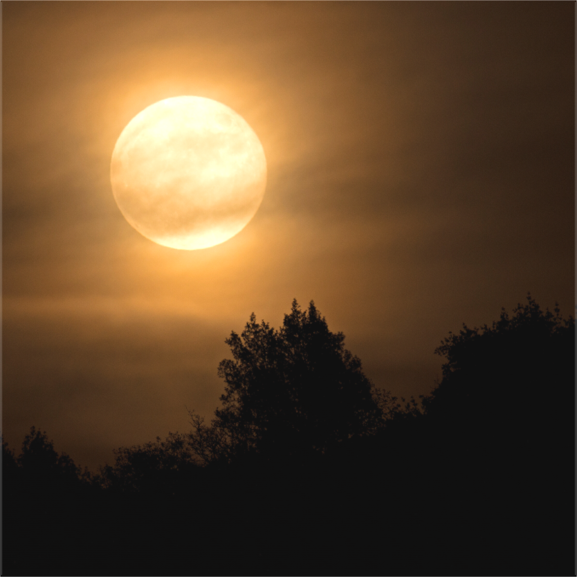 Capture the quiet power of a fall evening with this fine art photograph, taken near the hills east of Santa Rosa, California. The full moon rises heavy and luminous through thin clouds, casting a soft glow over the silhouetted trees below.
