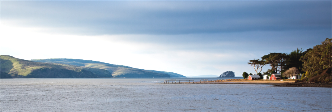 This fine art photograph captures a quiet, luminous moment along Tomales Bay in the small coastal town of Marshall. Soft light breaks through a moody sky, illuminating the red and white buildings and scattered cypress trees on the shoreline. Across the water, green hills roll gently into the mist with Hog Island in the background—timeless, serene, and still.